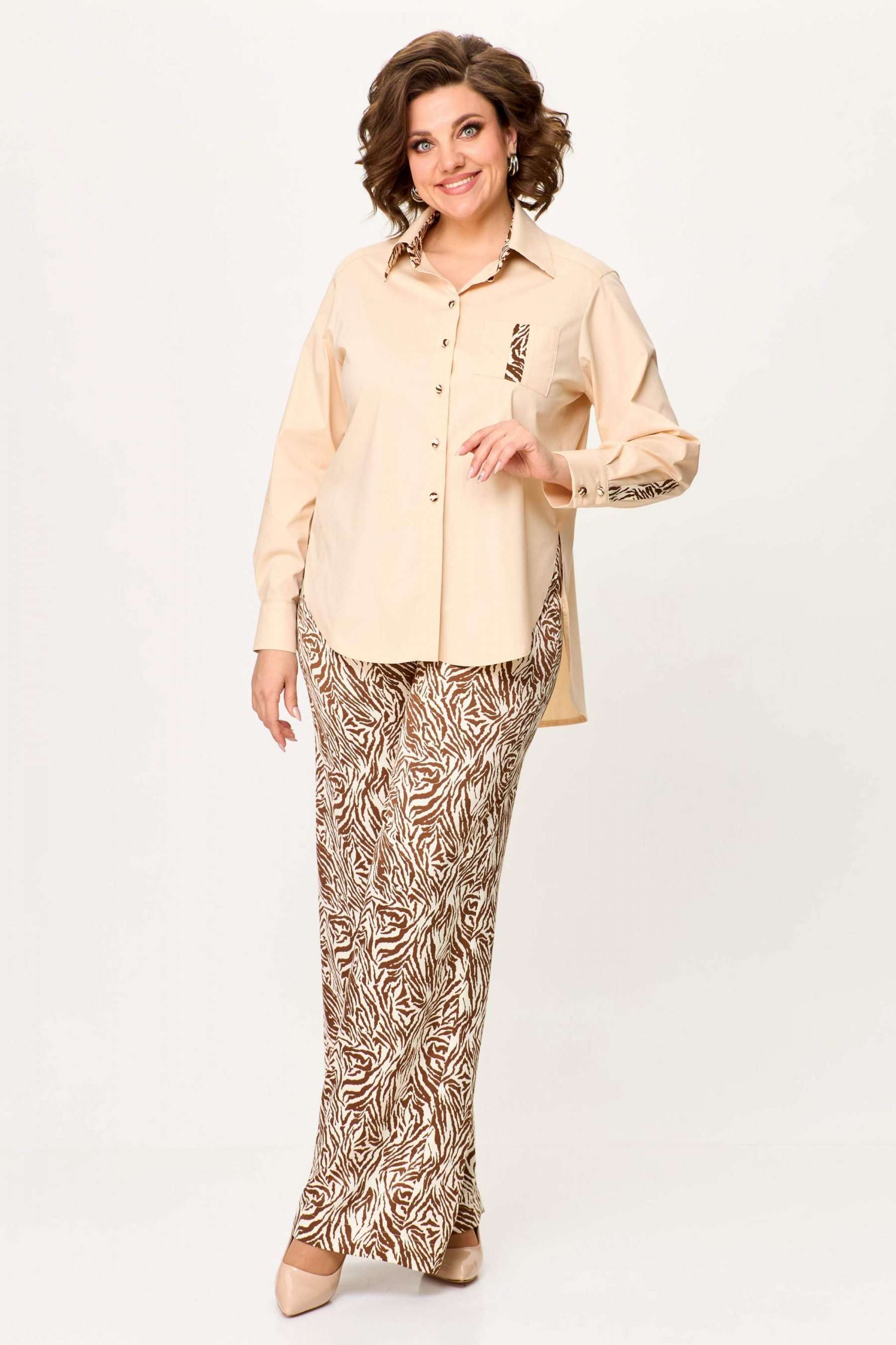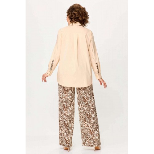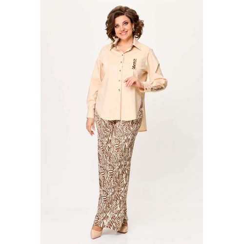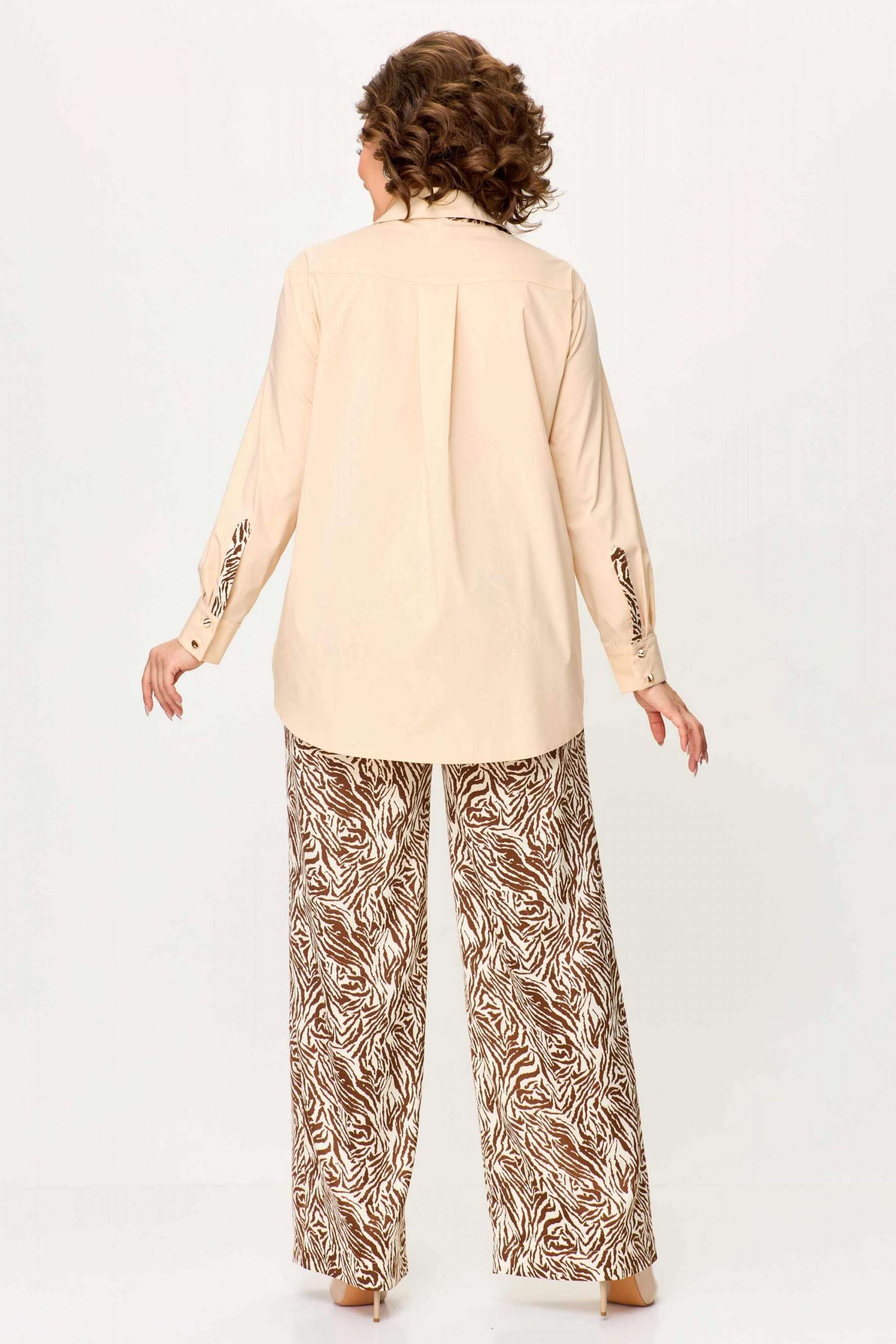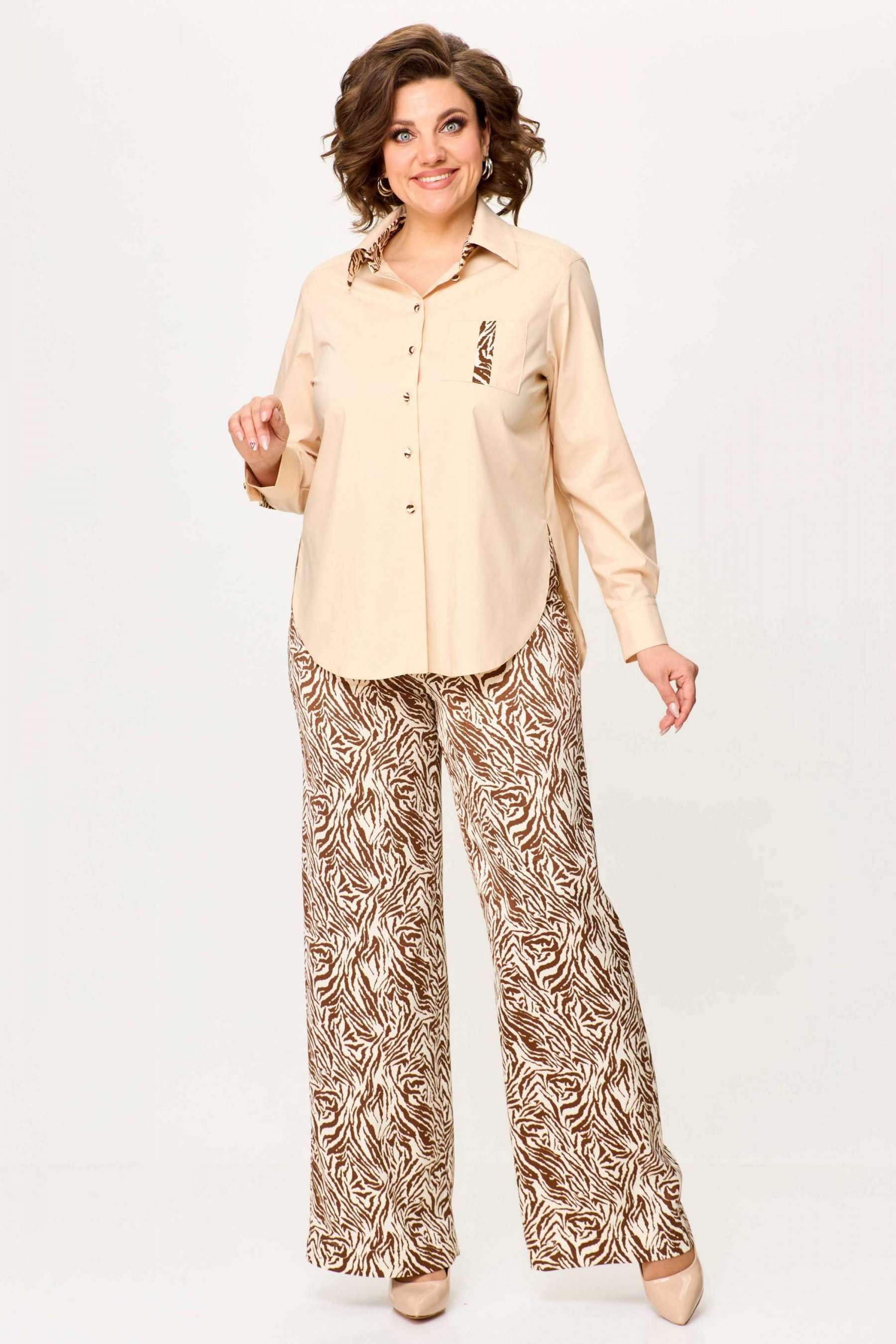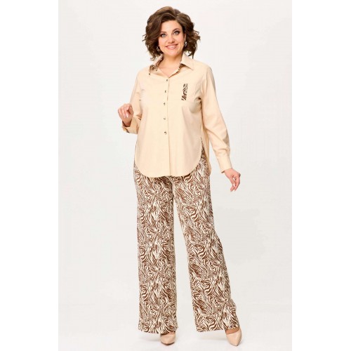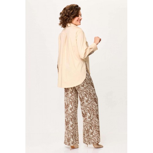 Стильный женский комплект выполнен из рубашки и брюк. Рубашка выполнена из хлопка с содержанием эластана. Рубашка свободного силуэта с застежкой на петли м декоративные пуговицы. С левой стороны на уровне груди накладной карман с отделкой. Горловина с рубашечным воротником на стойке, нижняя стойка и воротник из отделочной ткани. Рукава длинные с притачным манжетом и шлицей, шлица из отделочной ткани. Брюки из струящейся ткани с принтом «зебра», расширенные от линии бедер. Верх брюк на резинке. Длина рубашки – 76 см. Длина рукава – 58 см. Длина брюк – 113 см.
