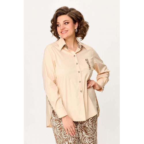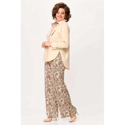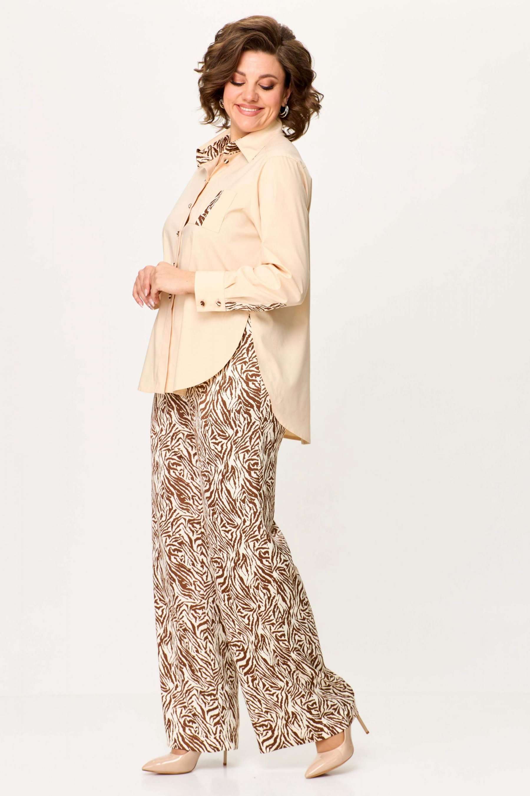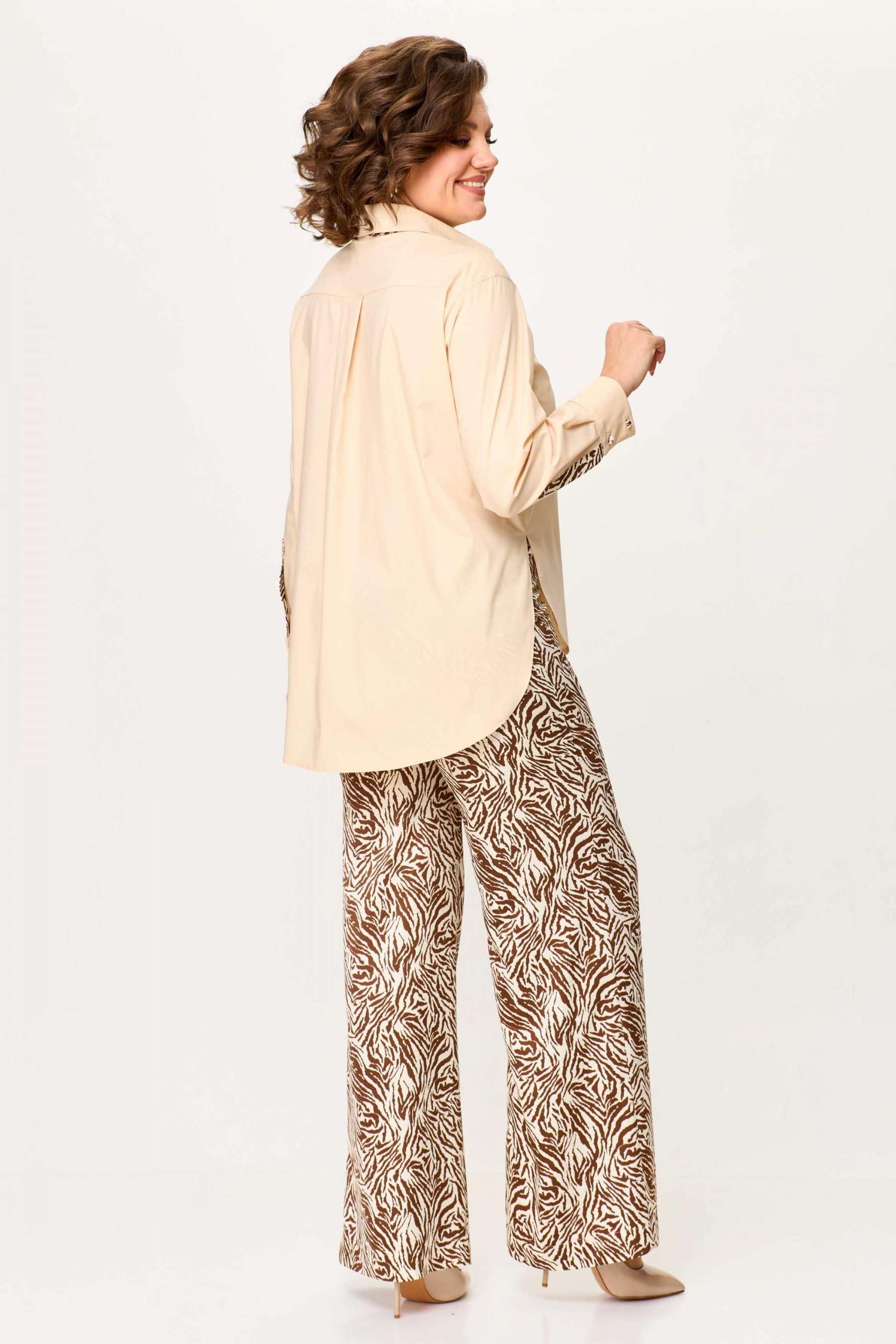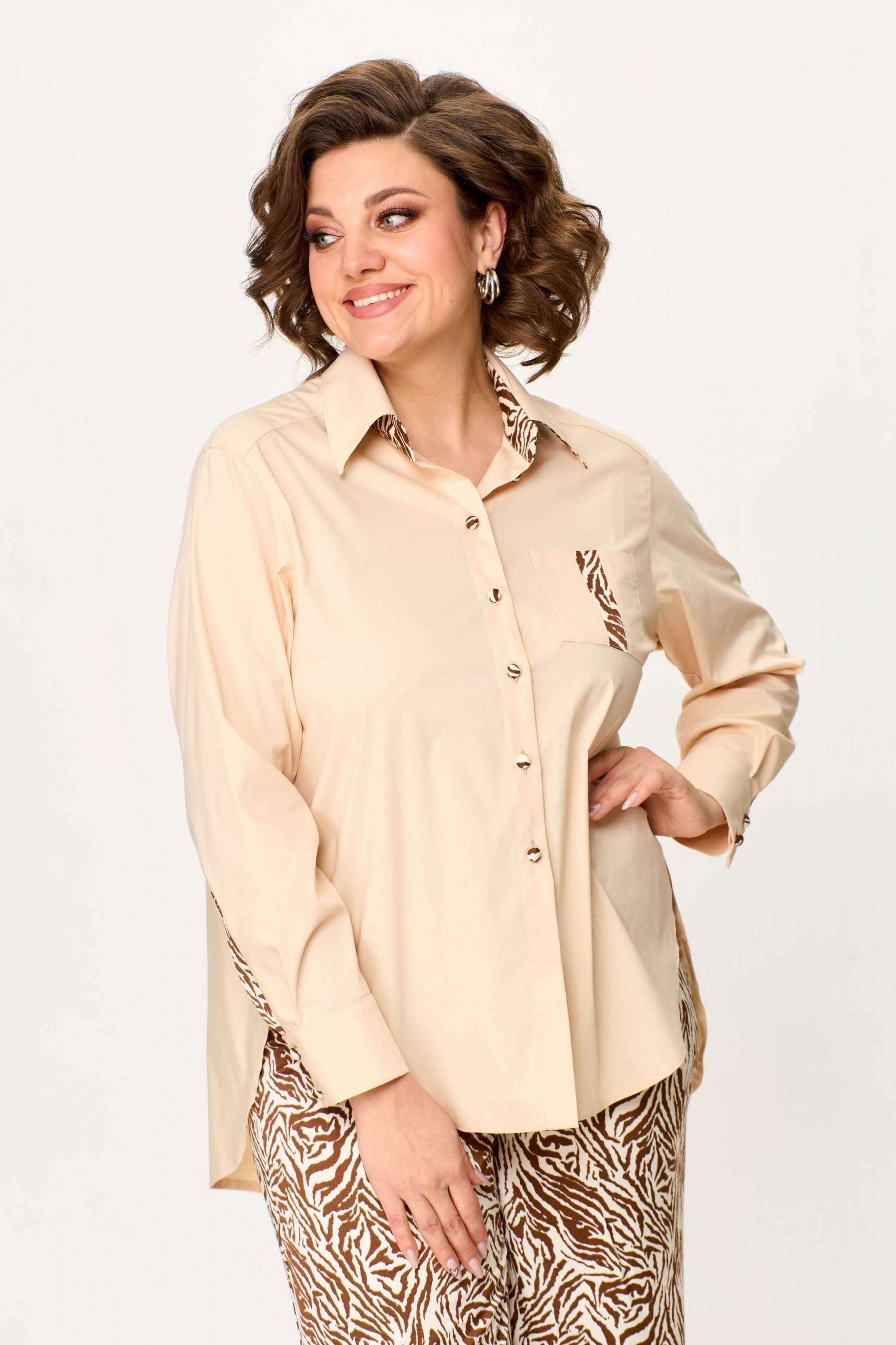 Стильный женский комплект выполнен из рубашки и брюк. Рубашка выполнена из хлопка с содержанием эластана. Рубашка свободного силуэта с застежкой на петли м декоративные пуговицы. С левой стороны на уровне груди накладной карман с отделкой. Горловина с рубашечным воротником на стойке, нижняя стойка и воротник из отделочной ткани. Рукава длинные с притачным манжетом и шлицей, шлица из отделочной ткани. Брюки из струящейся ткани с принтом «зебра», расширенные от линии бедер. Верх брюк на резинке. Длина рубашки – 76 см. Длина рукава – 58 см. Длина брюк – 113 см.