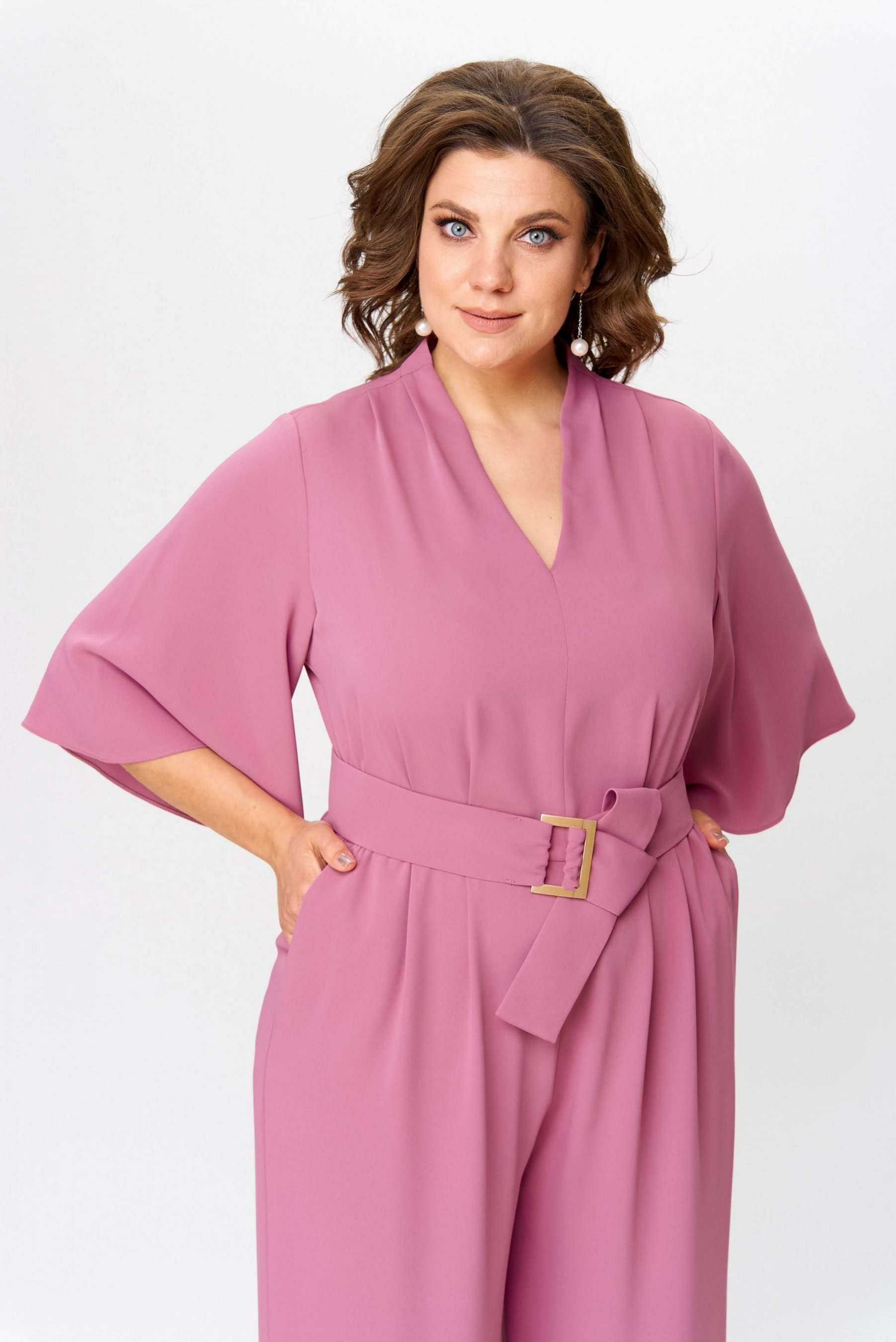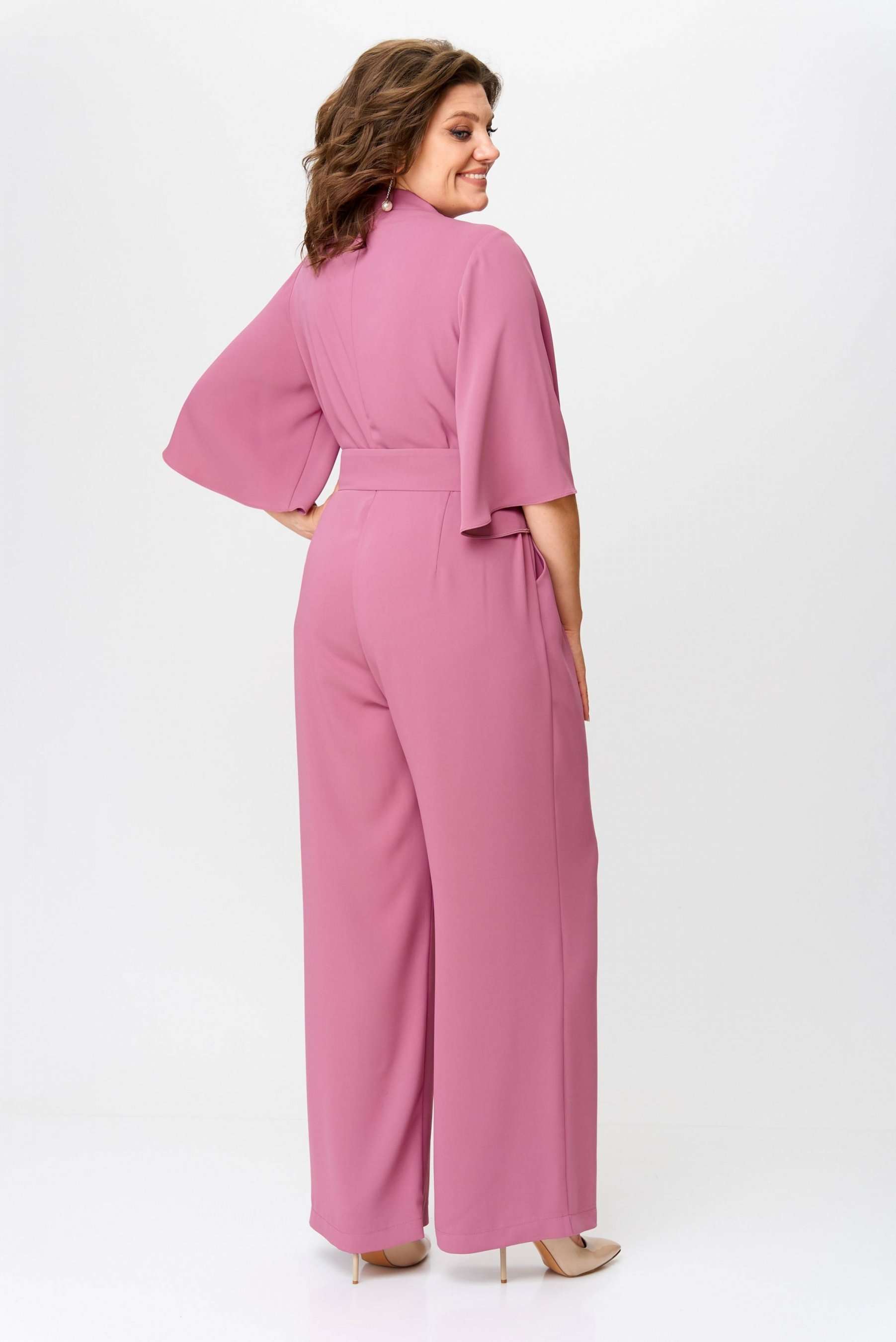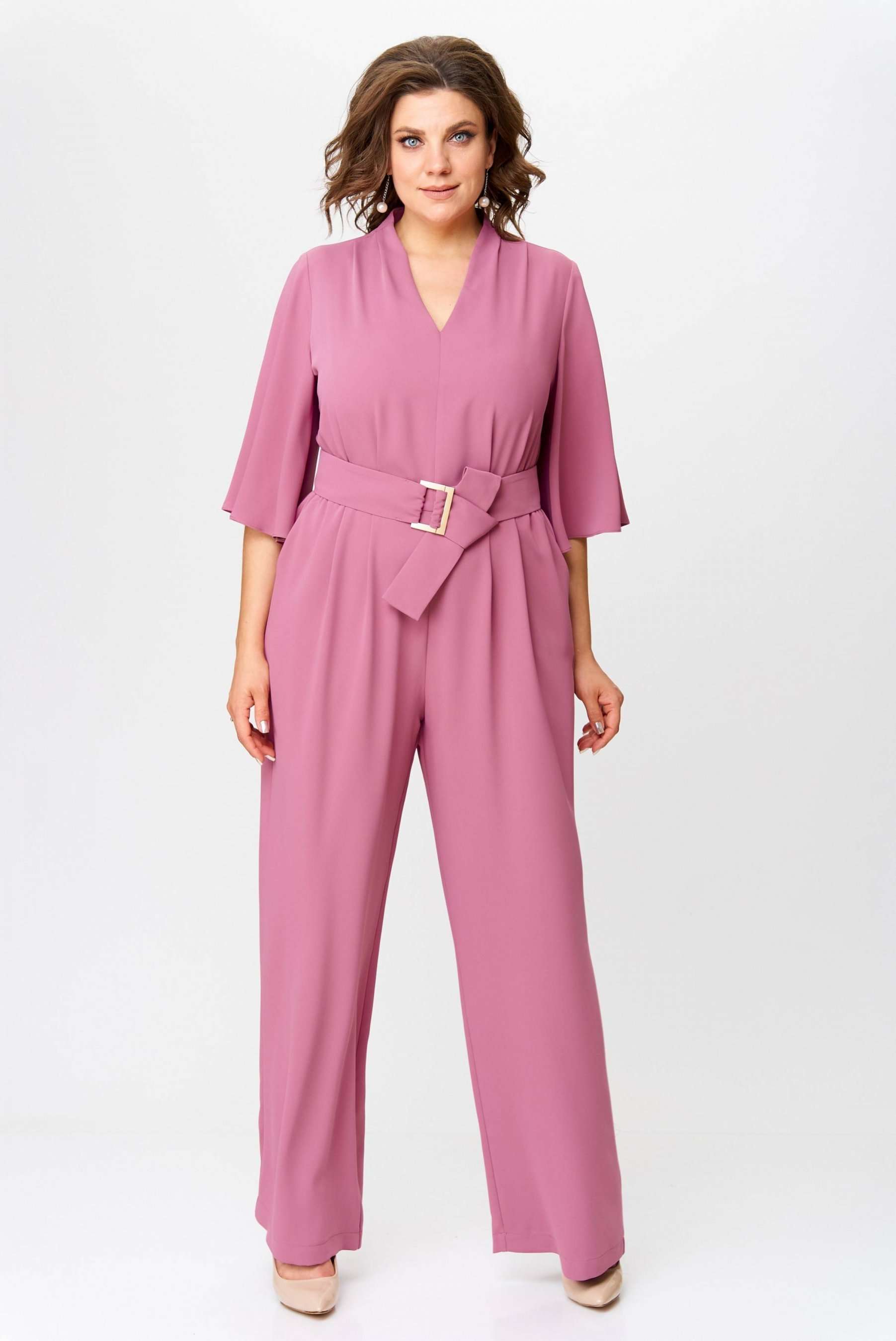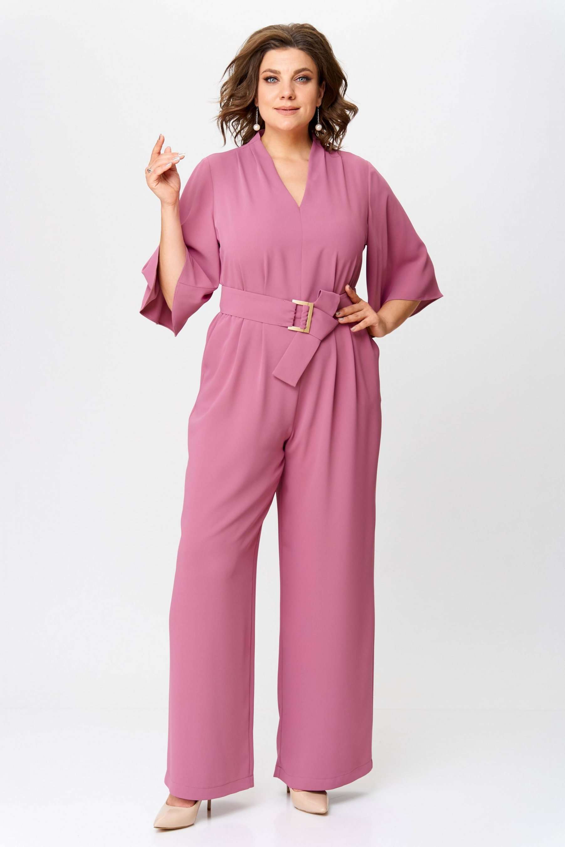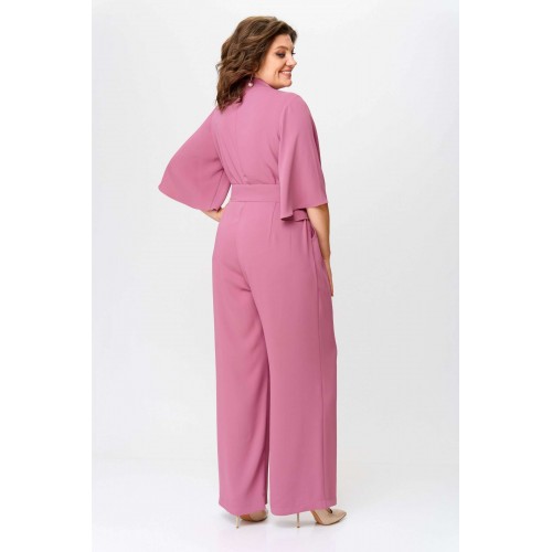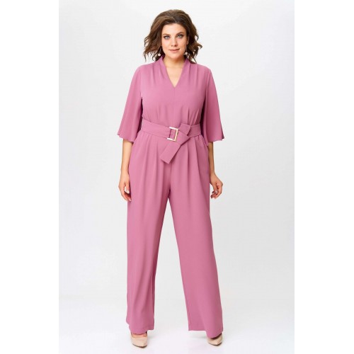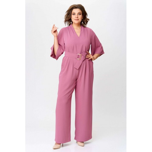 Стильный женский комбинезон, выполнен из плательной струящейся ткани. Комбинезон отрезной по линии талии, по лифу и брюкам заложены складки. Горловина «V» образная, застежка на тесьму-молния в среднем шве спинки. Рукава втачные расширенные к низу, длина ¾. Брюки широкие с карманами по боковым швам. В комплект входит пояс из основной ткани с декоративной пряжкой. Длина верхней части комбинезона – 41 см. Длина рукава – 38 см. Длина брюк – 111 см.