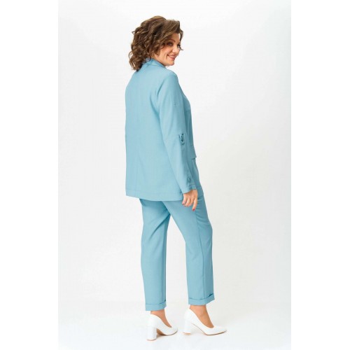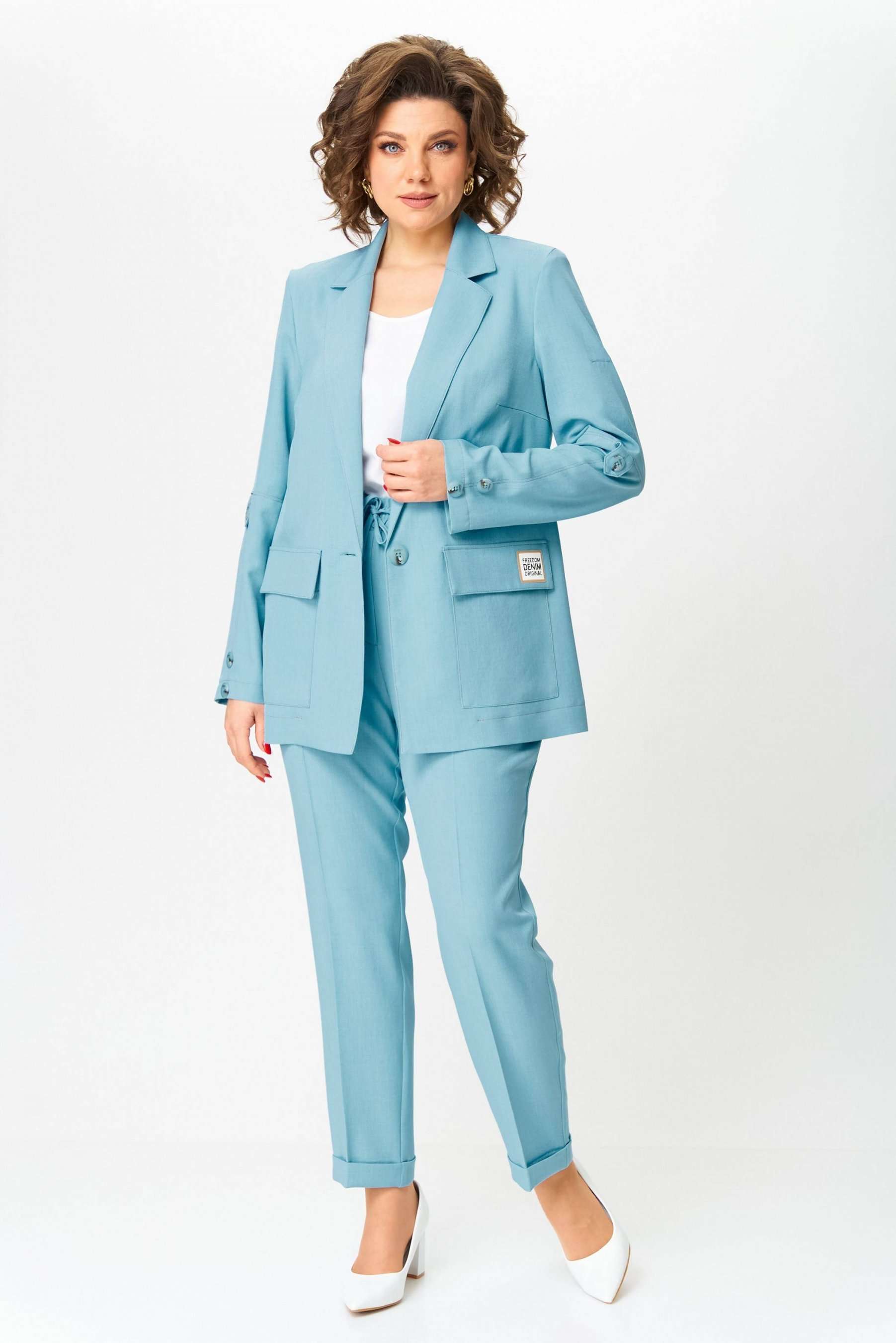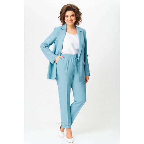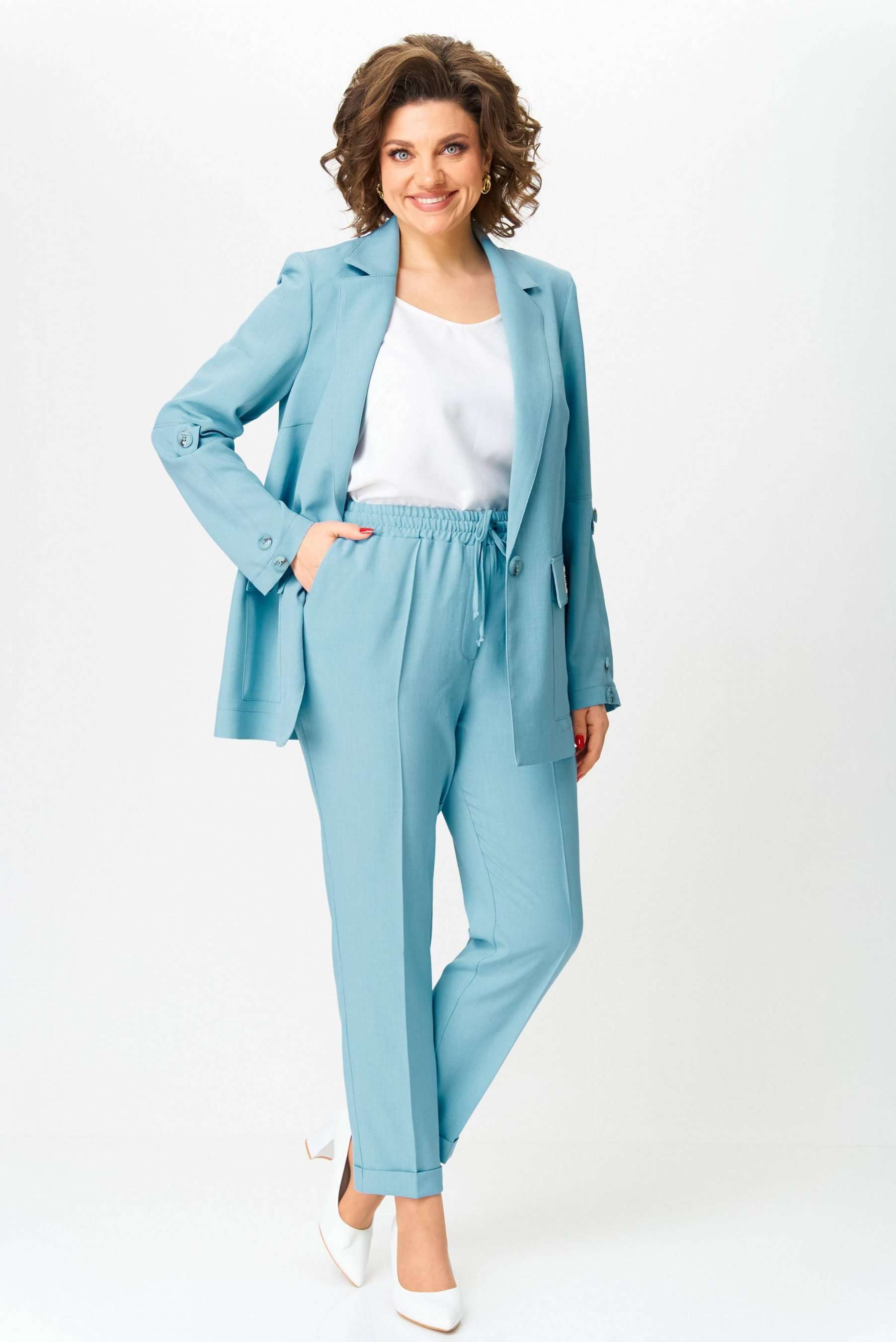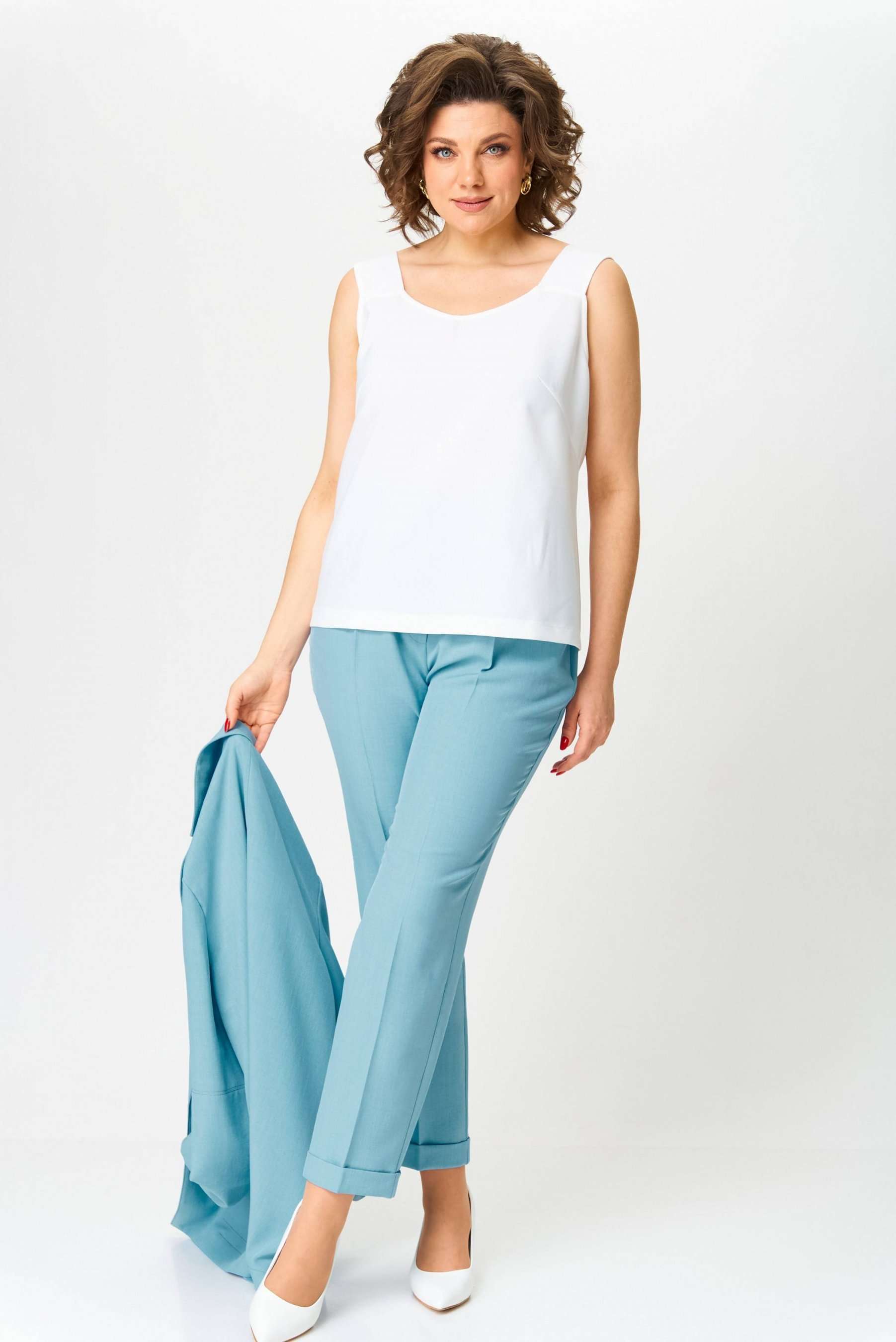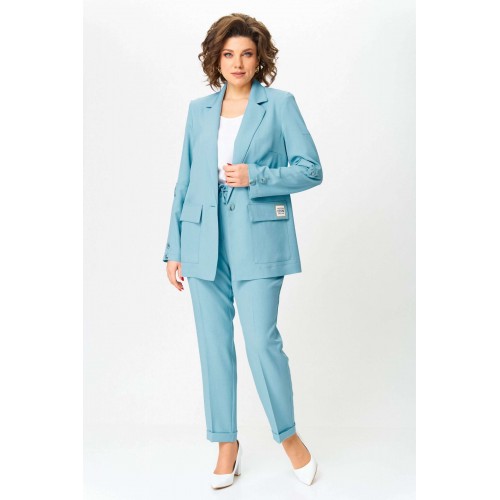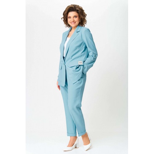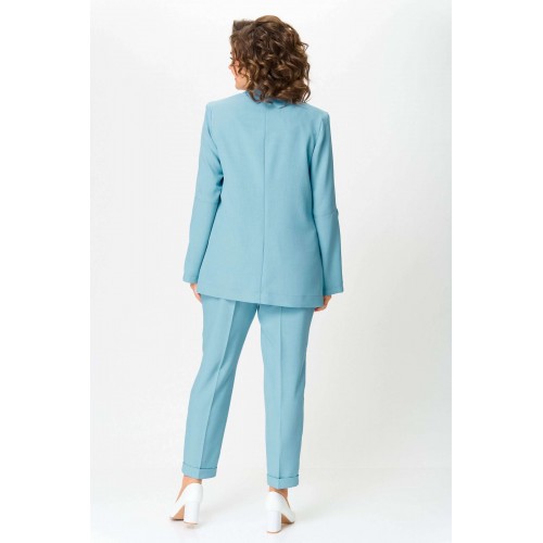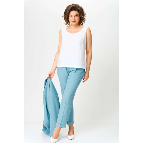 Стильный женский комплект, выполнен в классическом стиле. Жакет полуприлегающего силуэта, с центральной застежкой на одну пуговицу, борт с отворотом лацкана и воротником пиджачного типа. По переду накладные карманы с клапаном, рукава втачные с подрезом по линии локтя и патой для подхвата рукава на пуговицы. Жакет без подкладки. Все отделочные строчки на костюме выполнены контрастными нитками. Брюки заужены к низу, по боковым швам на уровне бедер наклонные карманы с подрезным бочком, пояс на резинке. По низу брюк отложной манжет. Топ полуприлегающего силуэта, на широких бретелях. Длина жакета по спинке – 72 см Длина рукава жакета – 63 см Длина брюк по боковому срезу – 101,5 см Длина топа – 46 см