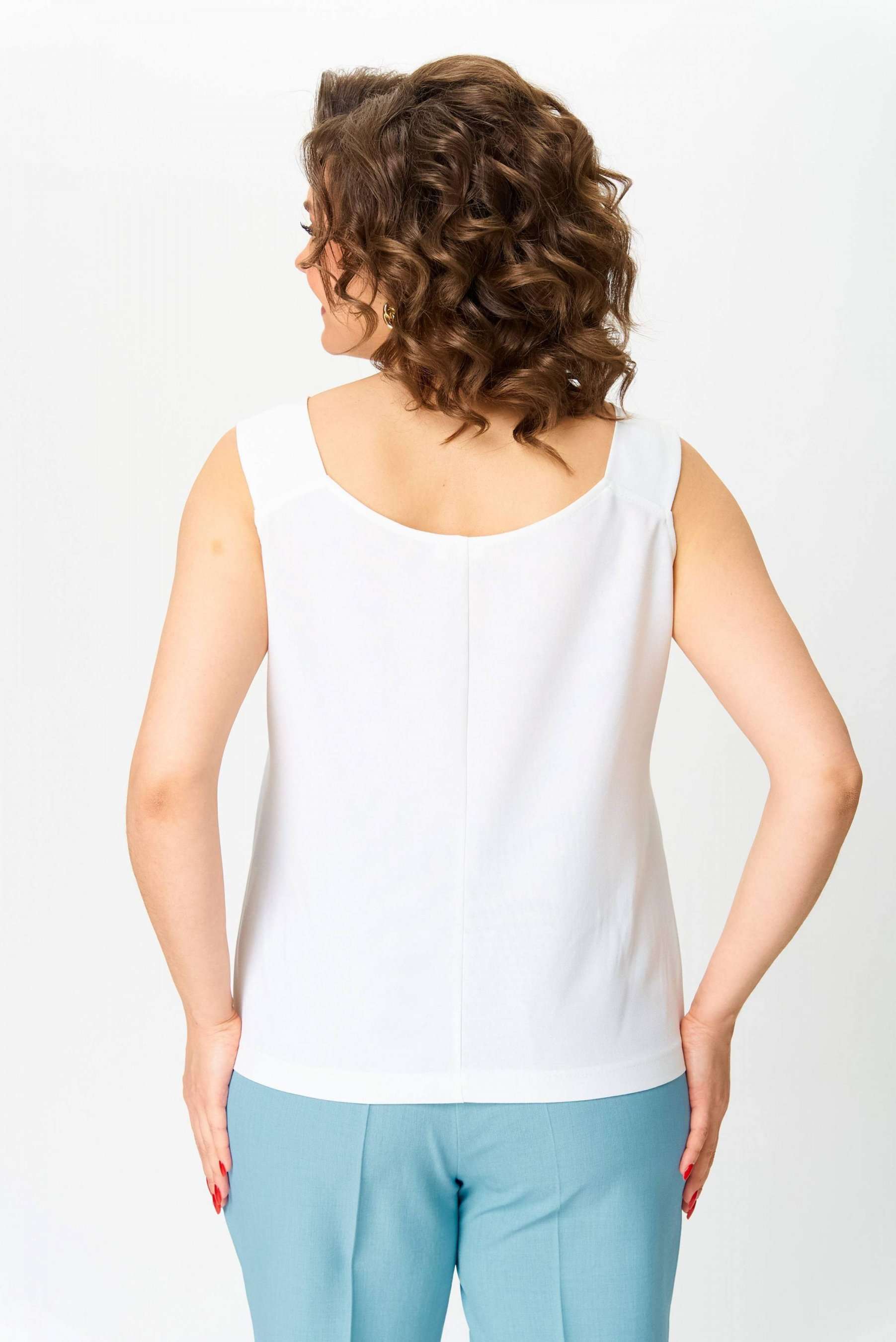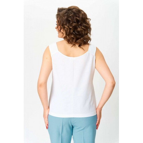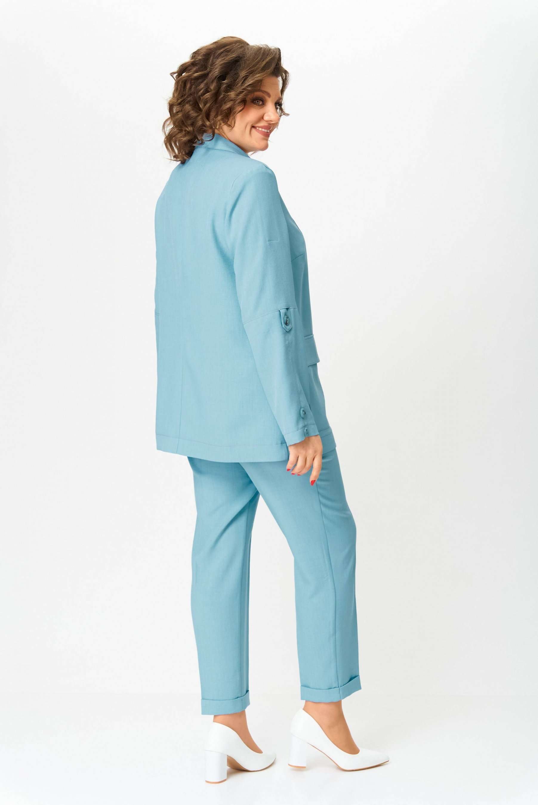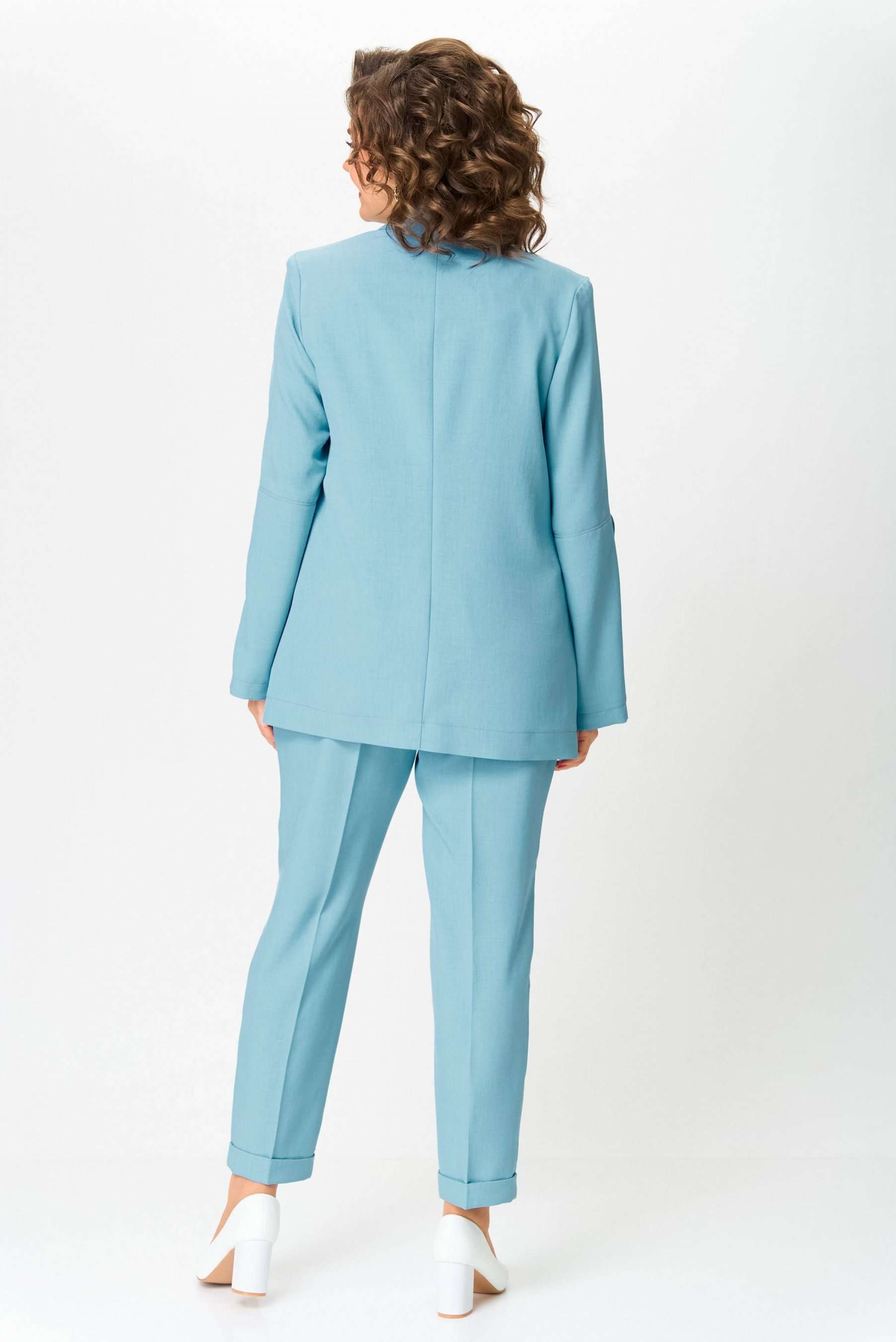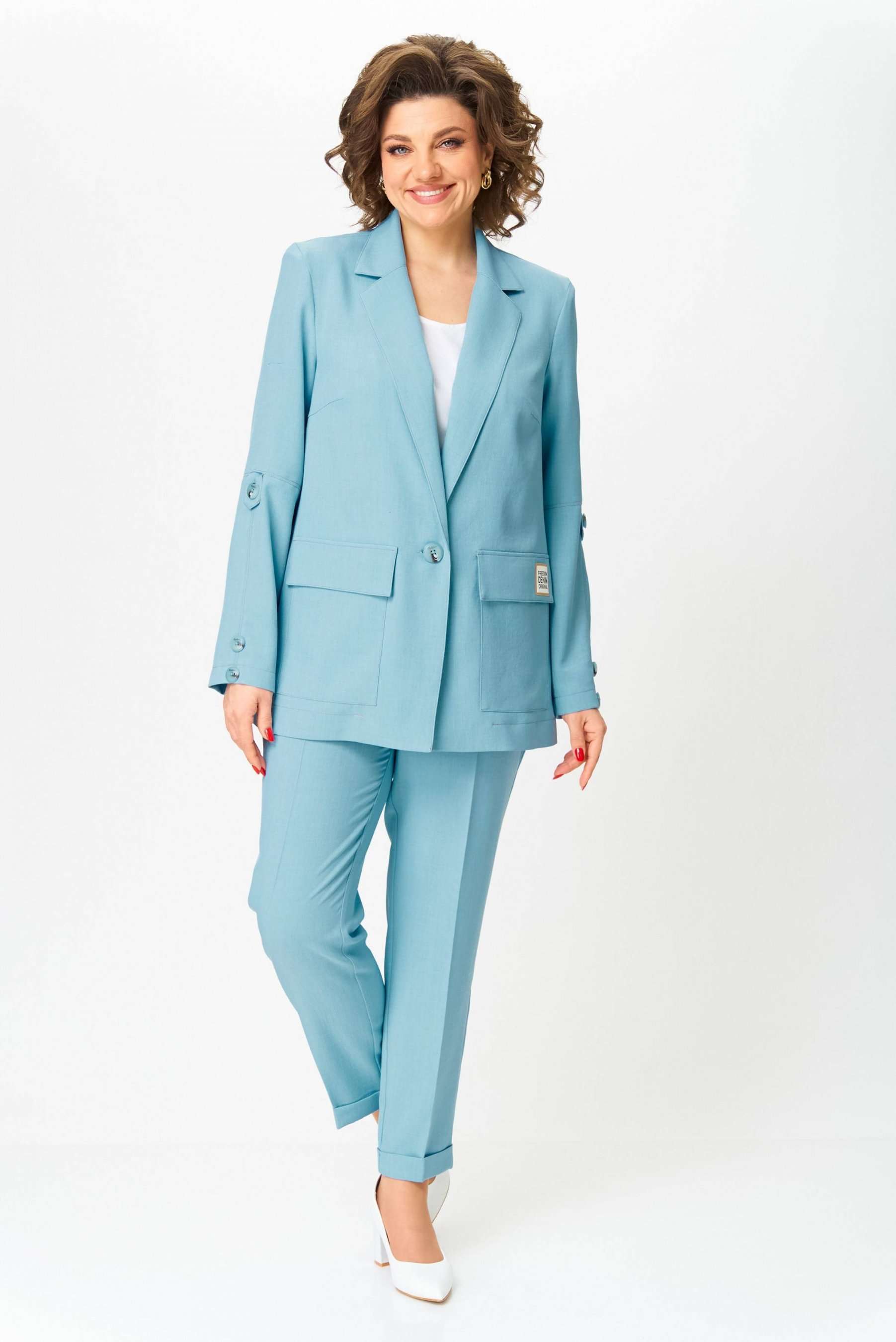 Стильный женский комплект, выполнен в классическом стиле. Жакет полуприлегающего силуэта, с центральной застежкой на одну пуговицу, борт с отворотом лацкана и воротником пиджачного типа. По переду накладные карманы с клапаном, рукава втачные с подрезом по линии локтя и патой для подхвата рукава на пуговицы. Жакет без подкладки. Все отделочные строчки на костюме выполнены контрастными нитками. Брюки заужены к низу, по боковым швам на уровне бедер наклонные карманы с подрезным бочком, пояс на резинке. По низу брюк отложной манжет. Топ полуприлегающего силуэта, на широких бретелях. Длина жакета по спинке – 72 см Длина рукава жакета – 63 см Длина брюк по боковому срезу – 101,5 см Длина топа – 46 см