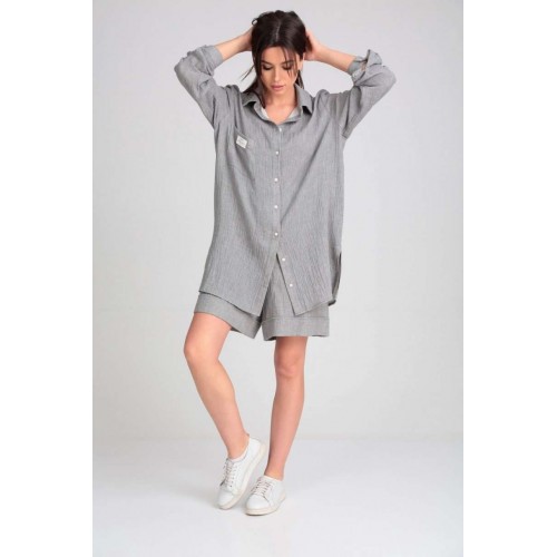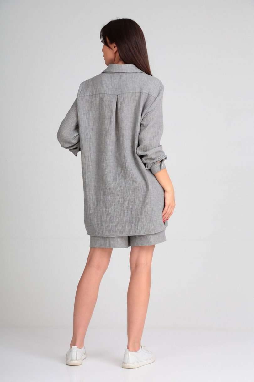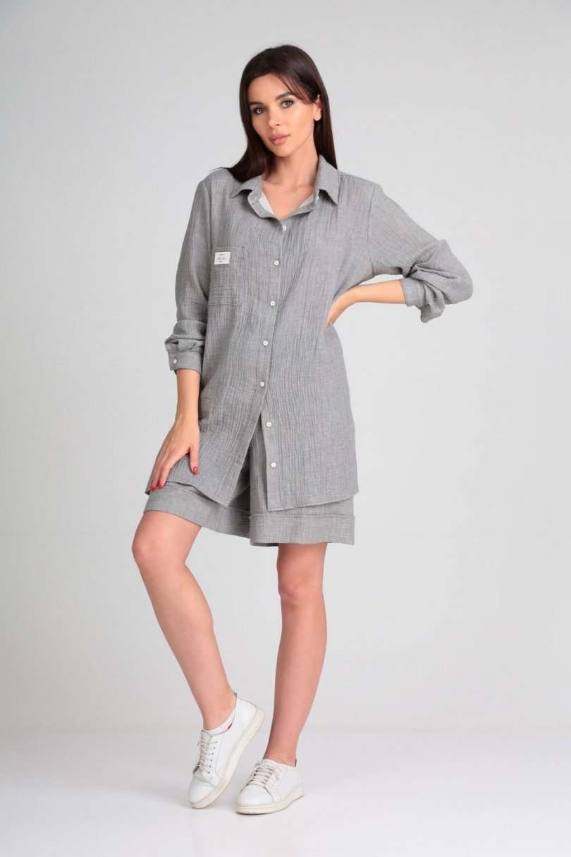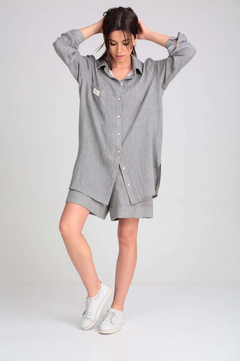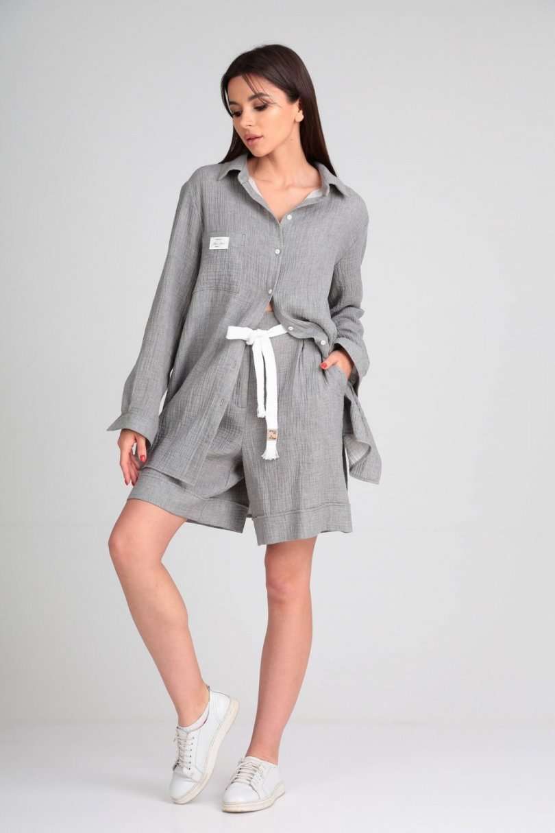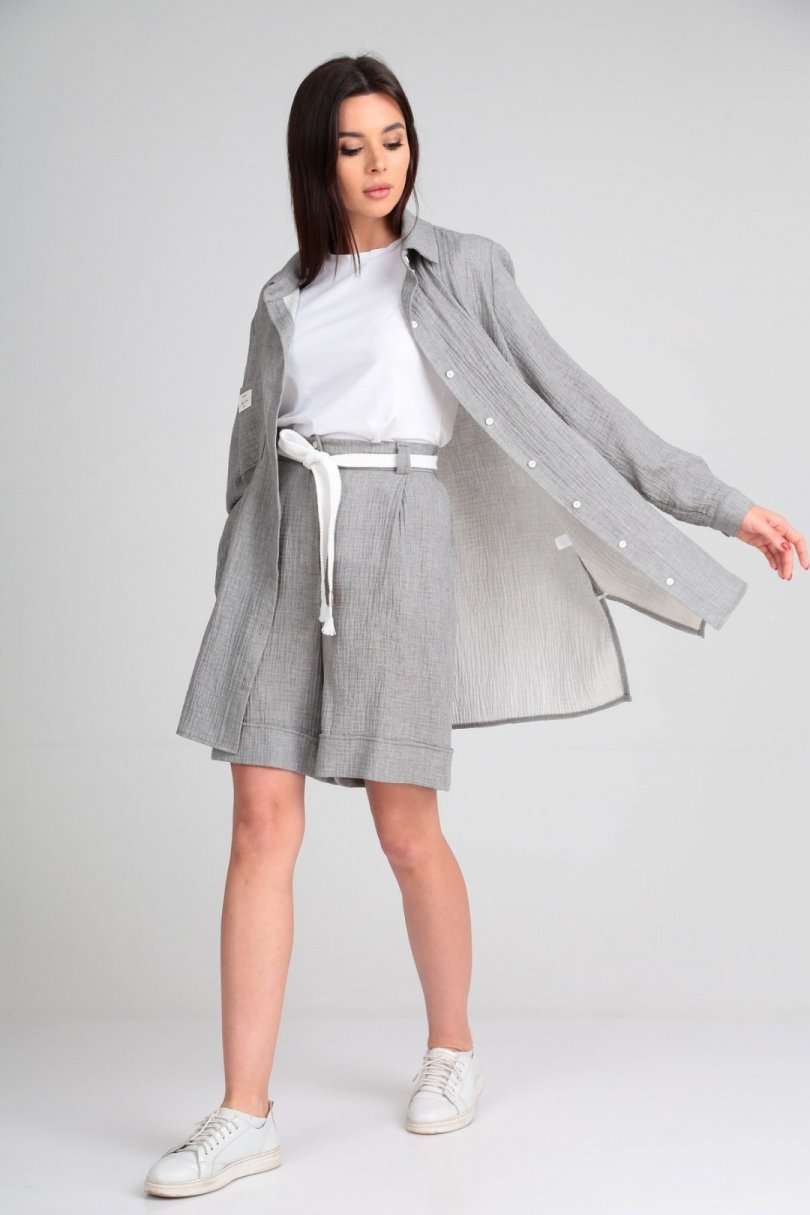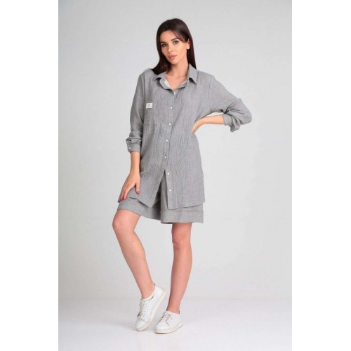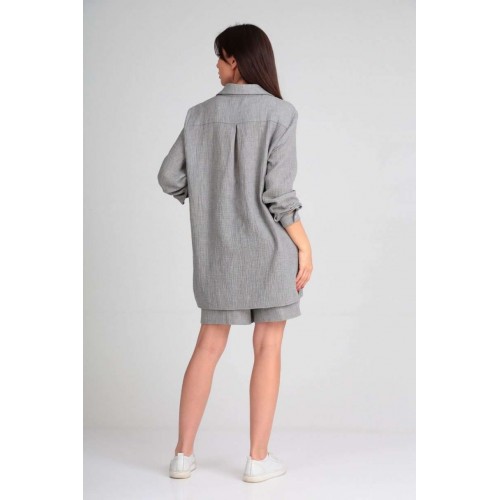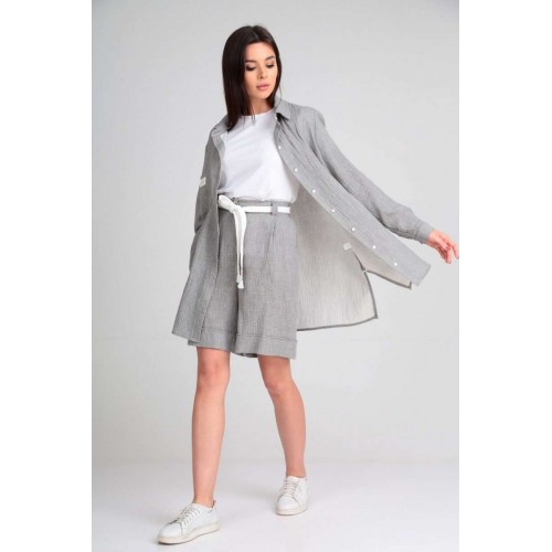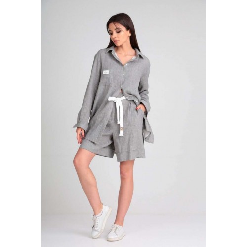 Костюм женский с шортами:блуза прямого силуэта с центральной застёжкой на петли и пуговицы. По переду накладной карман. По спинке кокетка и складка по шву притачивания нижней части к кокетке. Рукав втачной одношовный с притачным манжетом с застёжкой на петлю и пуговицу, по шву притачивания рукава к манжету заложены складки. Воротник стояче-отложной с отрезной стойкой. Шорты прямые, по низу манжеты, в боковых швах обработаны карманы. Верхний срез обработан поясом с резинкой. Застёжка на тесьму-молнию петлю и пуговицу. В качестве отделки используется фурнитура. Длина 80 см. , длина рукава 59 см.,длина шорт 54 см.