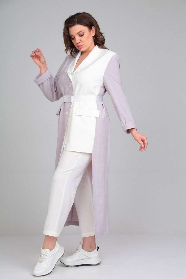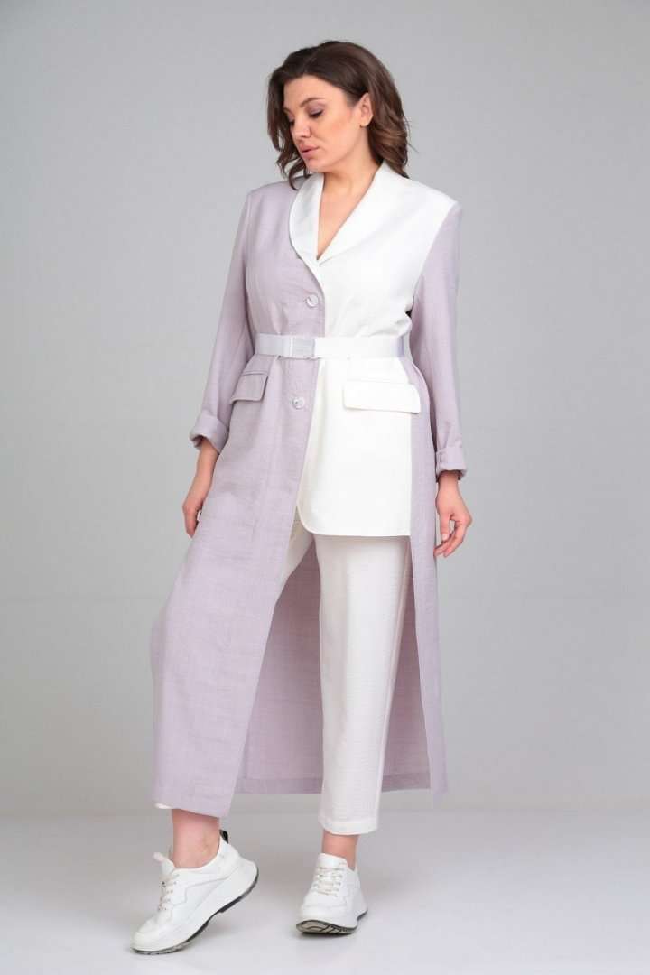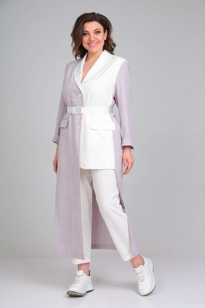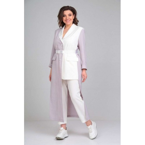 Комплект брючный (жакет+брюки). Жакет полуприлегающего силуэта с центральной застёжкой на петли и пуговицы. По спинке средний шов,бочки, по переду талиевые вытачки,обработаны прорезные карманы с обтачками и клапаном.Рукав втачной двушовный. Воротник - шалиевый. Брюки зауженные к низу, верхний срез обработан поясом с резинкой,застёжка на тесьму-молнию, петлю и пуговицу. В боковых швах обработаны карманы. В качестве отделки используется фурнитура и отделочные детали(съёмный пояс). длина по спинке 130 см.,длина рукава 63 см., длина брюк 100 см.