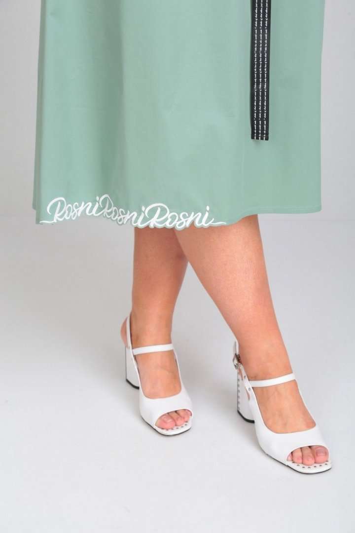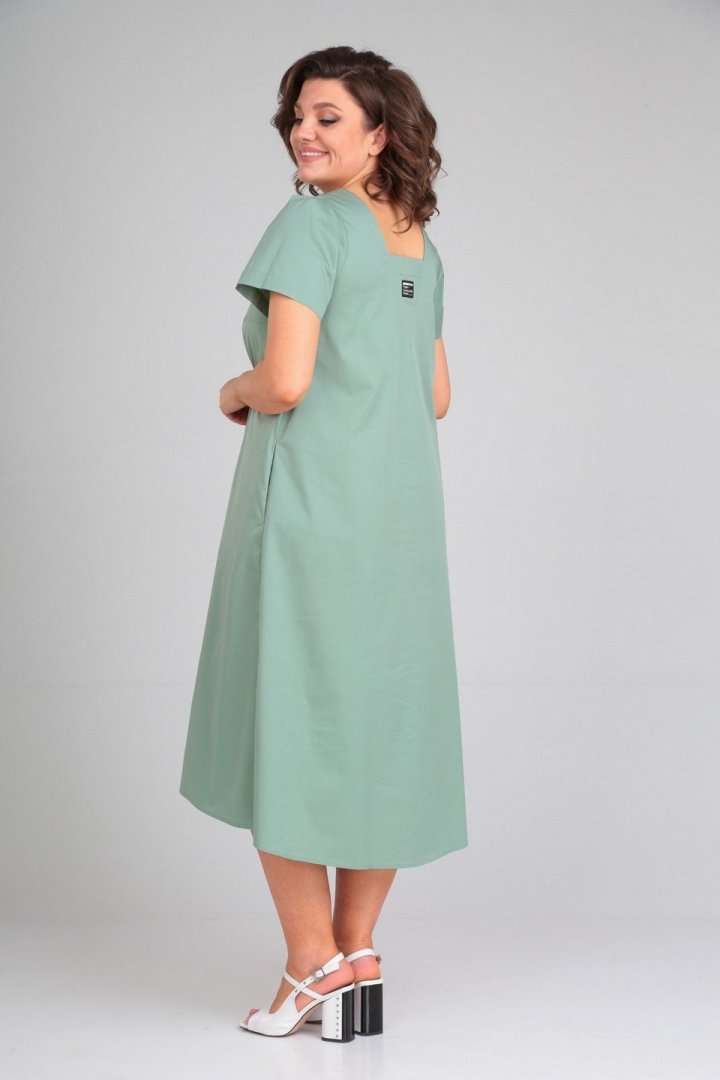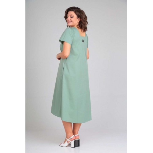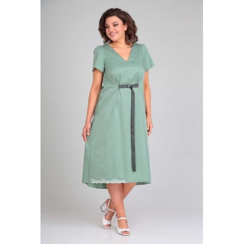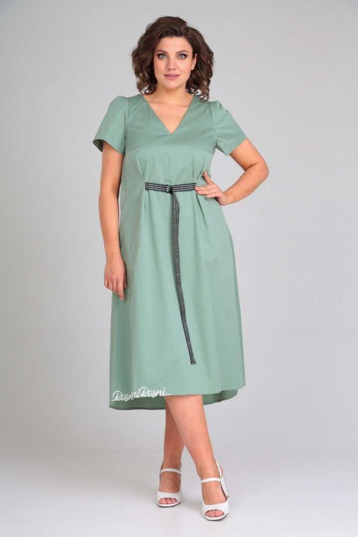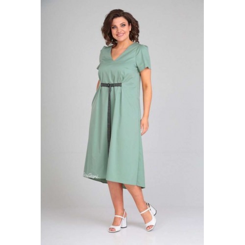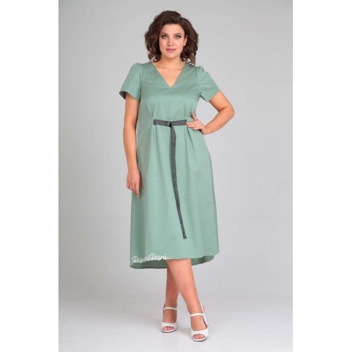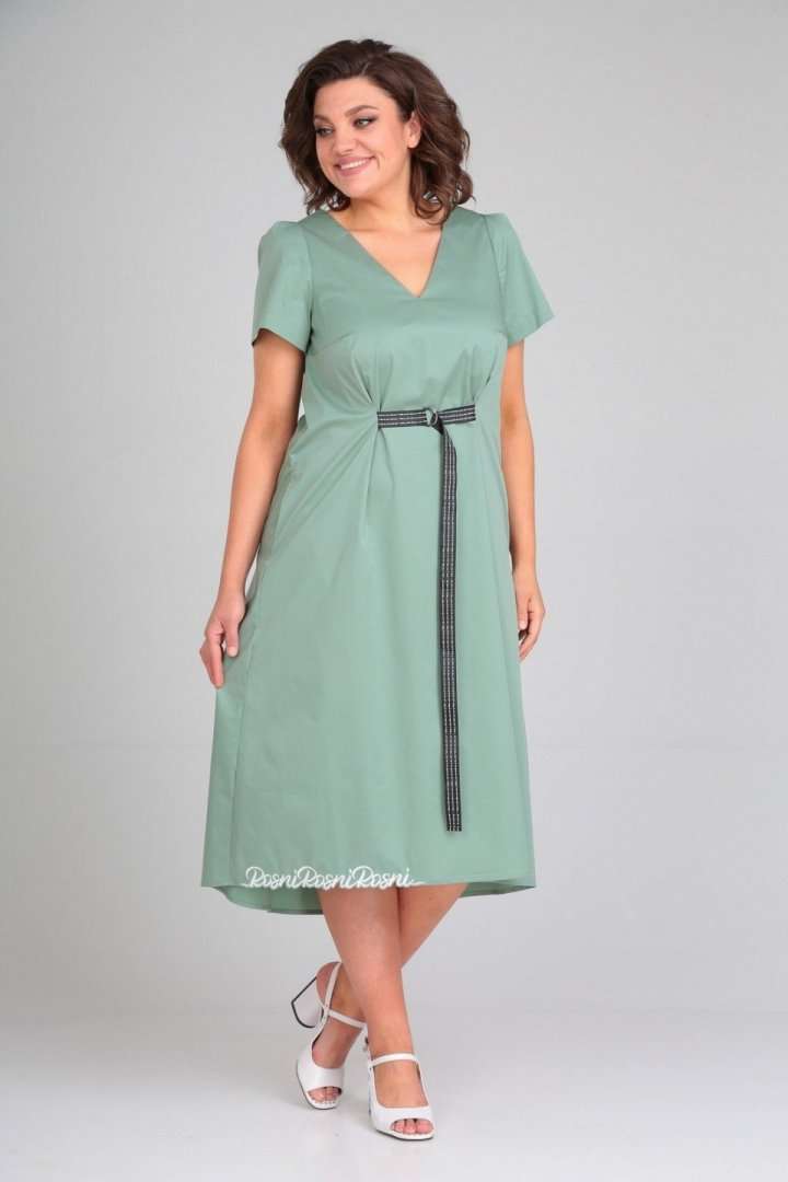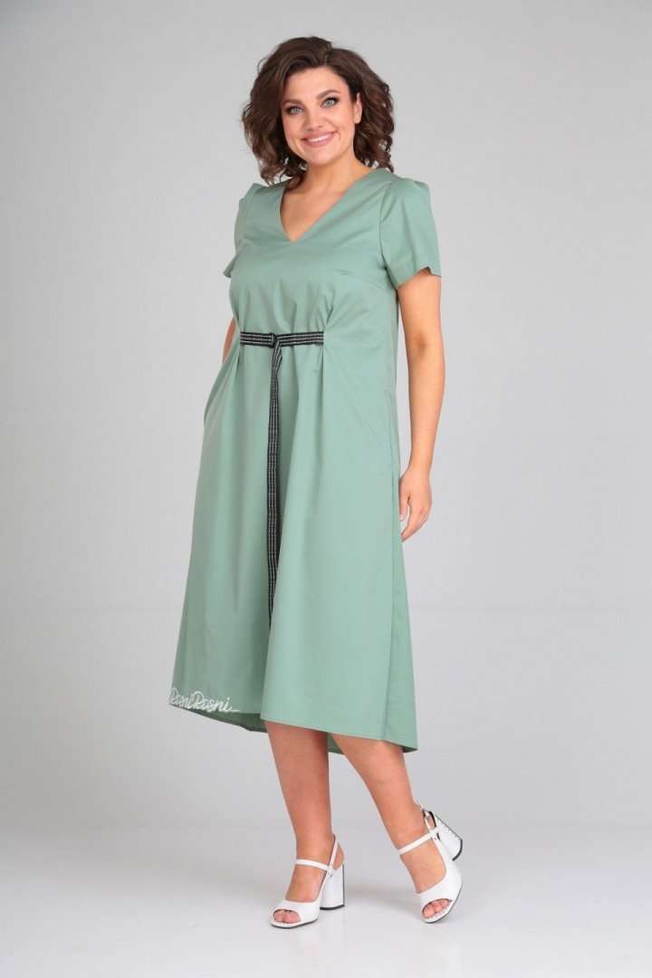 Платье женское расклешённое к низу. По переду нагрудные вытачки, в боковых швах обработаны карманы, по талии застрочены складки,выполнен пояс из отделочной ткани. По спинке вырез, вставка(отделочная деталь). Рукав втачной одношовный со складками по скату. Горловина V-образной формы, обработана обтачкой по скату. В качестве отделки используется фурнитура и вышивка. Длина по спинке 122 см., Длина рукава 23 см.