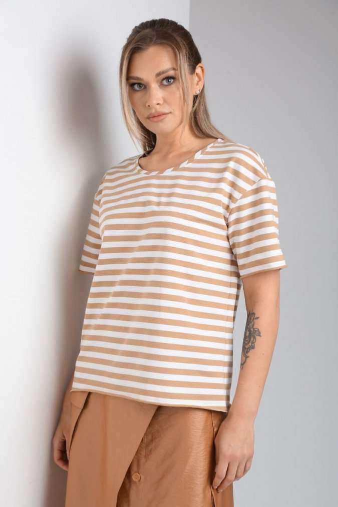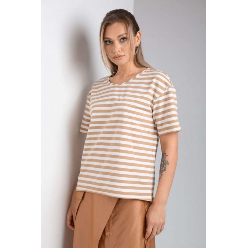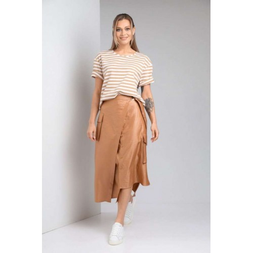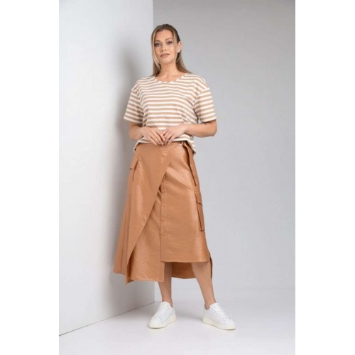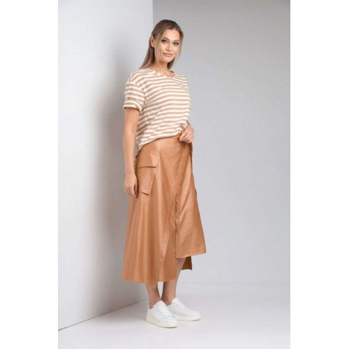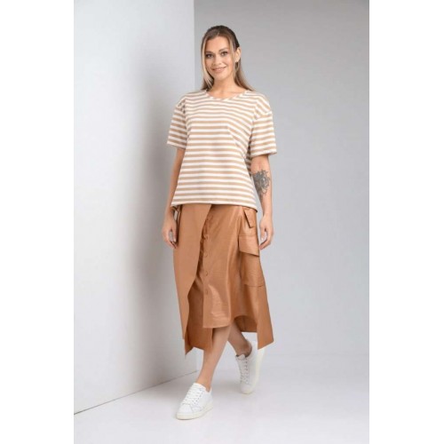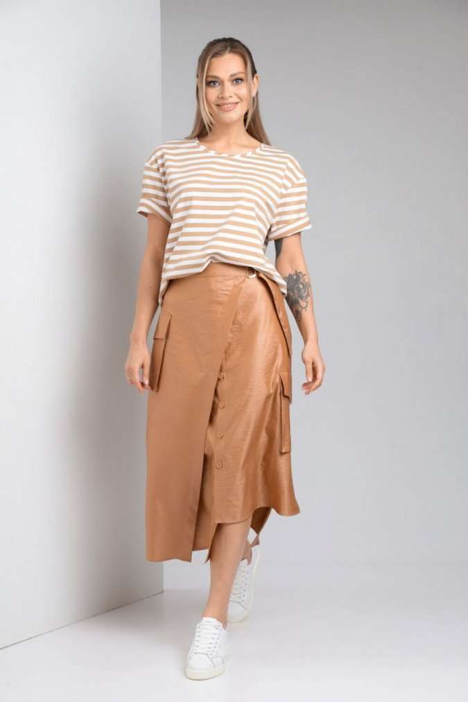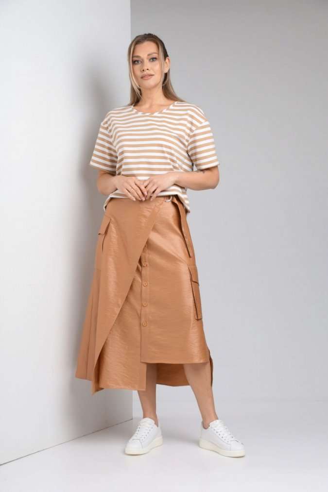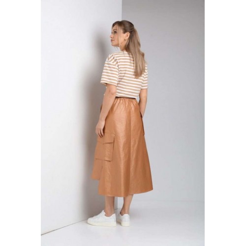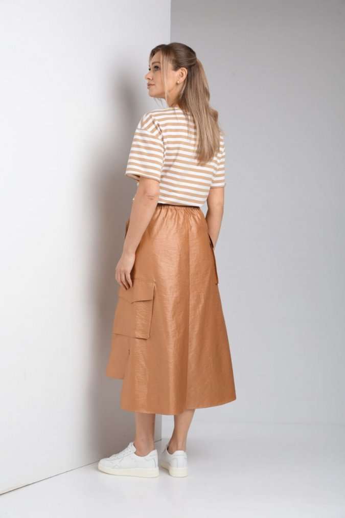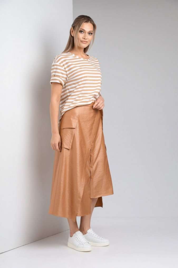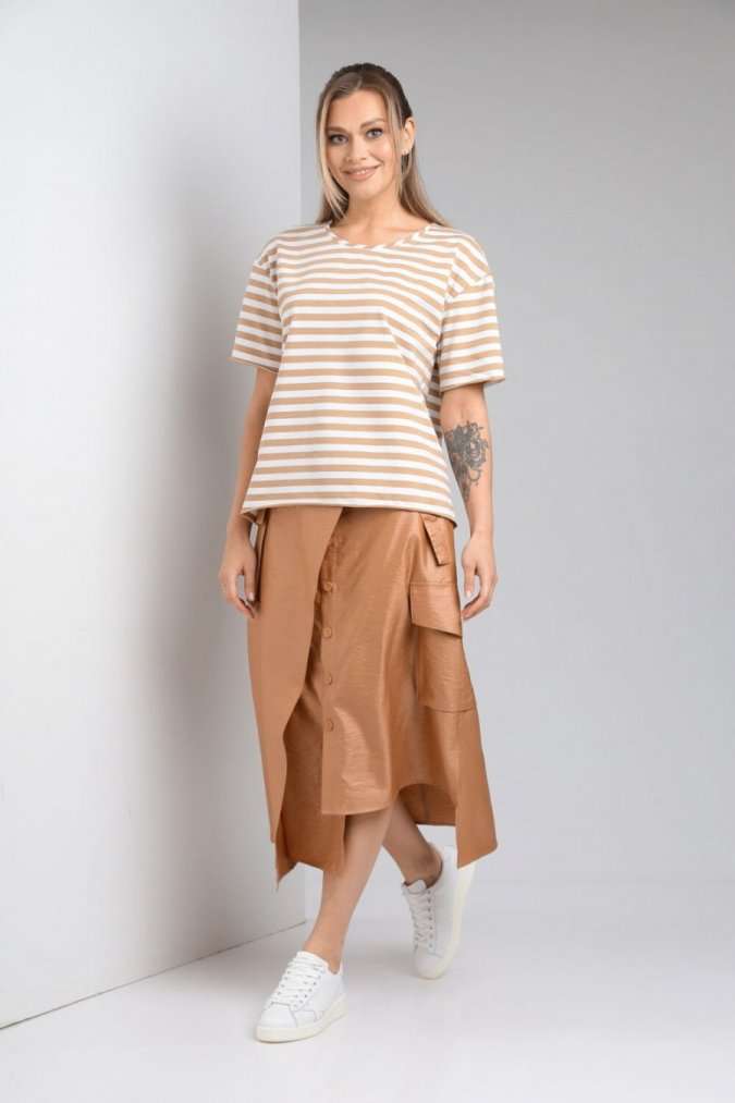 Комплект женский с юбкой (майка+юбка). Майка прямого силуэта, линия поеча спущена, рукав втачной одношовный, горловина обработана бейкой. Юбка расширенная к низу с центральной застежкой на петли и пуговицы. По переду отлетная отделочная деталь, фиксируемая поясом. Отделочные накладные карманы на боковых швах, средний шов на заднем полотнище. Верхний срез обработан поясом с резинкой по спинке. Длина по спинке 61 см.Длина рукава 19,5 см. Длина юбки 86 см