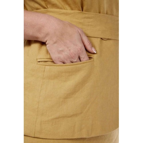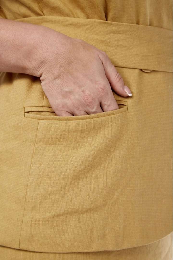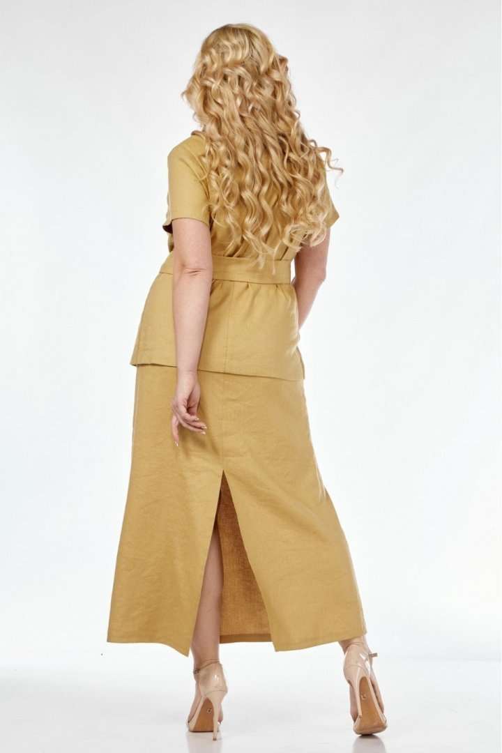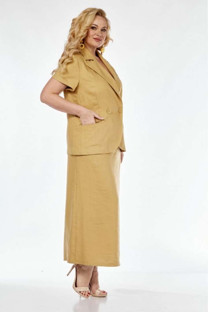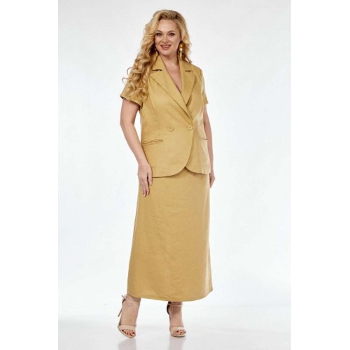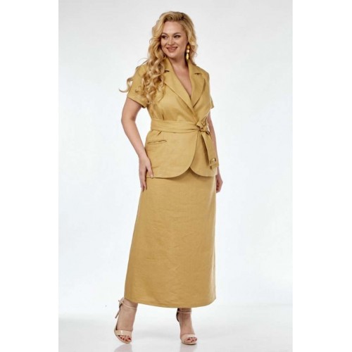 Костюм женский с юбкой. Жакет полуприлегающего силуэта со смещенной 2-бортной застежкой на петли и пуговицы с открытыми бортами. По спинке средний шов,по переду талиевые вытачки, прорезные карманы в рамку с двумя обтачками. Рукав втачной одношовный,короткий. Воротник стояче-отложной с отрезной стойкой. Перед на подкладке, спинка с окантованными швами. Пояс съемный. Юбка длинная, прямая. Талиевые вытачки на переднем полотнище. Средний шов с разрезом на заднем полотнище. Верхний срез обработан обтачкой с резинкой по спинке. Застежка:потайная молния в среднем шве спинки Длина жакета 65 см. длина рукава 20 см