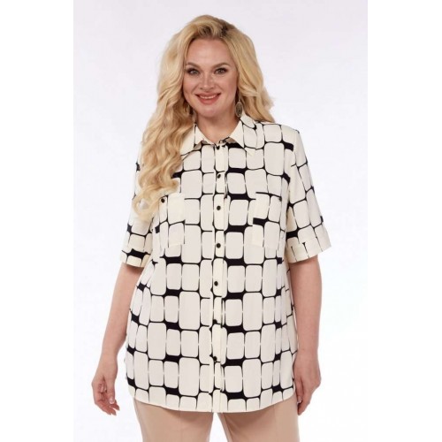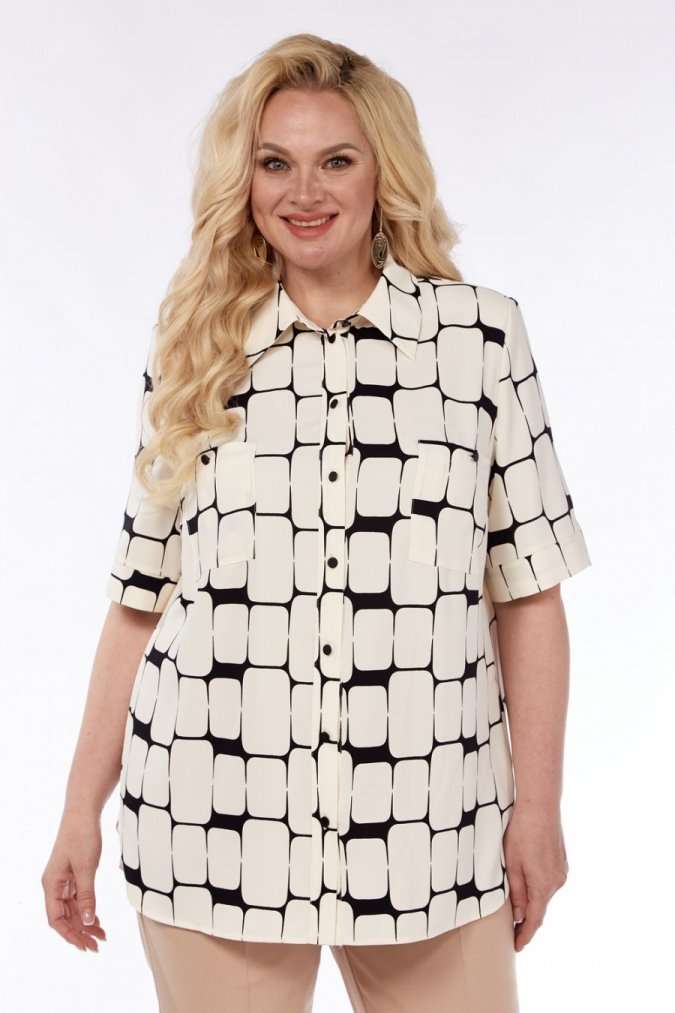 Универсальная базовая блузка прямого силуэта. По переду вытачки нагрудные, накладные карманы, застежка в виде планки на петли пуговицы. Воротник стояче-отложной. По спинке отложная кокетка. Рукав втачной короткий, низ обработан притачной манжетой. В боковых швах предусмотрены фигурные разрезы по низу изделия.