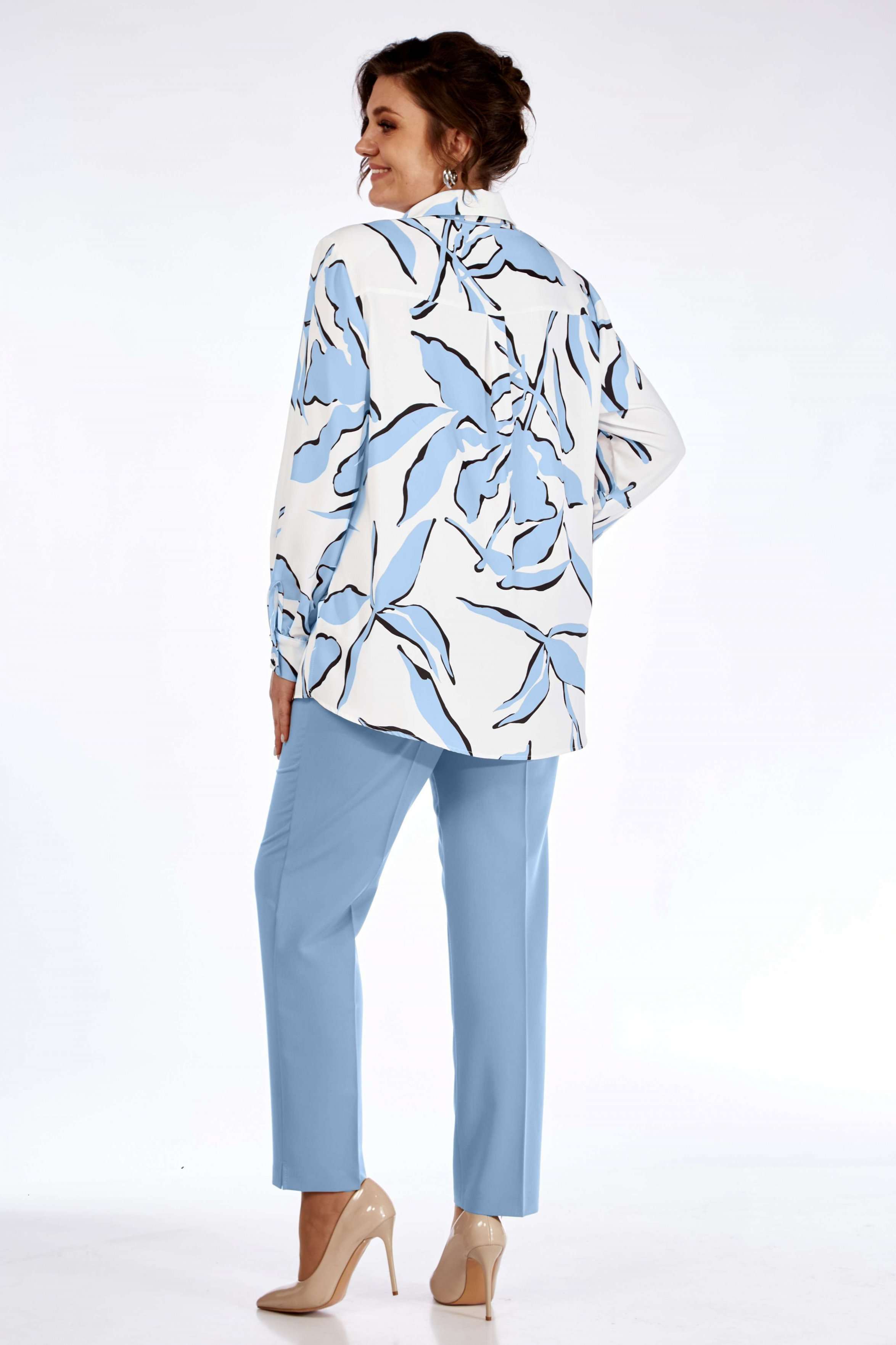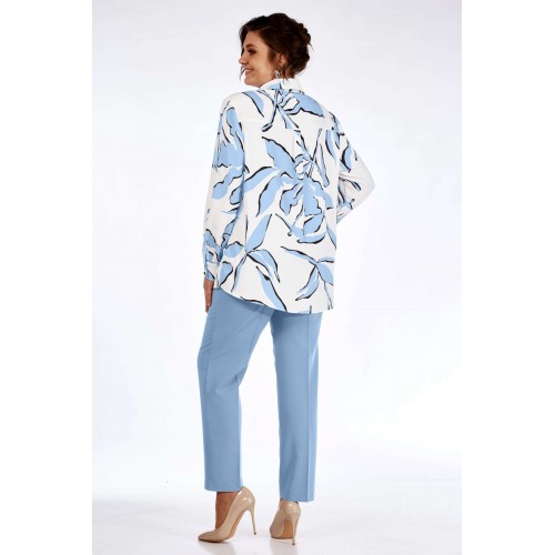 Комплектация из блузы и брюк. Блуза прямого силуэта, выполнена из нежной, приятной ткани, стойкой к сминанию. Воротник классический, рубашечный на отрезной стойке, эстетично подчеркнут вырез горловины, что придает изделию дополнительный образ. Рукав втачной, низ обработан притачной манжетой. По спинке заложена и застрочена бантовая складка. Низ изделия асимметричный. Брюки слегка зауженные к низу. Пояс притачной, частично на резинке. Застежка спереди брюки на тесьму-молнию, петлю-пуговицу.