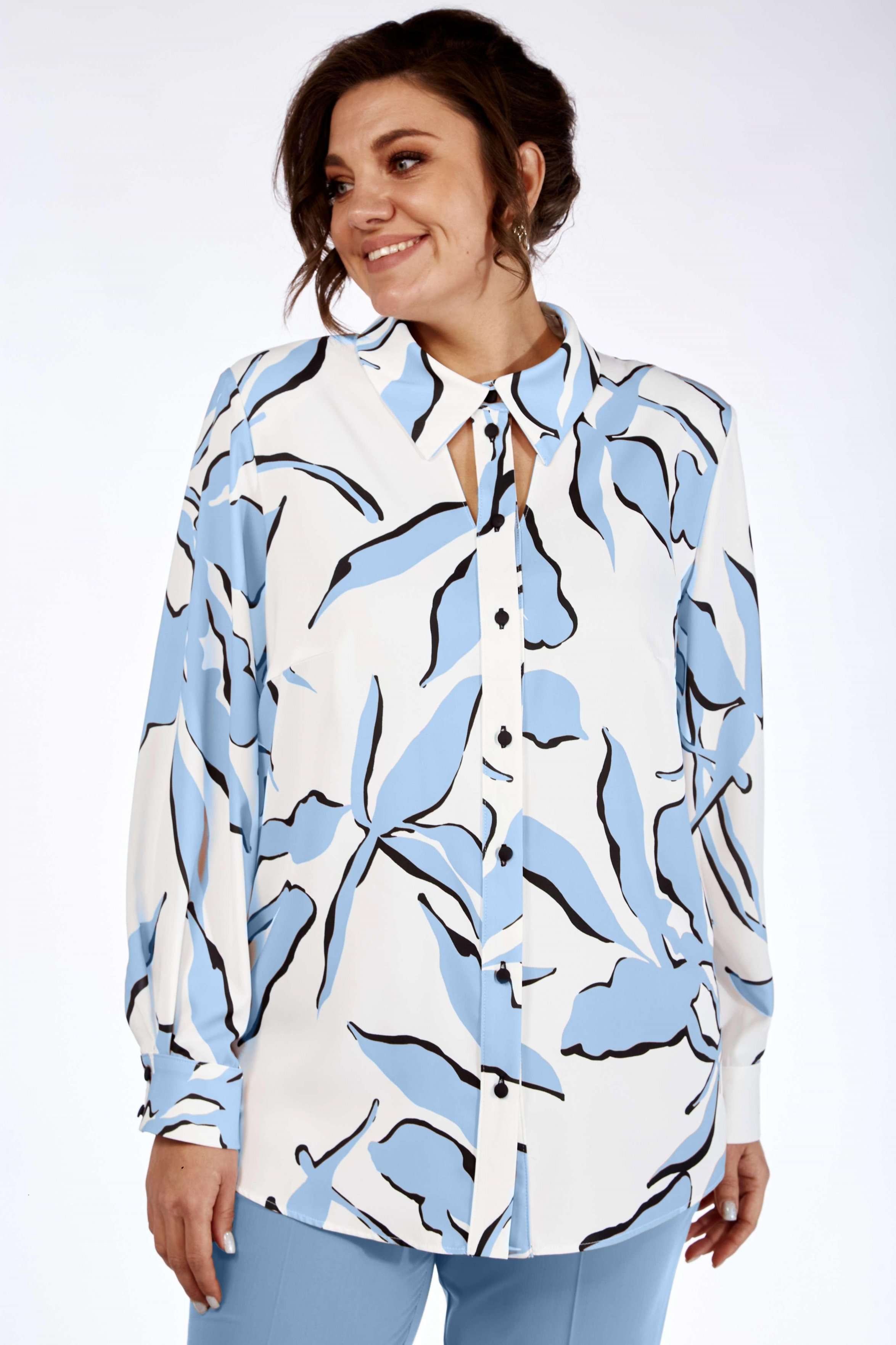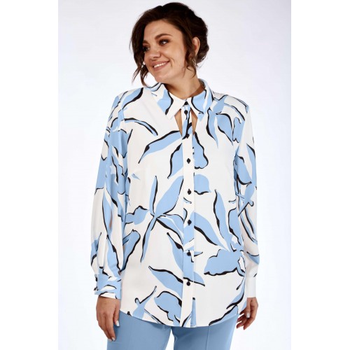 Блуза прямого силуэта, выполнена из нежной, приятной ткани, стойкой к сминанию. Воротник классический, рубашечный на отрезной стойке, эстетично подчеркнут вырез горловины, что придает изделию дополнительный образ. Рукав втачной, низ обработан притачной манжетой. По спинке заложена и застрочена бантовая складка. Низ изделия асимметричный