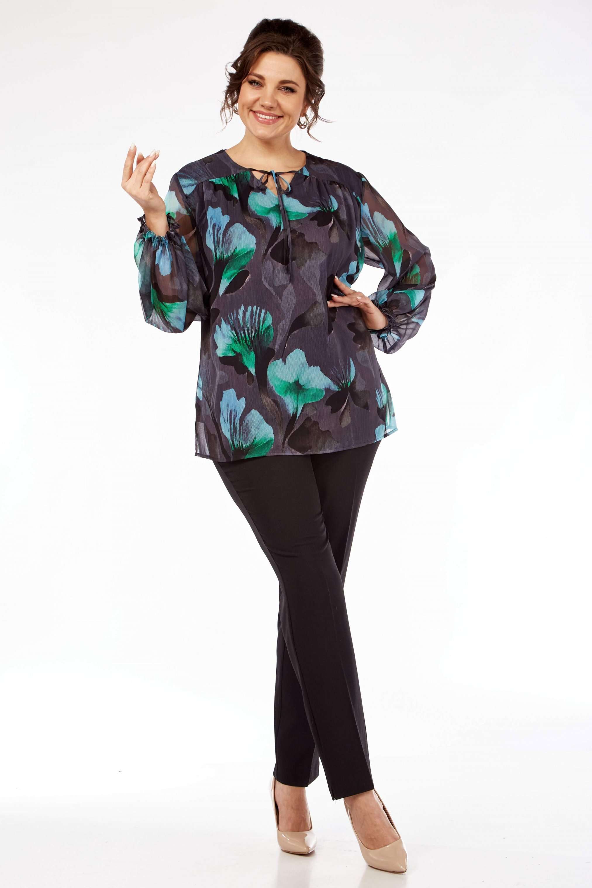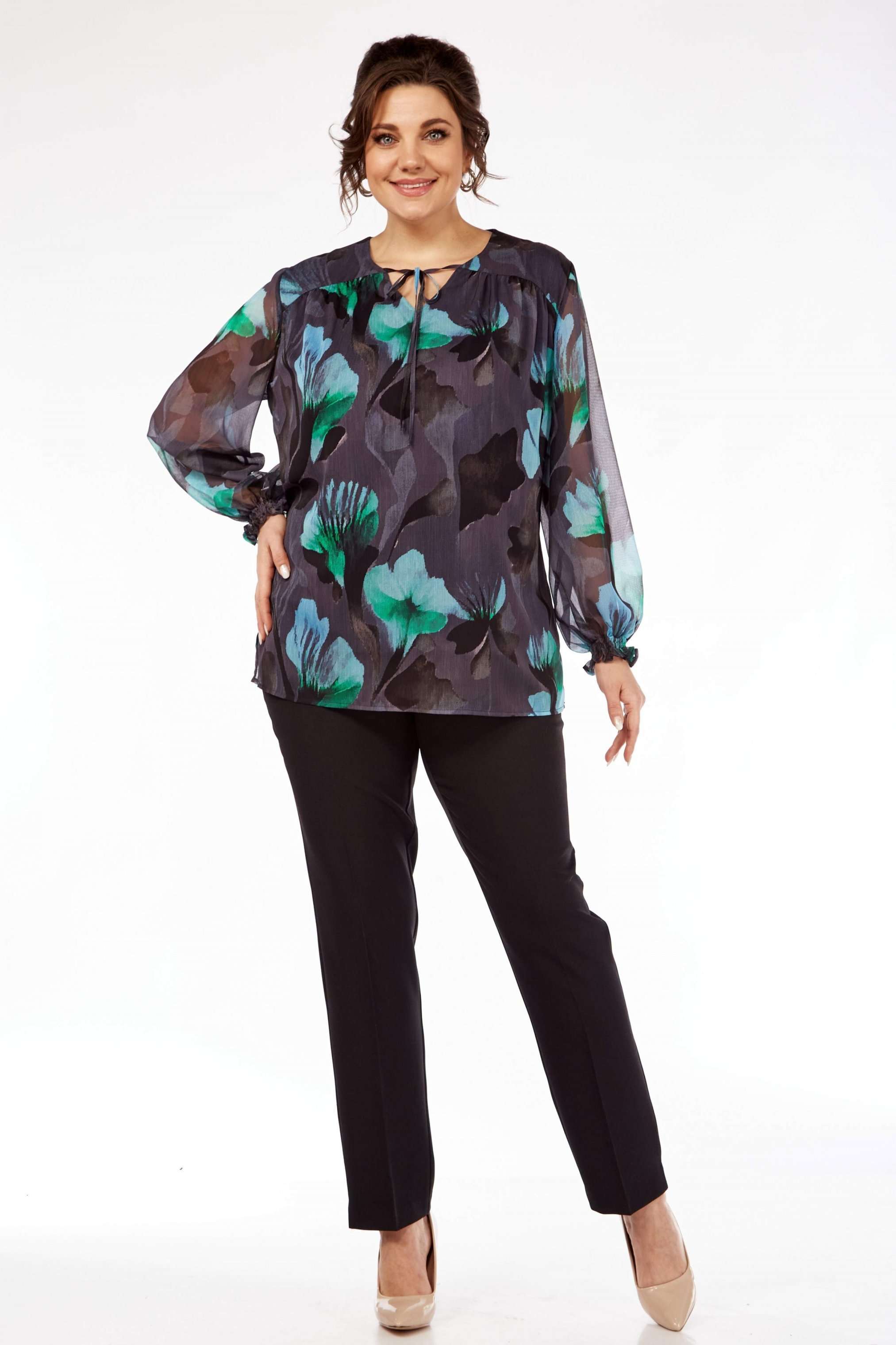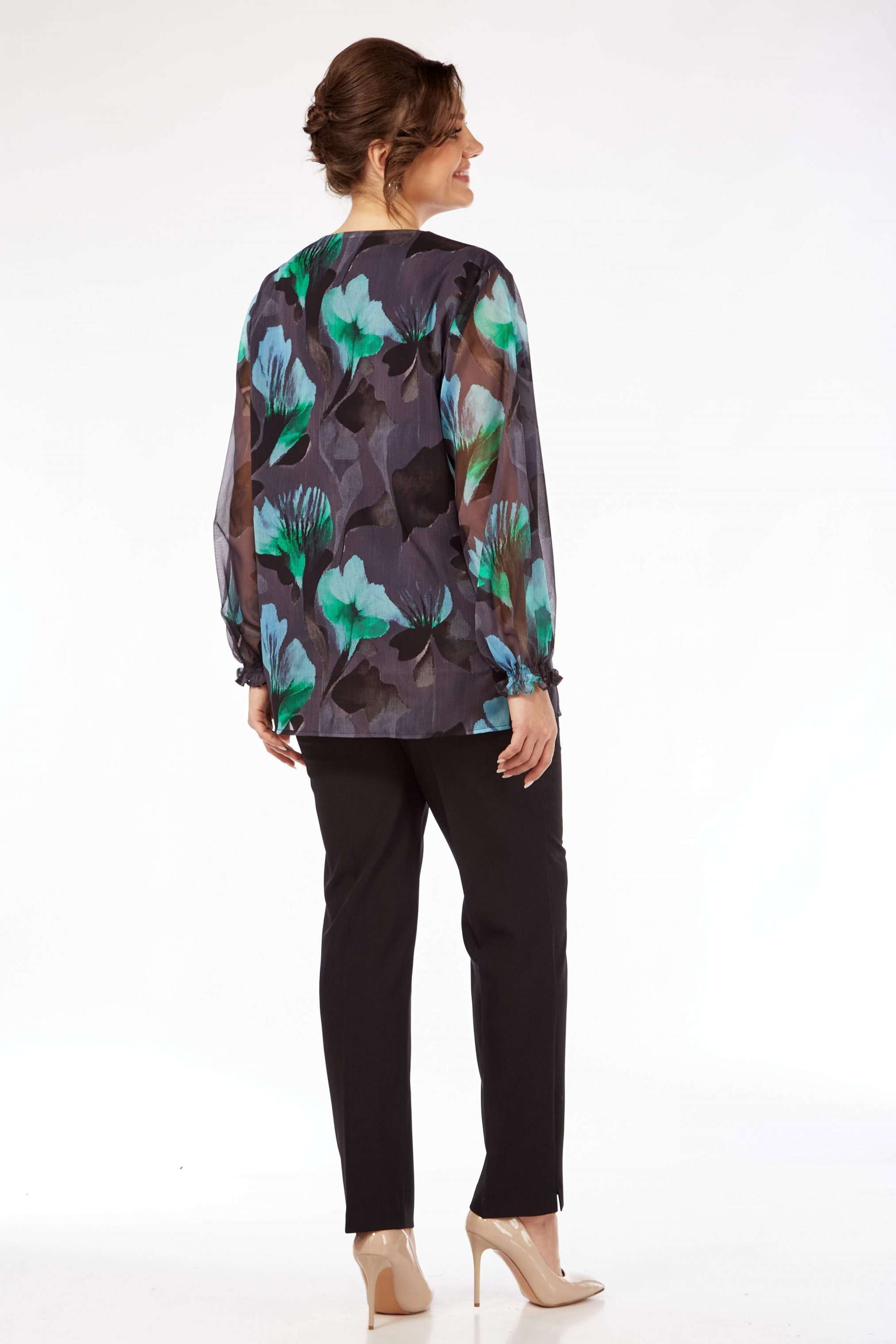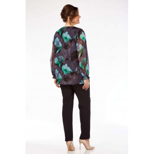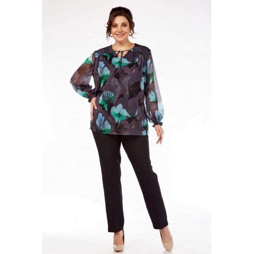 Комплект 2-ух предметный, состоит из блузки и брюк. Воздушная блуза, позволит чувствовать себя ярко и уверенно, выполнена из шифона на подкладке. Изделие свободного кроя, на полочке мягкие складки, придают легкость и комфорт. Вырез горловины V-образной формы. Рукав втачной, свободный, низ присборен. Брюки слегка зауженные к низу. Пояс притачной, частично на резинке.