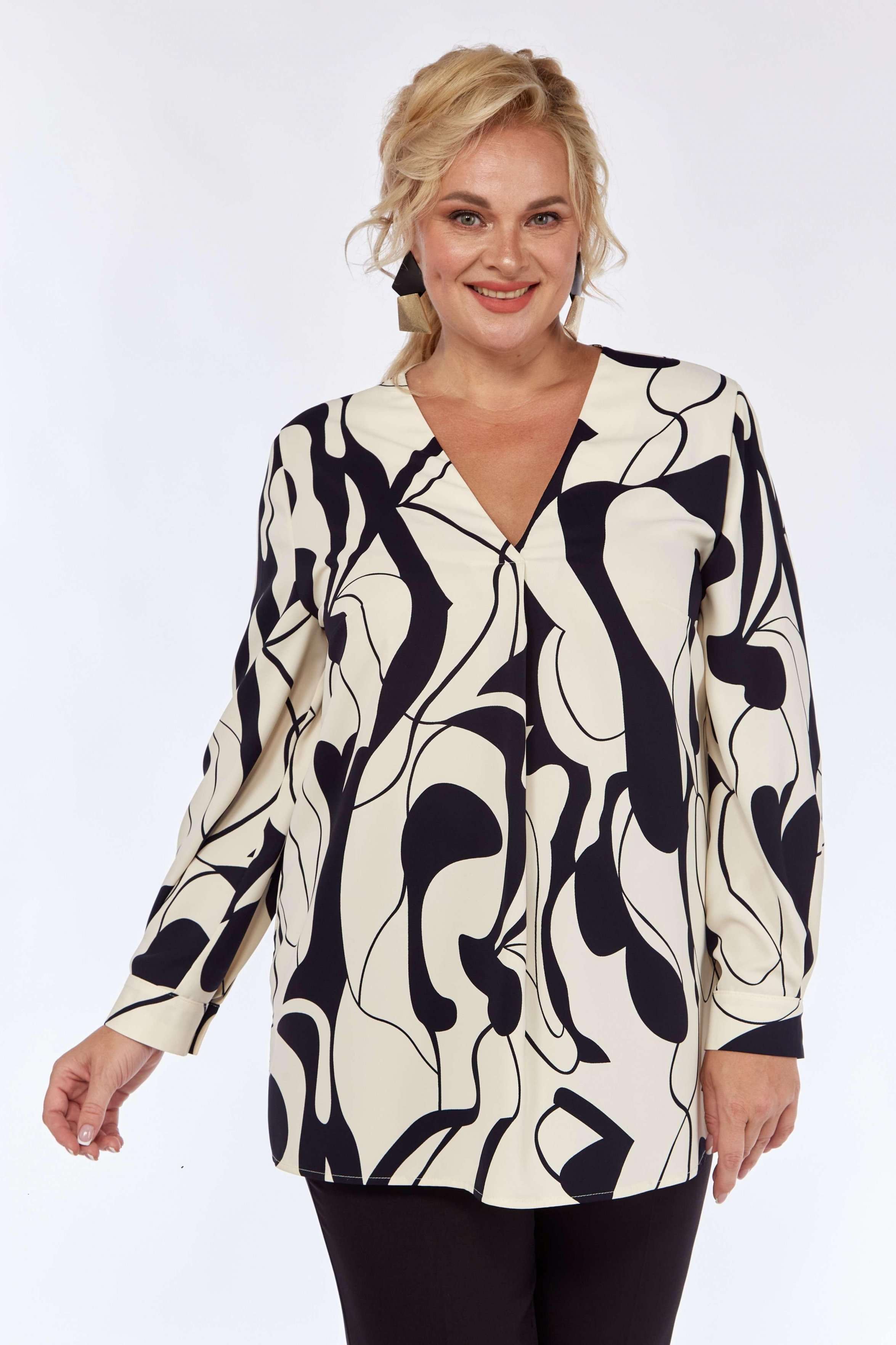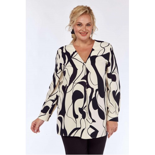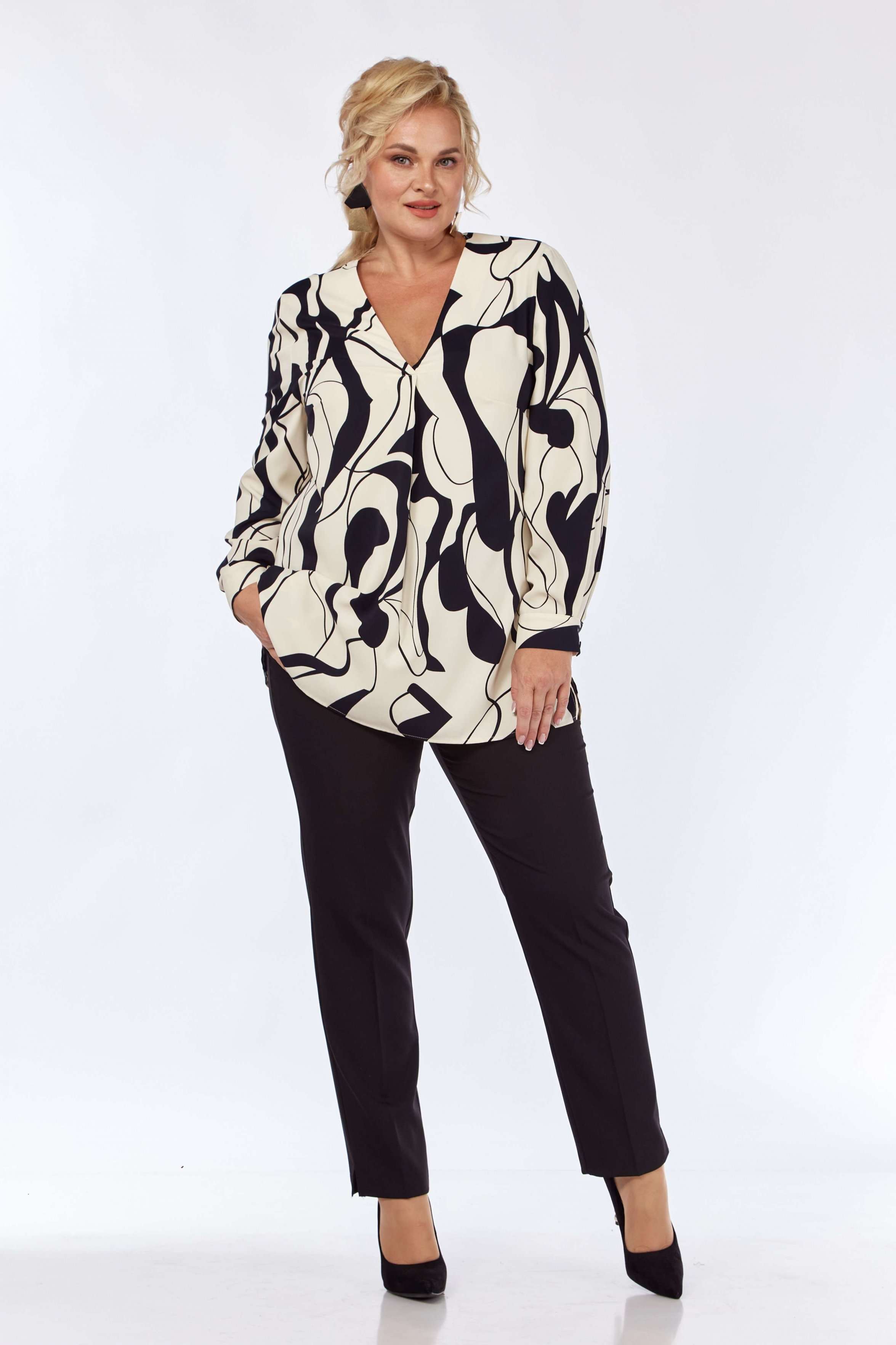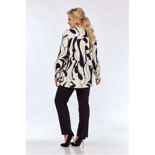 Стильный женский костюм состоит из блузки и брюк. Блуза свободного силуэта, выполнена из легкой струящейся ткани с модным принтом. По переду заложена складка для свободы движения. На спинке горизонтальный подрез с встречной складкой. По боковым швам у блузы разрезы. Рукав втачной одношовный с манжетой. Застегивается рукав на 2 петли и пуговицы. Брюки свободного прямого кроя с высокой посадкой, слегка заужены к низу, с заутюженными стрелками. На притачном поясе, частично по бокам на резинке. Застежка спереди брюк на молнию и петлю пуговицу