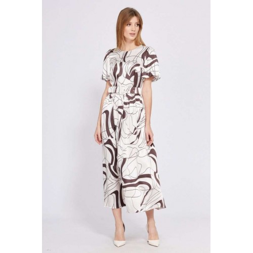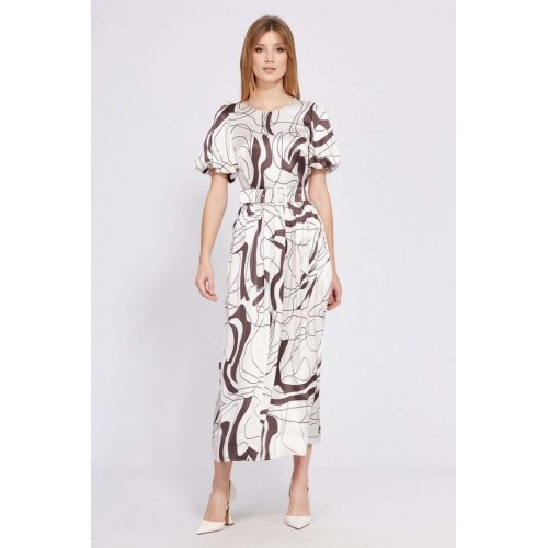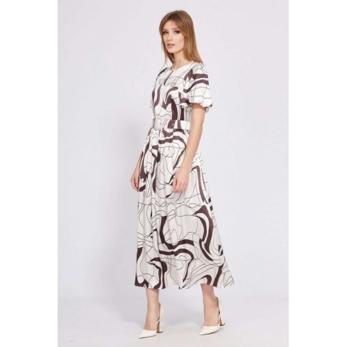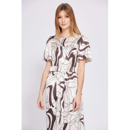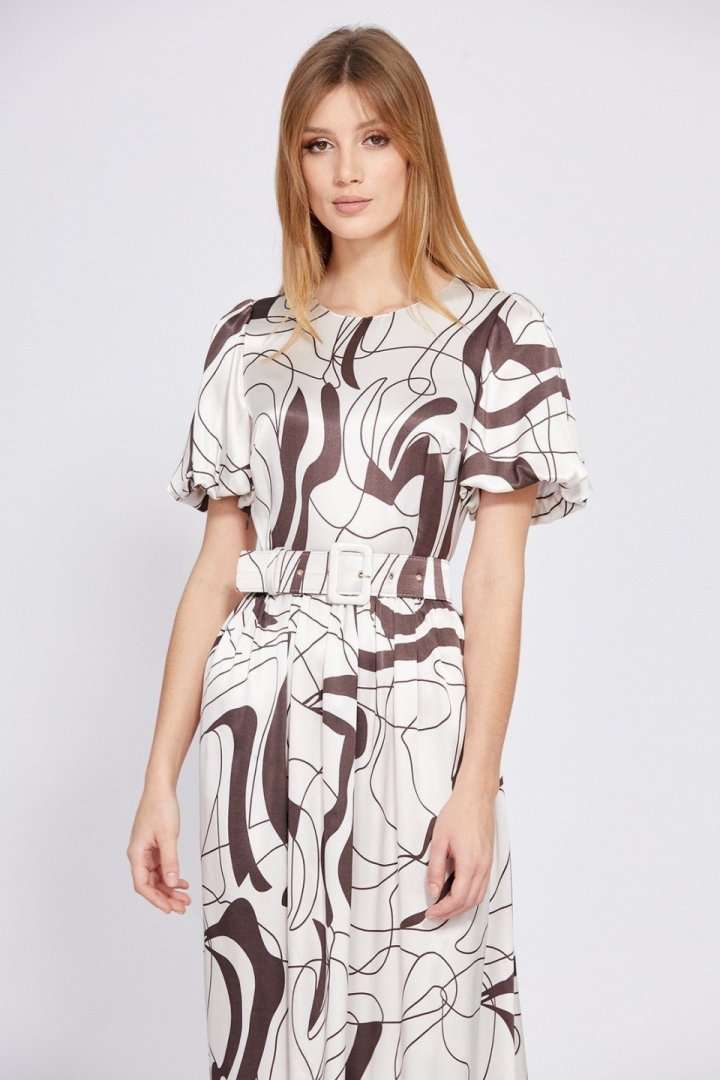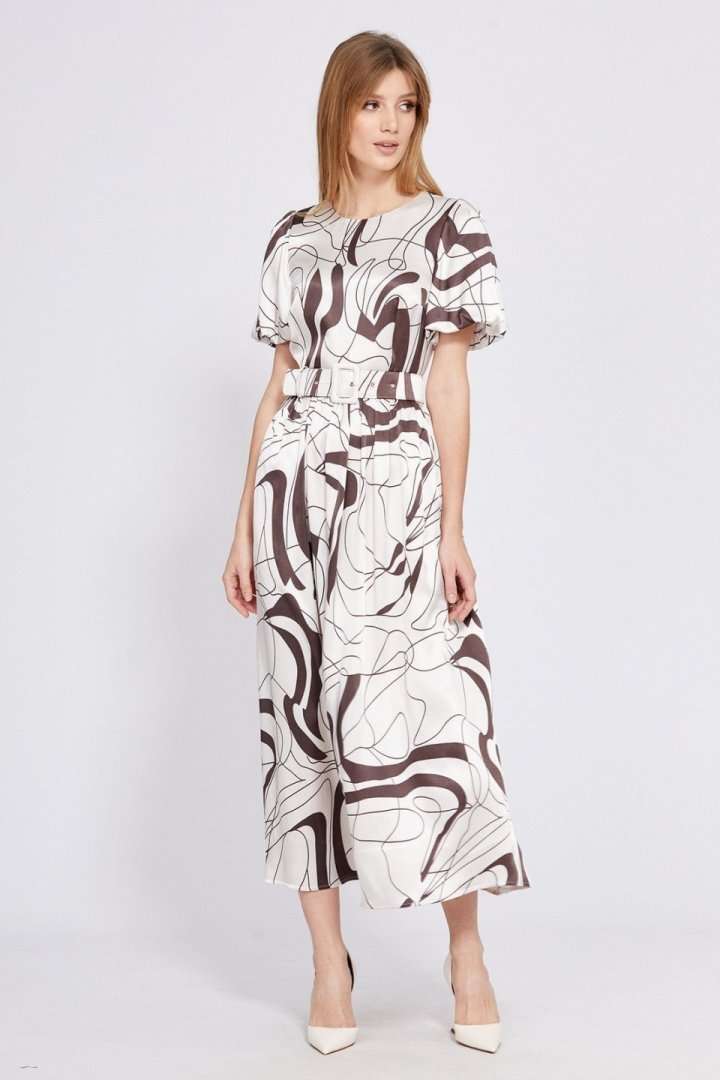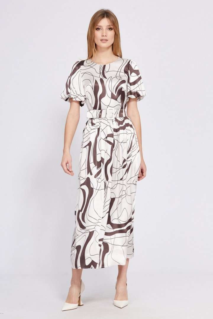 Платье выполнено из атласа с абстрактным принтом. Платье Х-образного силуэта, отрезное по линии талии, длиной миди. Застежка в среднем шве спинки на потайную молнию. Горловина округлой формы. Плечевой шов заужен. Рукав втачной, одношовный, расширенный и присборенный по низу, на притачной по низу подкладке. Юбка расширена к низу. Заднее полотнище со средним швом. В боковых швах карманы. Платье на отлетной по низу подкладке. В комплект входит съемный ремень с обтяжной пряжкой. Длина платья - 130 см. Длина рукава - 36 см. Гарантийный срок не установлен. Гост 25294 - 2003