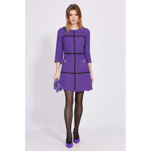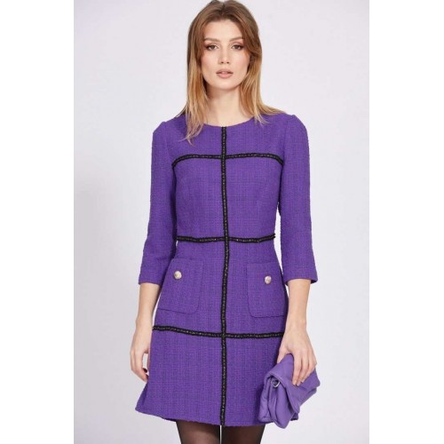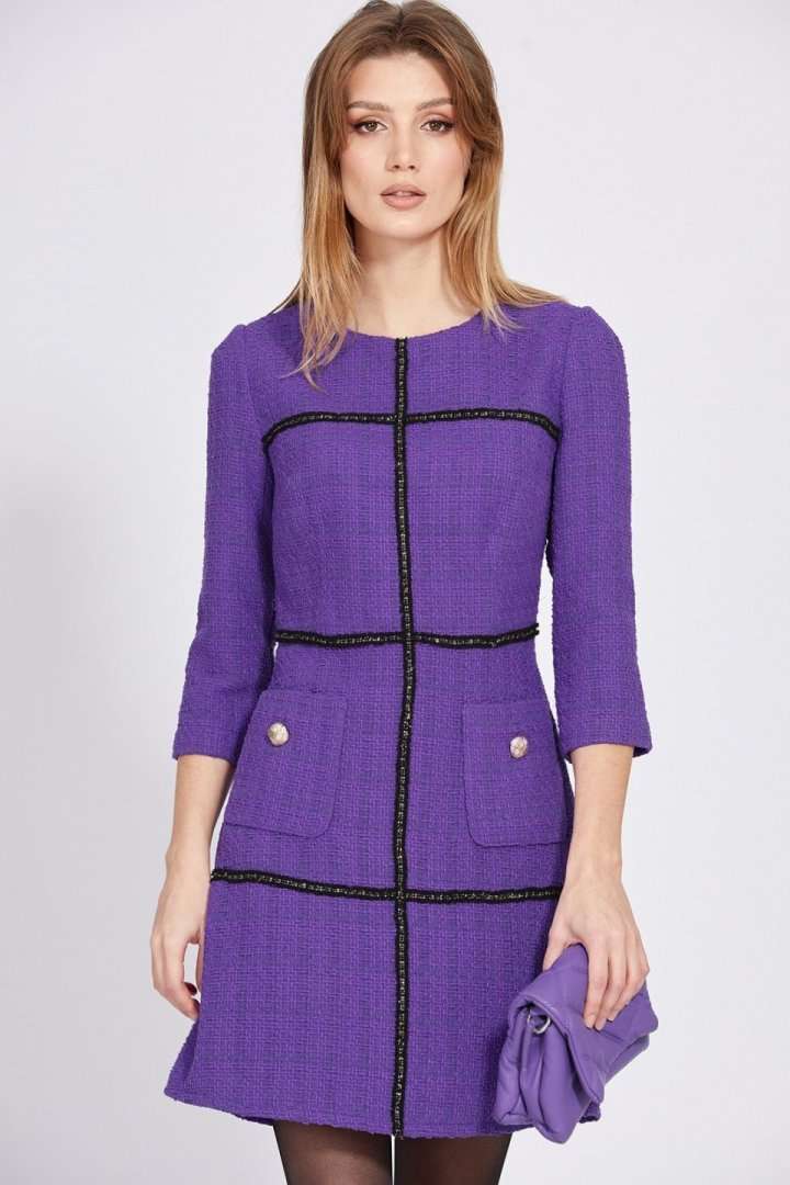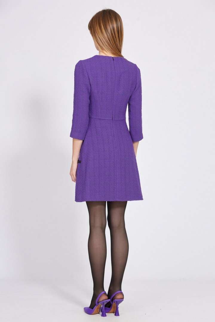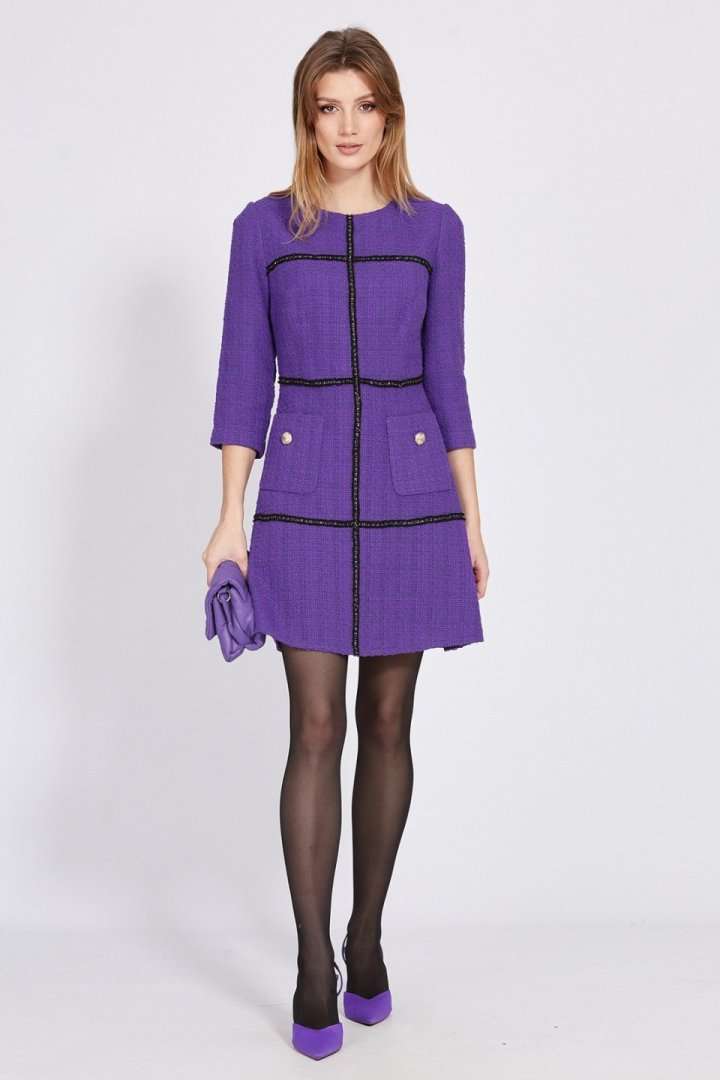 Платье выполнено из твида. Платье Х-образного силуэта, отрезное по линии талии, длиной выше линии колена. Застежка на потайную молнию в среднем шве спинки. Горловина округлой формы. Рукав втачного покроя, одношовный, длиной 3/4. Юбка расширена к низу. По переду два кармана с пуговицами. Заднее полотнище со средним швом. Платье на отлетной по низу подкладке. Платье декорировано тесьмой. Длина платья: р.42-46 - 88 см. Длина рукава: р.42-46 - 47 см. Гарантийный срок не установлен. Гост 25294 - 2003