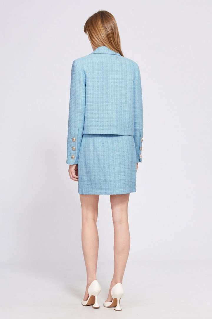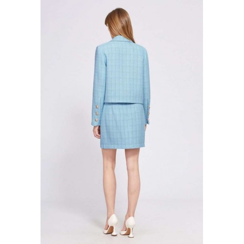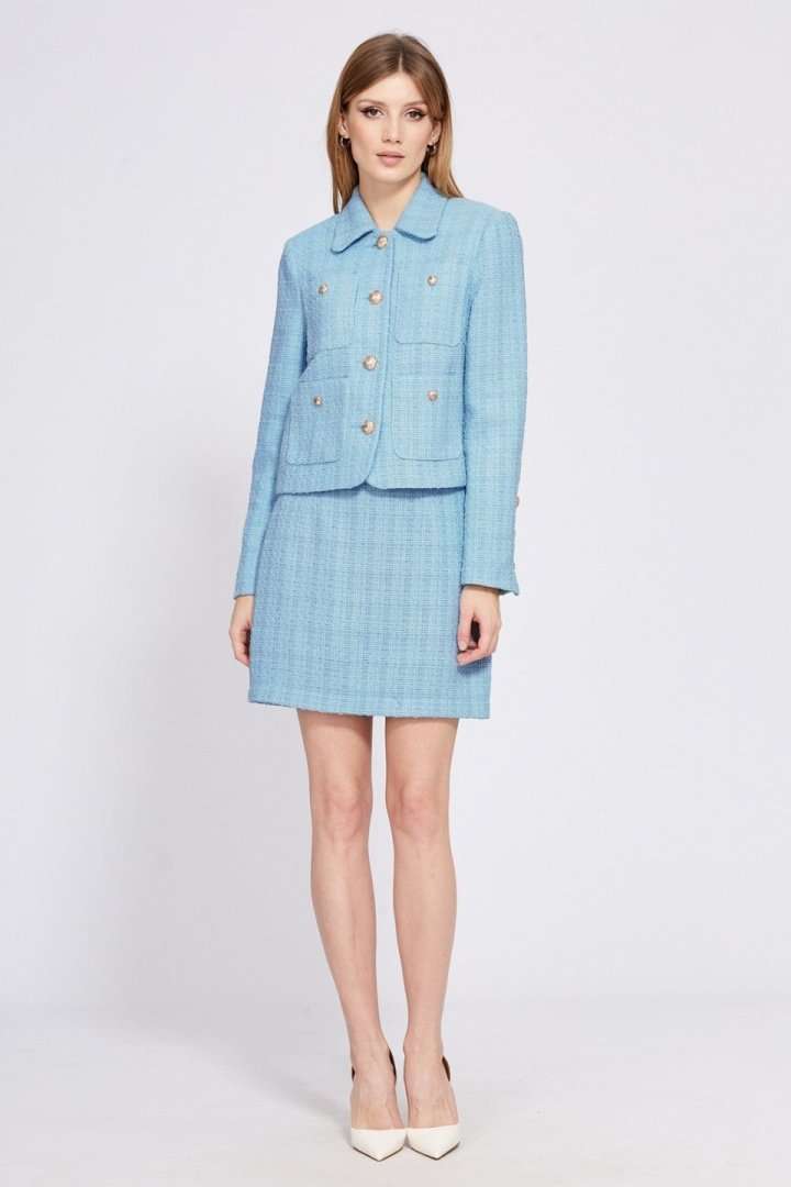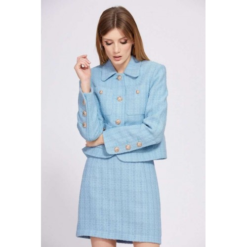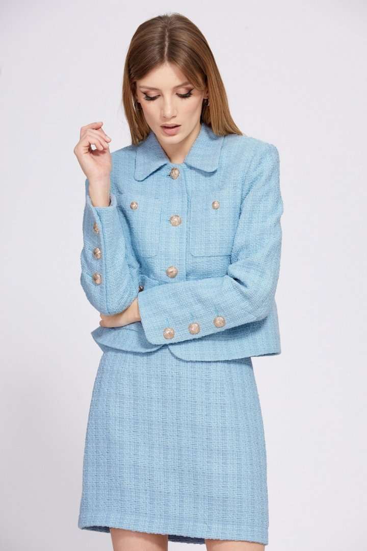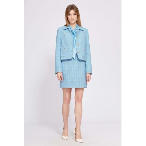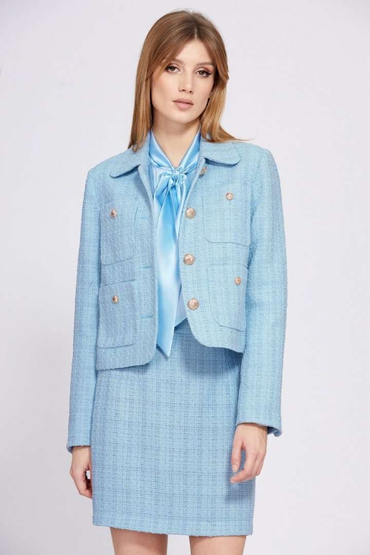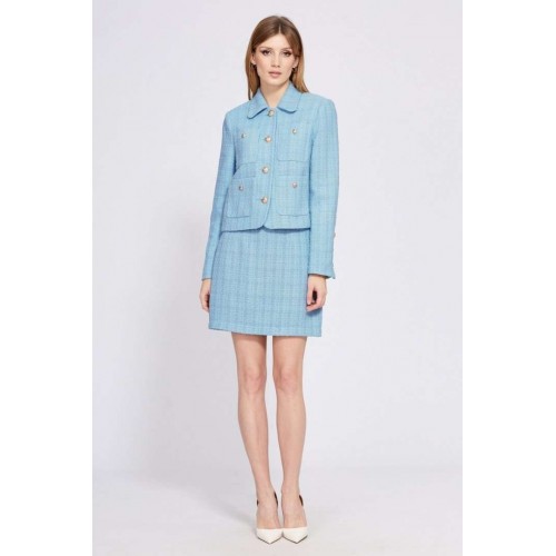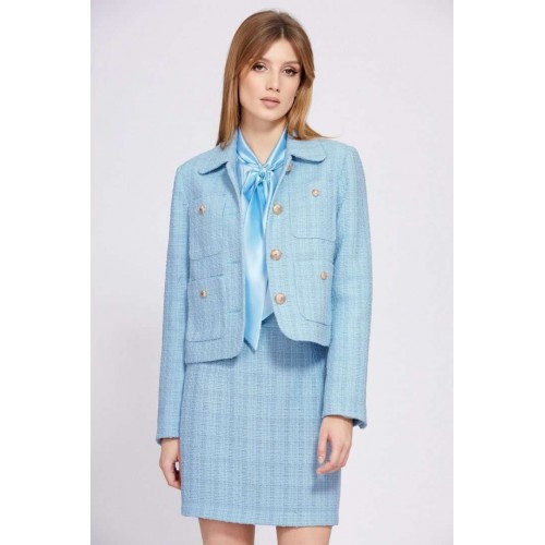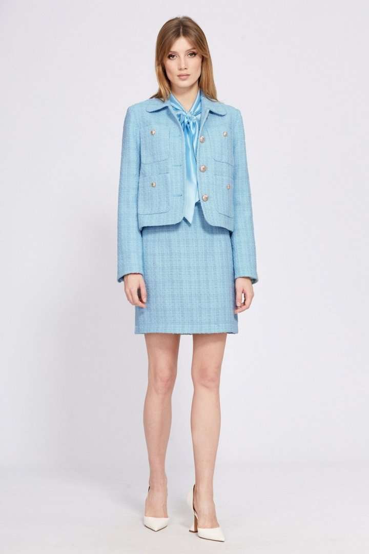 Комплект: жакет + юбка. Комплект выполнен из твида. Жакет прямого силуэта длиной выше линии бедер. Спереди две пары накладных карманов декорированых пуговицами. Застежка спереди центральная бортовая на пуговицы. Рукав втачной, двухшовный. По низу рукава шлица застегивающаяся на пуговицы. Жакет на притачной по низу подкладке. Юбка на притачном поясе, прямого силуэта, длиной выше линии колена. Застежка сзади в среднем шве на потайную молнию и пуговицу. Сзади в среднем шве разрез. Юбка на отлетной по низу подкладке. Длина жакета - 51,5 см. Длина рукава - 63 см. Длина юбки - 46 см. Гарантийный срок не установлен. Гост 25295-2003