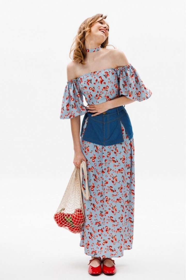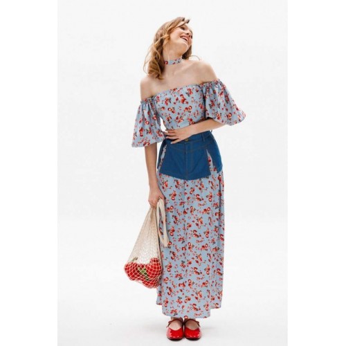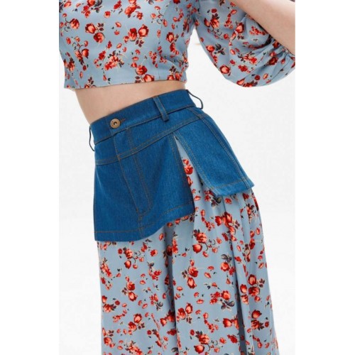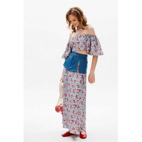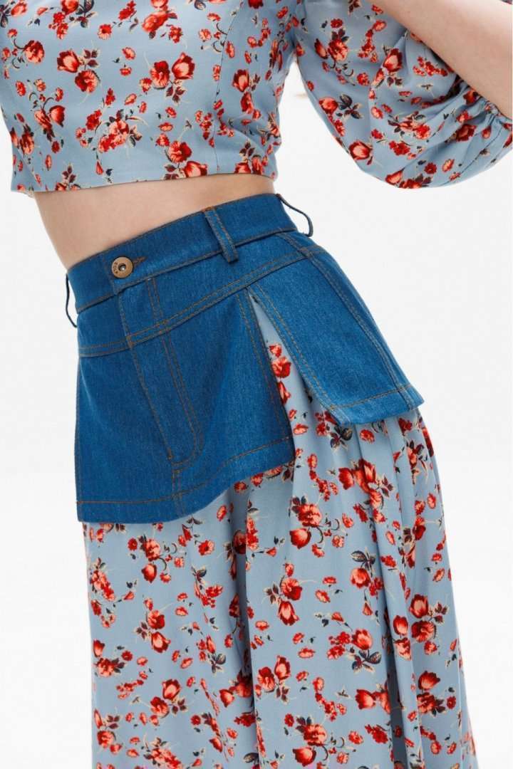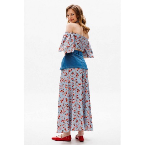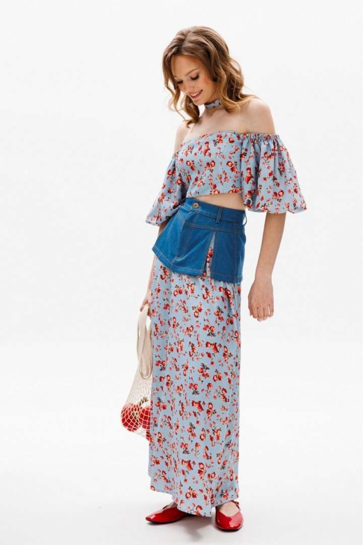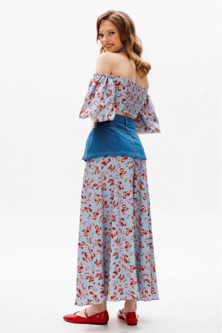 Юбка выполнена из плательной ткани с цветочным принтоЮбка А-образного силуэта, длиной миди. Юбка декорирована баской из джинса. Переднее и заднее полотнище цельные и расширенные к низу. Спереди застежка на молнию. Юбка на притачном поясе. Юбка без подкладки. Длина юбки: 100 с Гарантийный срок не установлен ГОСТ 25294 - 2003