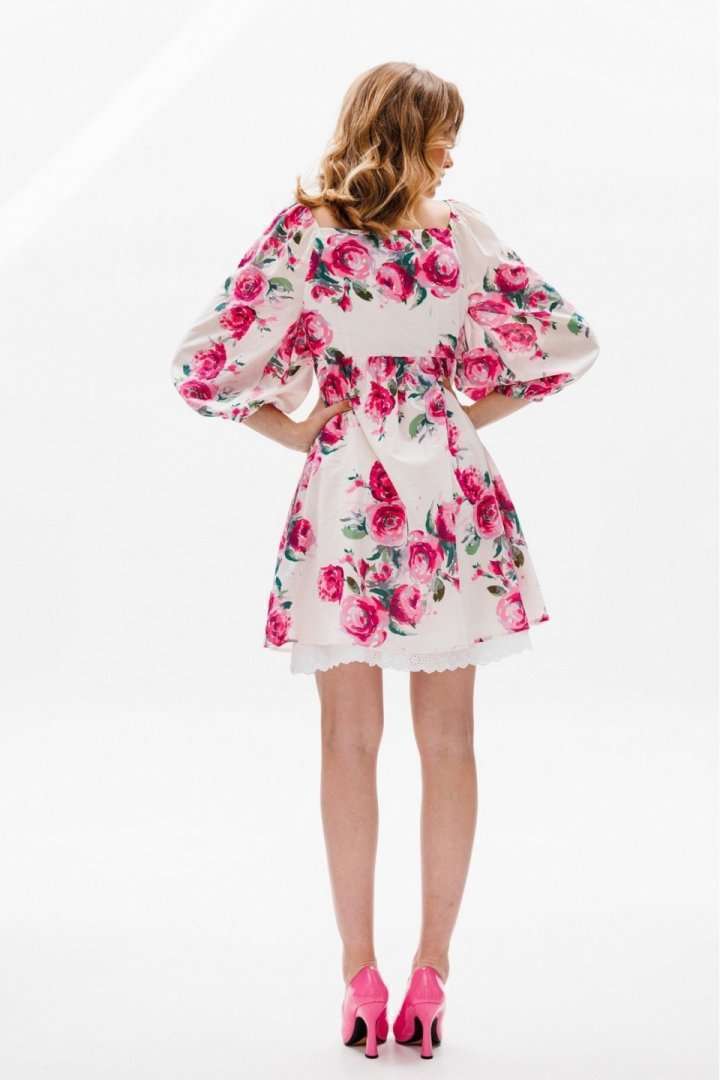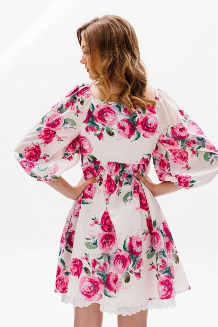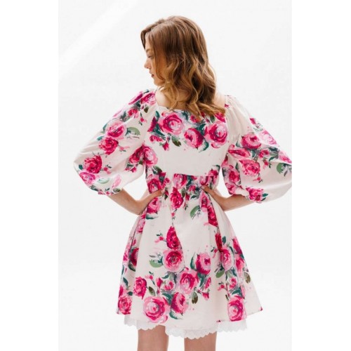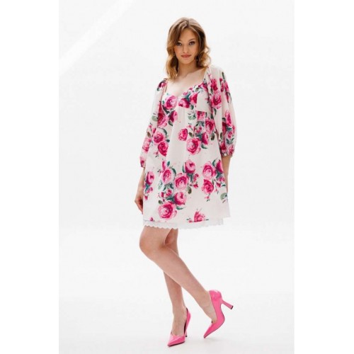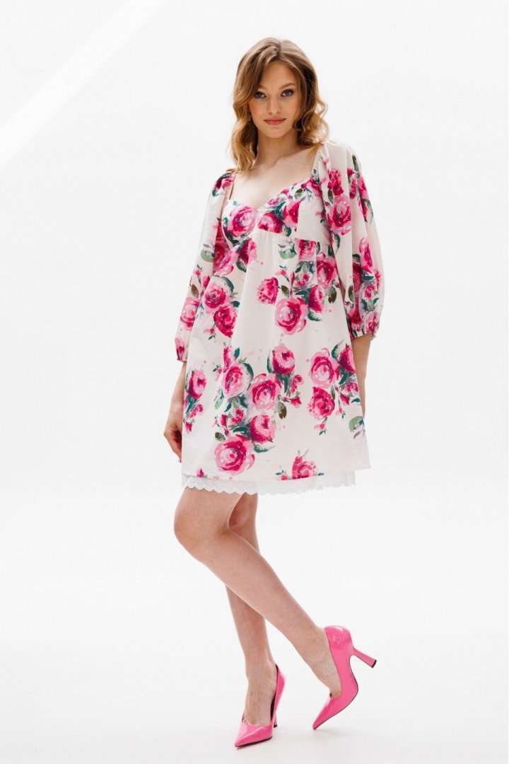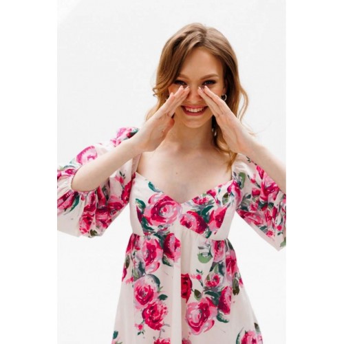 Платье выполнено из плательной ткани с цветочным принтоПлатье А-образного силуэта, длиной выше линии колена, отрезное под грудью. Горловина V-образной формы. Рукав покроя полуреглан со сборкой и эластичной тесьмой по окату, длиной чуть ниже линии локтя. Рукав расширен к низу, присборен и обработан эластичной тесьмой. В боковых швах карманы. В левом боковом шве застежка на потайную молнию. Платье на отлетной по низу подкладке с декоративным кружево Длина платья: 81 сДлина рукава: 54 см. Гарантийный срок не установлен ГОСТ 25294 - 2003