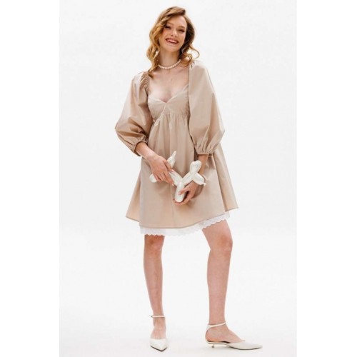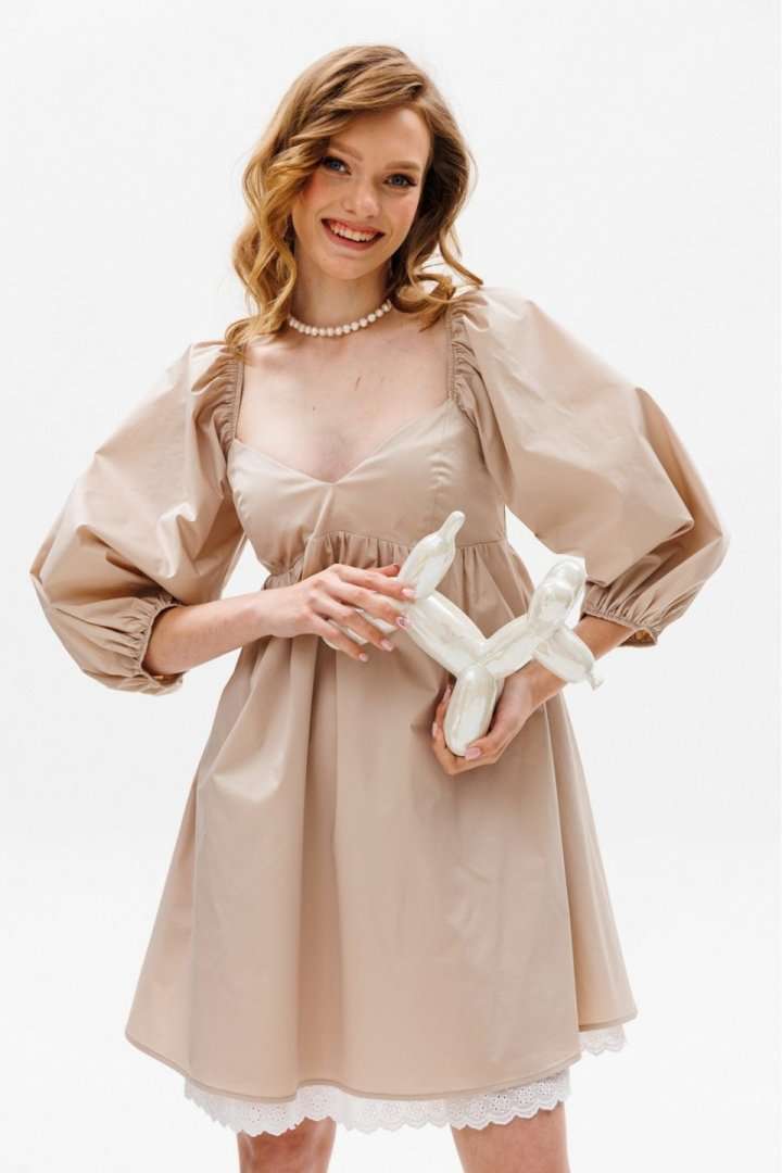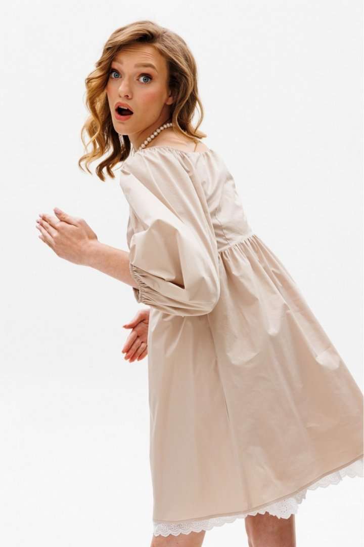 Платье выполнено из плательной ткани. Платье А-образного силуэта, длиной выше линии колена, отрезное под грудью. Горловина переда V-образной формы. Горловина спинки горизонтальной формы. Рукав покроя полуреглан со сборкой и эластичной тесьмой по окату, длиной чуть ниже линии локтя. Рукав расширен к низу, присборен и обработан эластичной тесьмой. Юбка расширена к низу. В боковых швах карманы. В левом боковом шве застежка на потайную молнию. Платье на отлетной по низу подкладке с декоративным кружевом. Длина платья: 81 см. Длина рукава: 54 см. Гарантийный срок не установлен ГОСТ 25294-2003