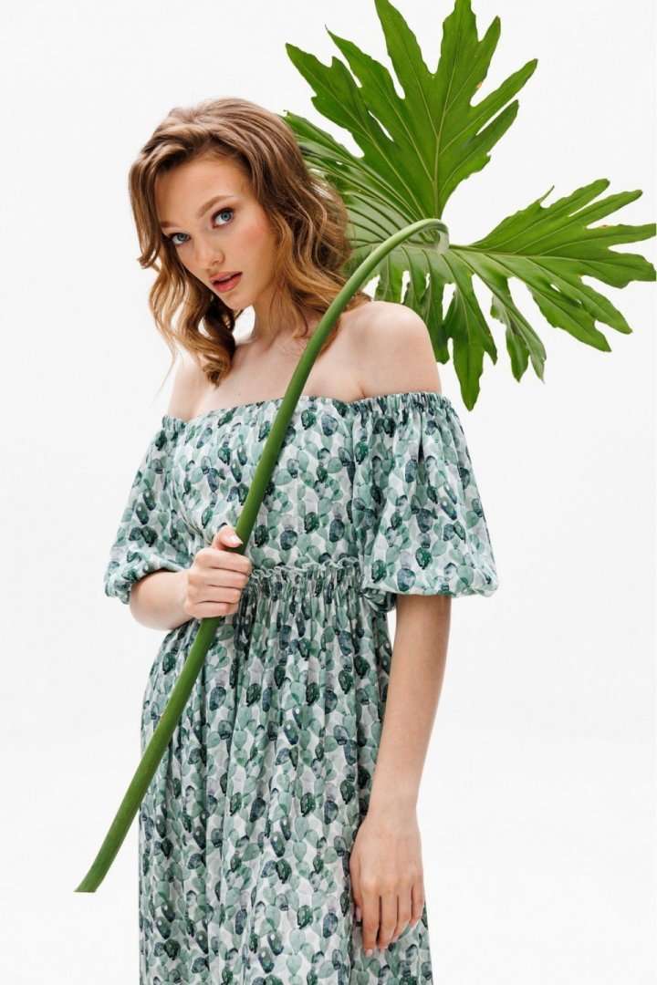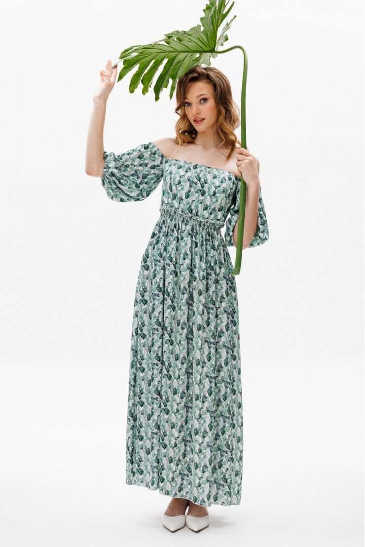 Платье выполнено из плательной ткани. Платье Х-образного силуэта. Центральная часть спинки собрана на венгерку. Рукав длиной до линии локтя, одношовный, расширенный. Верх и низ рукава обработаны эластичной тесьмой. Юбка расширена к низу. В боковых швах обработаны карманы. Юбка настрочена на лиф. Лиф платья на подкладке. Длина платья: 122 сДлина рукава: 36 с Гарантийный срок не установлен ГОСТ 25294-2003