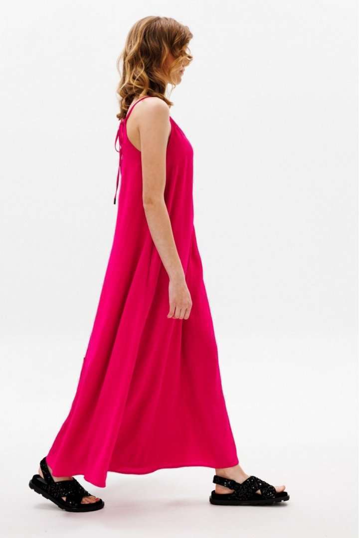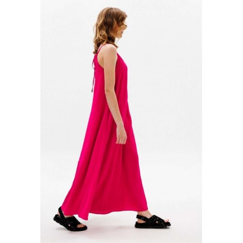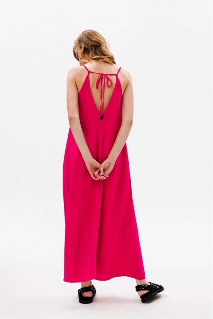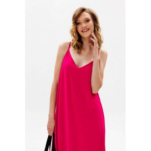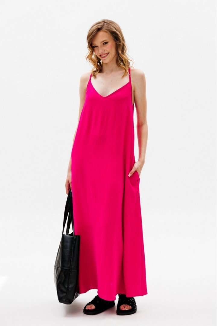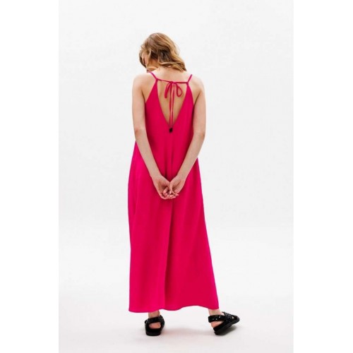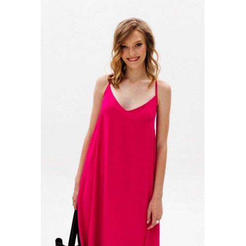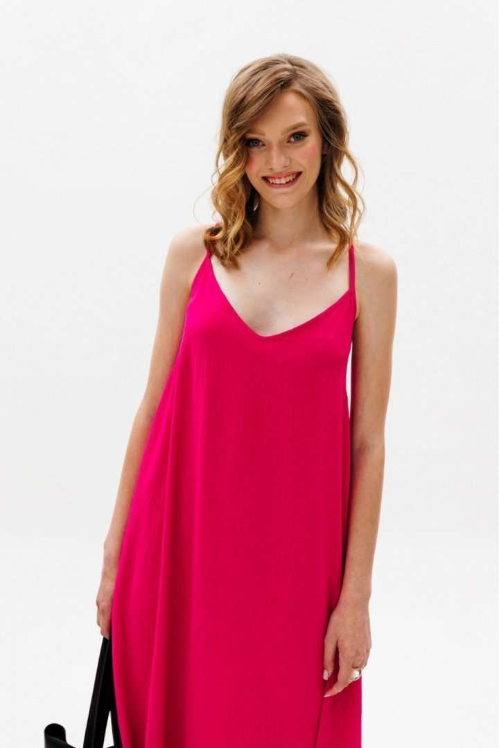 Сарафан выполнен из плательной ткани. Сарафан А-образного силуэта в виде платья-комбинации. Спинка со средним швом. Горловина V-образной формы. По спинке обработан фигурный вырез до линии талии. Бретели-завязки регулируются по длине. Длина сарафана: 97 см. Гарантийный срок не установлен ГОСТ 25294 - 2003