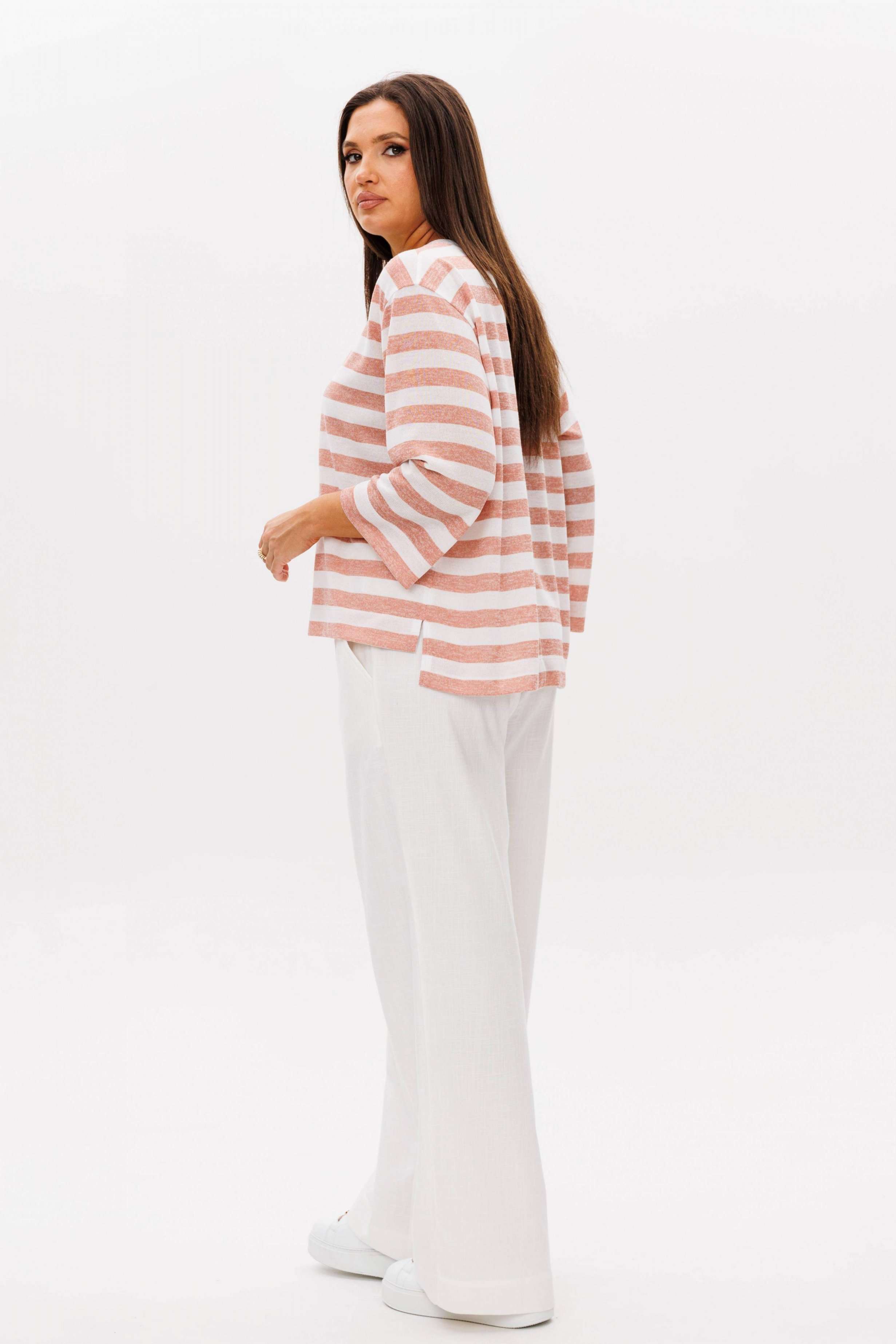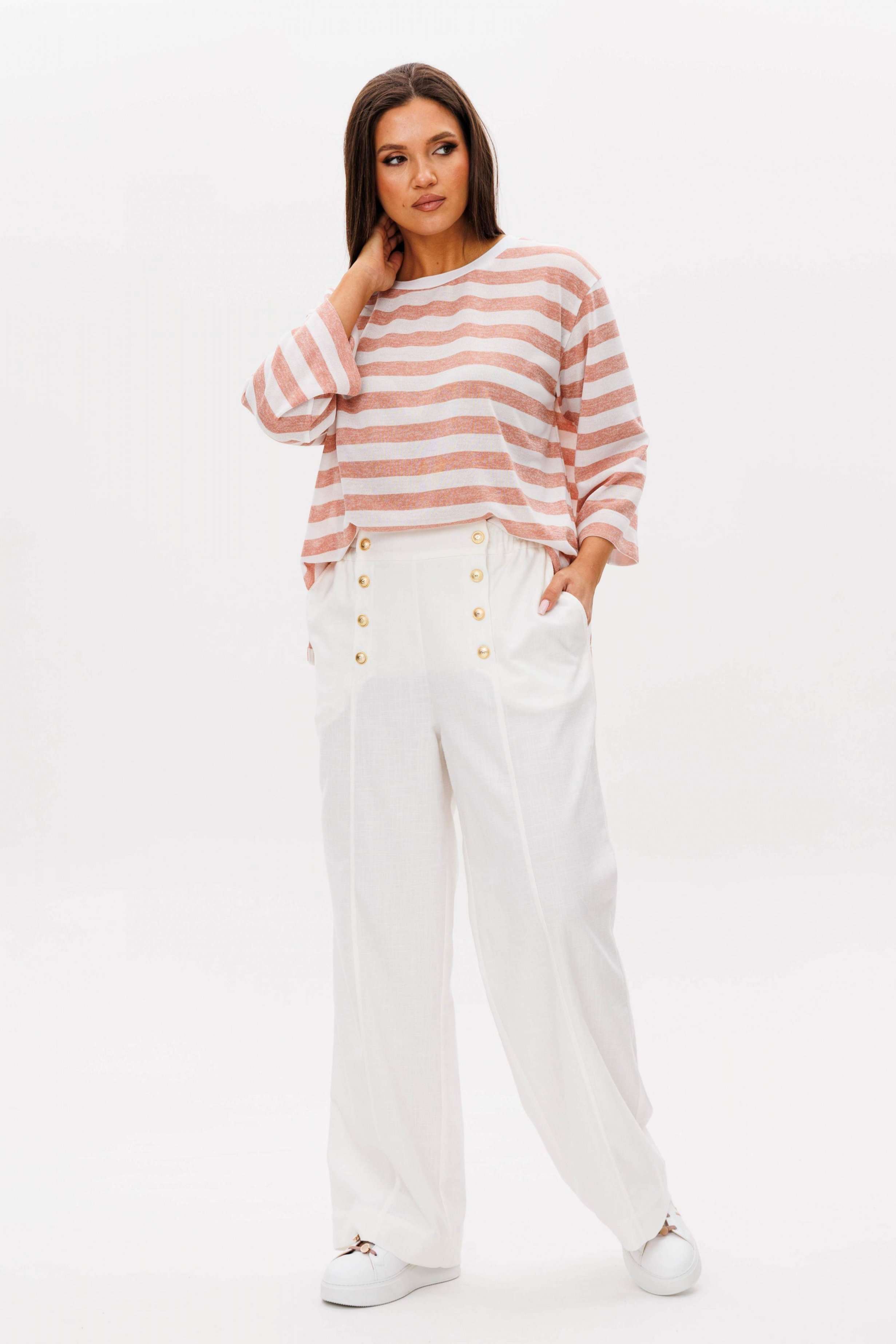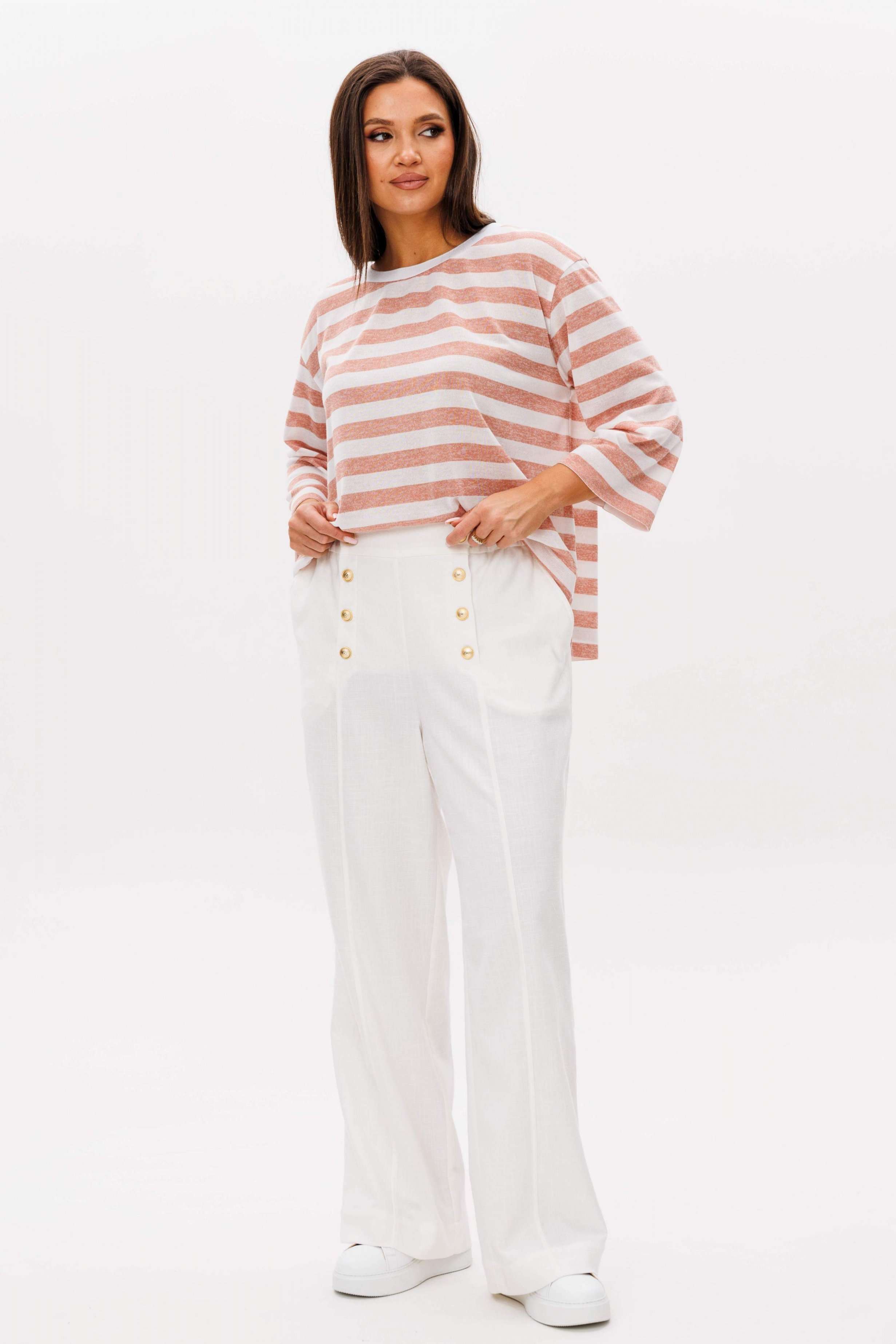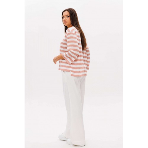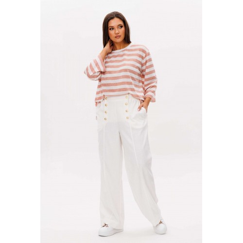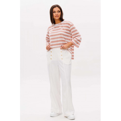 Костюм брючный 2-предметный. Воплотить уникальный образ на основе базовых вещей оказывается не так уж и сложно. Идеальное сочетание и пропорции-трикотажный джемпер в полоску и белые брюки с акцентной металлической фурнитурой. Такой комплект вы можете миксовать по собственному вкусу, дополняя уже имеющиеся в гардеробе вещи. Свободный, расширенный силуэт, рубашечный покрой, рукав расширенный в области оката. По горловине отделочная тесьма-довяз. Брюки из смесовой льняной ткани, свободного покроя, на притачном поясе, эластичном в области спинки и частично переда. Передние половинки брюк мс оригинальной застежкой, центральным швом и наклонными боковыми карманами. Длина джемпер около 67 см. Длина рукава около 30 см. Длина брюк около 104 см.