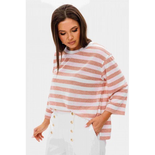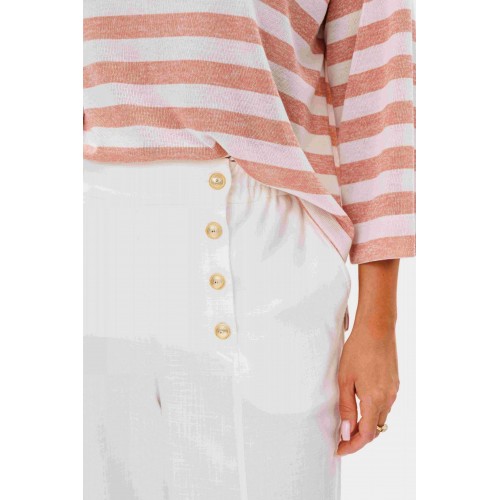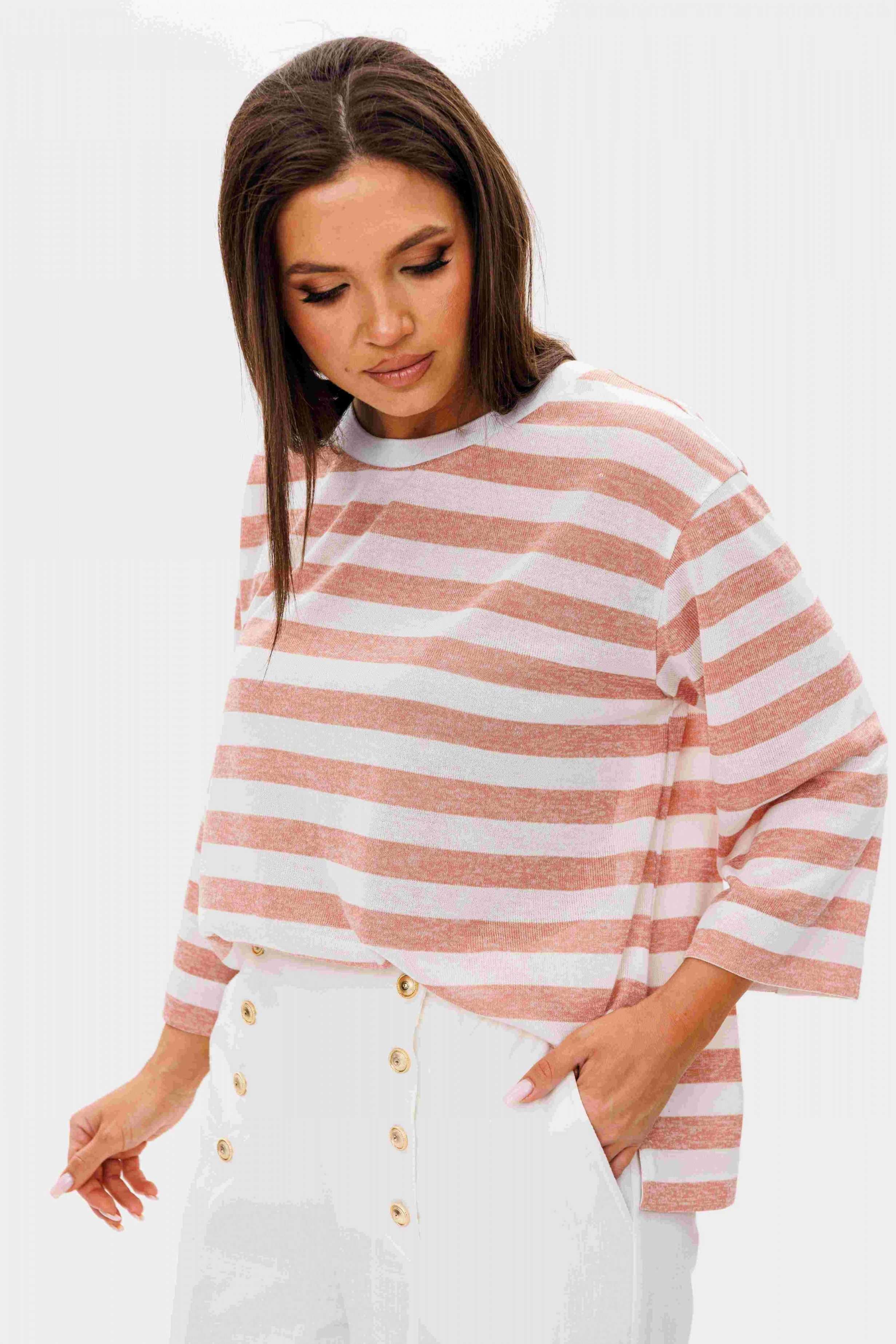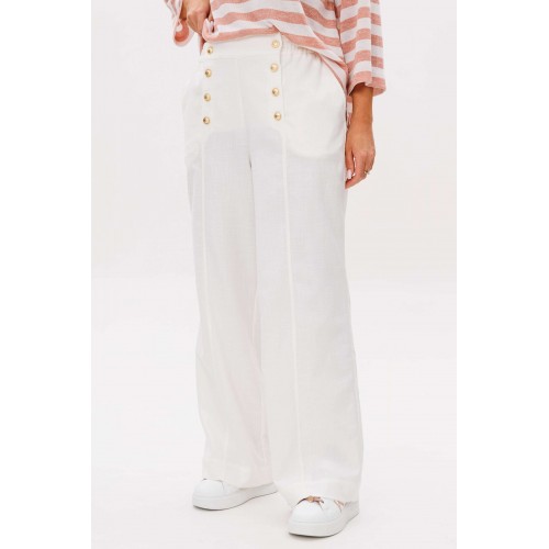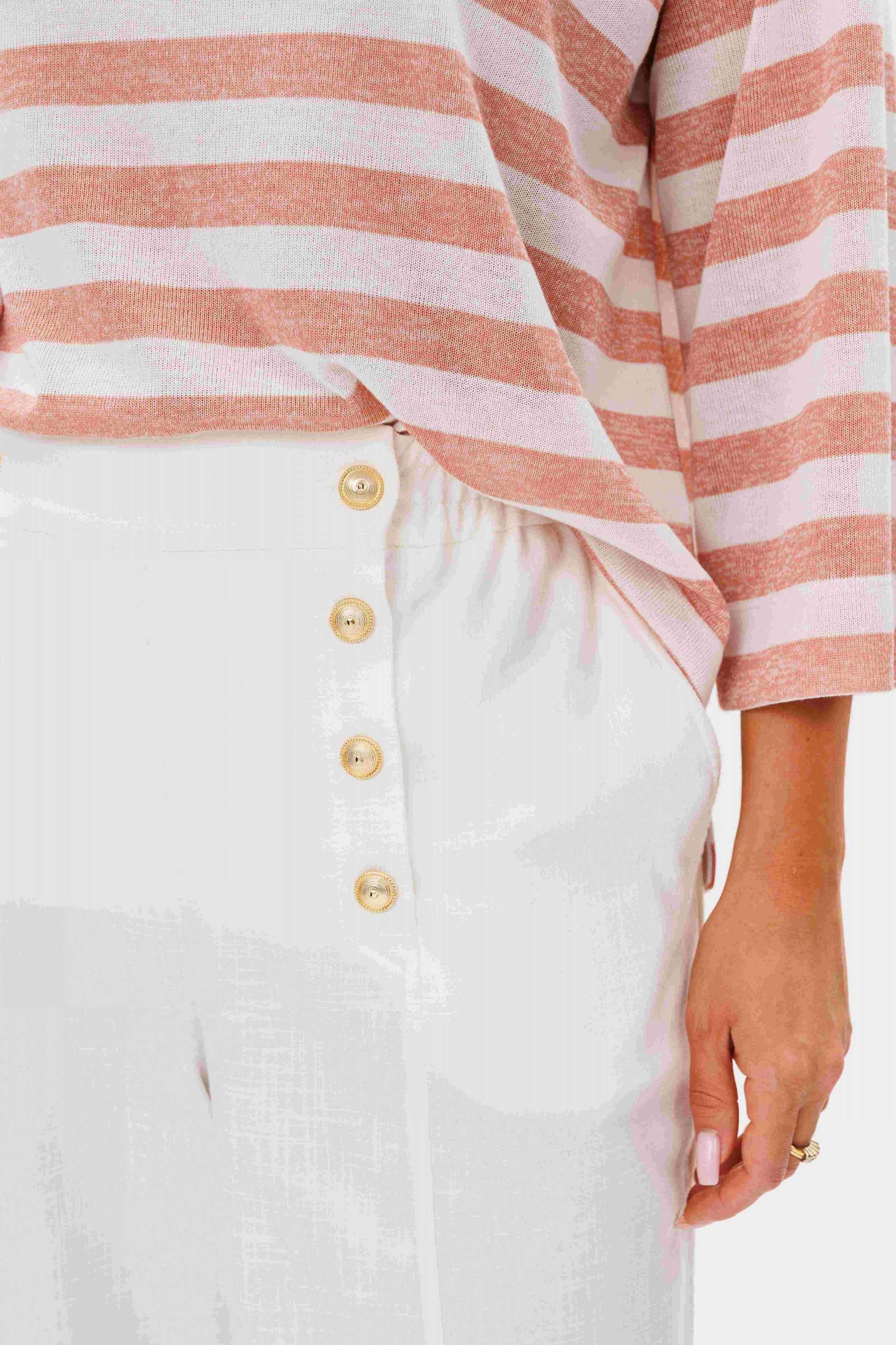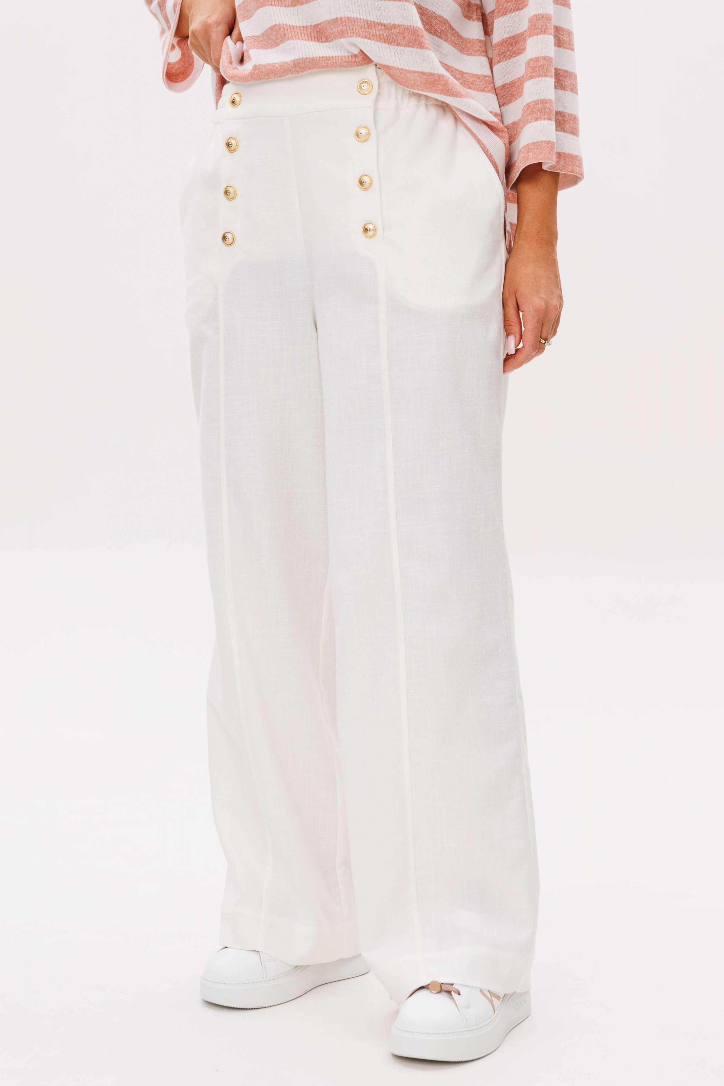 Костюм брючный 2-предметный. Воплотить уникальный образ на основе базовых вещей оказывается не так уж и сложно. Идеальное сочетание и пропорции-трикотажный джемпер в полоску и белые брюки с акцентной металлической фурнитурой. Такой комплект вы можете миксовать по собственному вкусу, дополняя уже имеющиеся в гардеробе вещи. Свободный, расширенный силуэт, рубашечный покрой, рукав расширенный в области оката. По горловине отделочная тесьма-довяз. Брюки из смесовой льняной ткани, свободного покроя, на притачном поясе, эластичном в области спинки и частично переда. Передние половинки брюк мс оригинальной застежкой, центральным швом и наклонными боковыми карманами. Длина джемпер около 67 см. Длина рукава около 30 см. Длина брюк около 104 см.