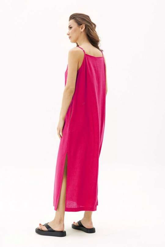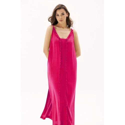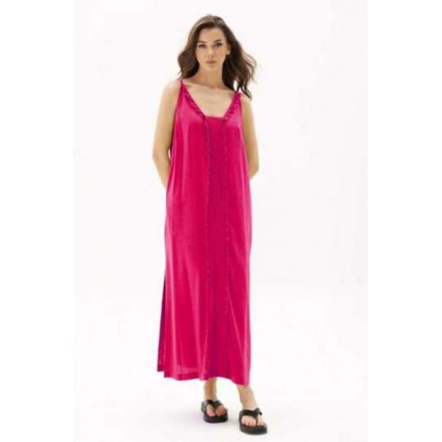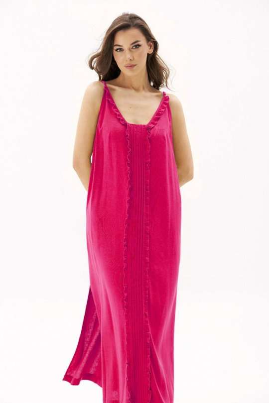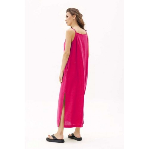 Самый классический и самый любимый вариант летнего сарафана - сарафан прямого кроя. Он не теряет своей популярности, ведь с ним очень легко создавать модные образы. Лаконичность и изысканность - вот главная идея нашего сарафана. Полочка со сложным вырезом, нагрудной вытачкой, отрезной центральной частью с защипами и кокетливой рюшей. Спинка со средним швом. По боковым швам карманы и эффектные разрезы. Бретель тонкая, регулирующаяся. Длина сарафана около 132 см.