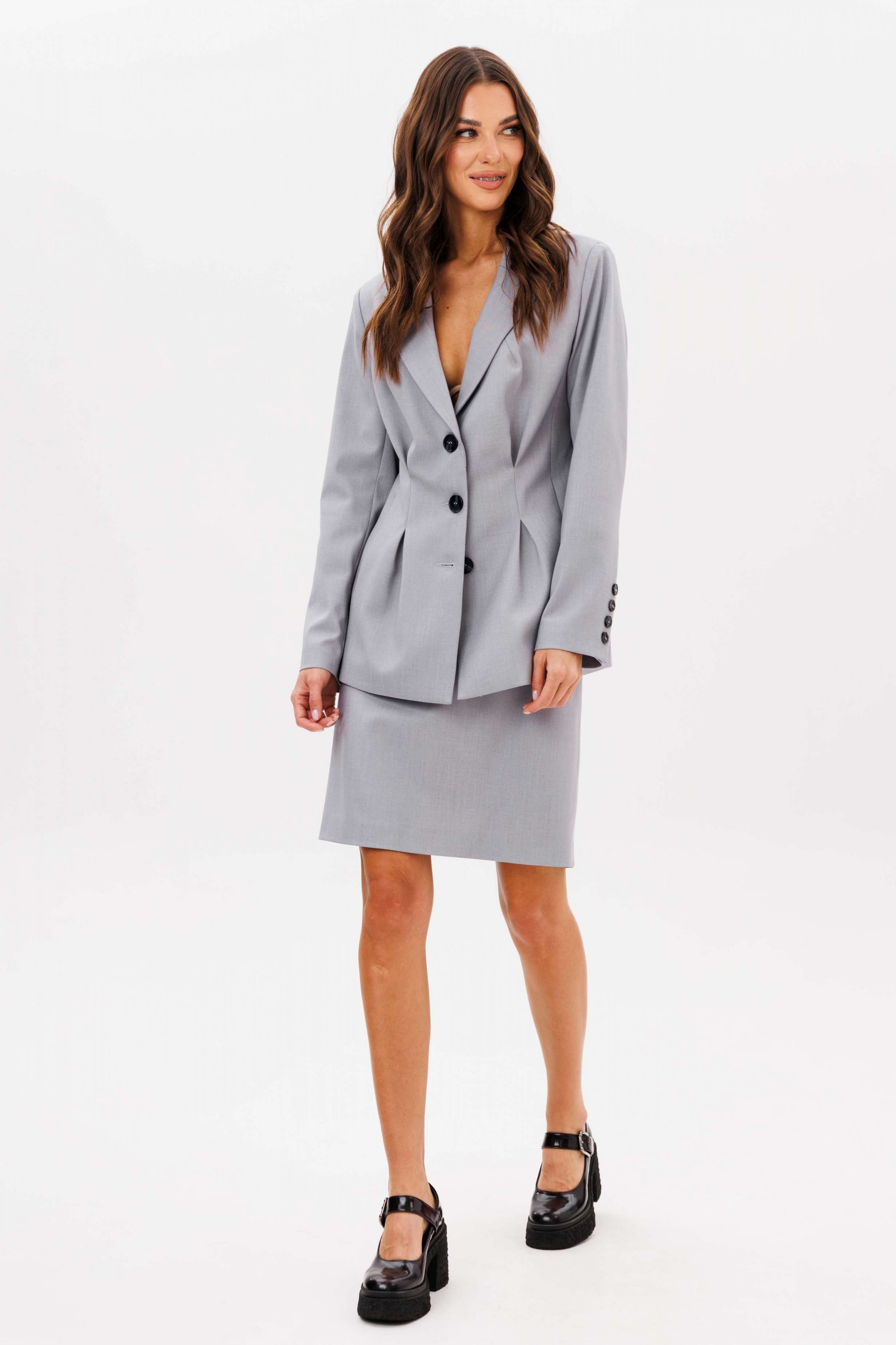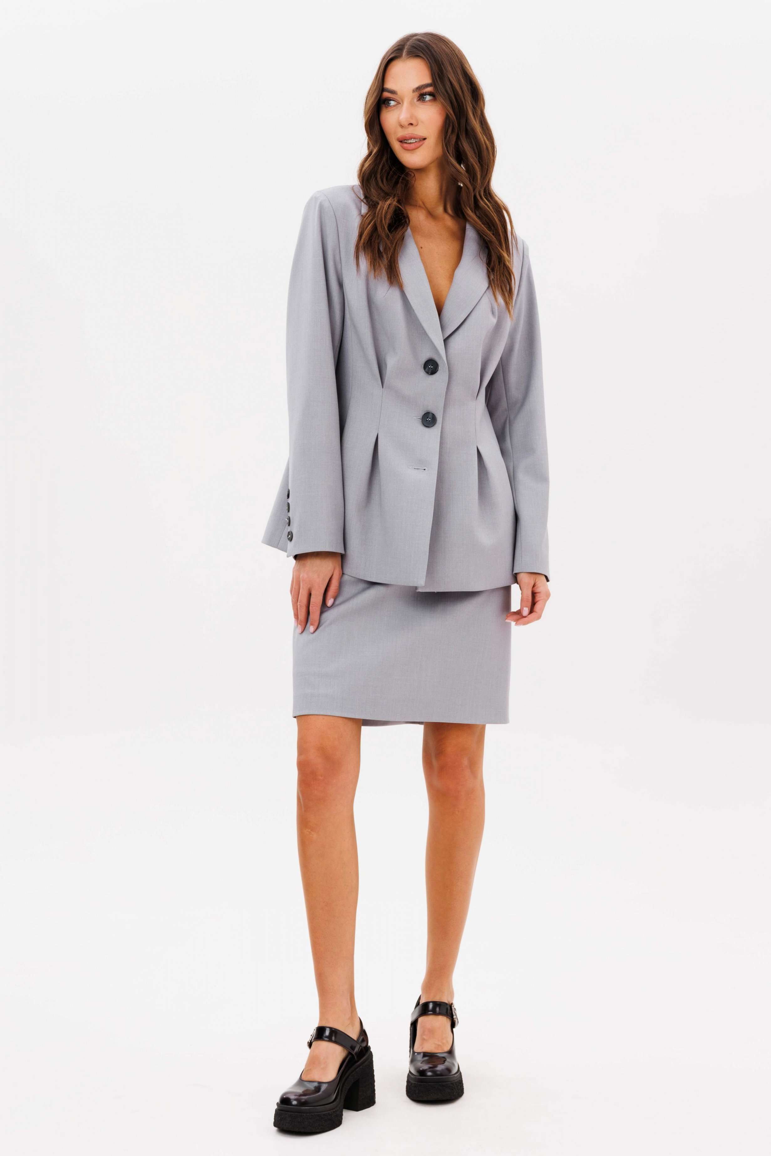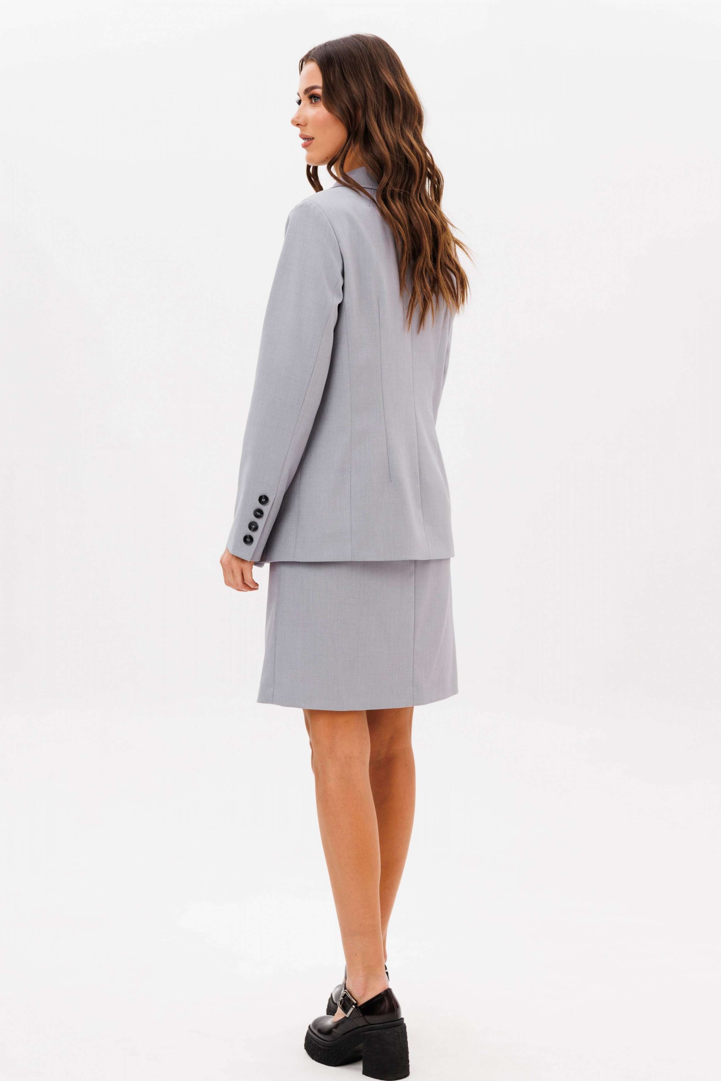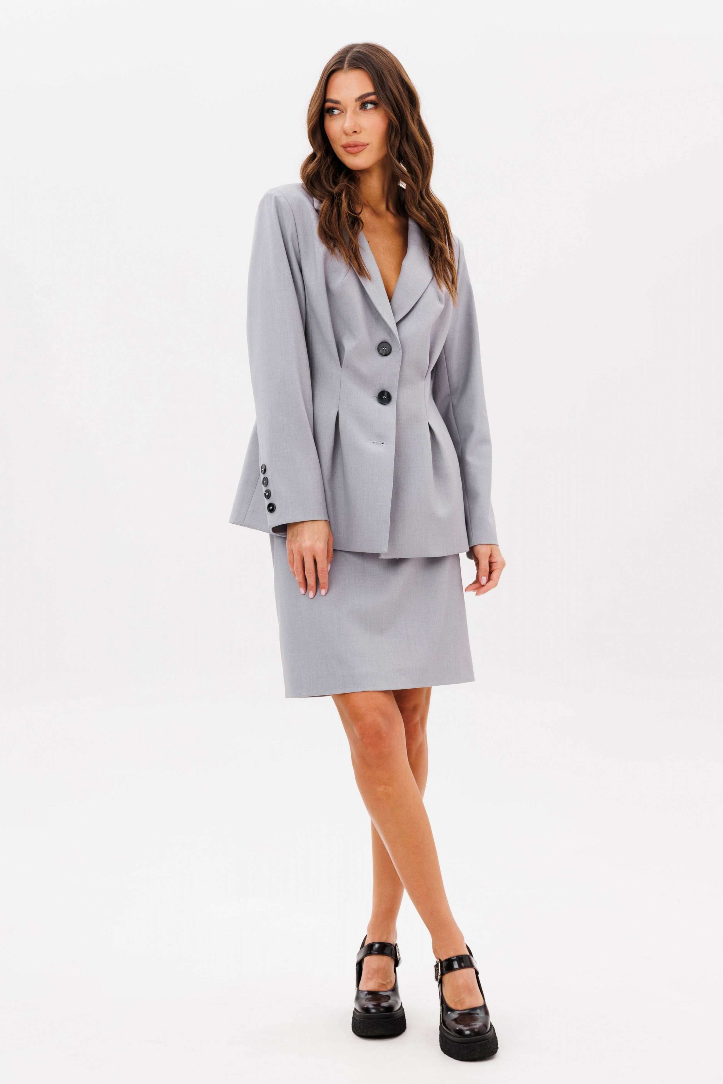 Итак... Весна 2025! Феерия костюмов продолжается! Такой комплект просто необходим в повседневной капсуле, ведь мы давно уже перестали приравнивать его к деловому стилю. Предметы костюма легко можно носить по отдельности и сочетать со многими вещами из уже имеющегося гардероба. Пиджак полуприлегающего силуэта, втачного покроя с центральной застежкой и классическим английским воротником. Полочка с отрезным бочком, с вытачкой защипом и боковым вертикальным карманом. Спинка с центральным швом, боковым рельефом и талиевой и плечевой вытачкой. Рукав двухшовный с отлетной шлицей с отделочными пуговицами. Юбка прямая, длинной колена, на притачном поясе, эластичном в области спинки, талиевыми вытачками по заднему полотнищу и застежкой в боковом шве. Длина жакета около 67 см. Длина рукава около 60 см. Длина юбки около 50 см.