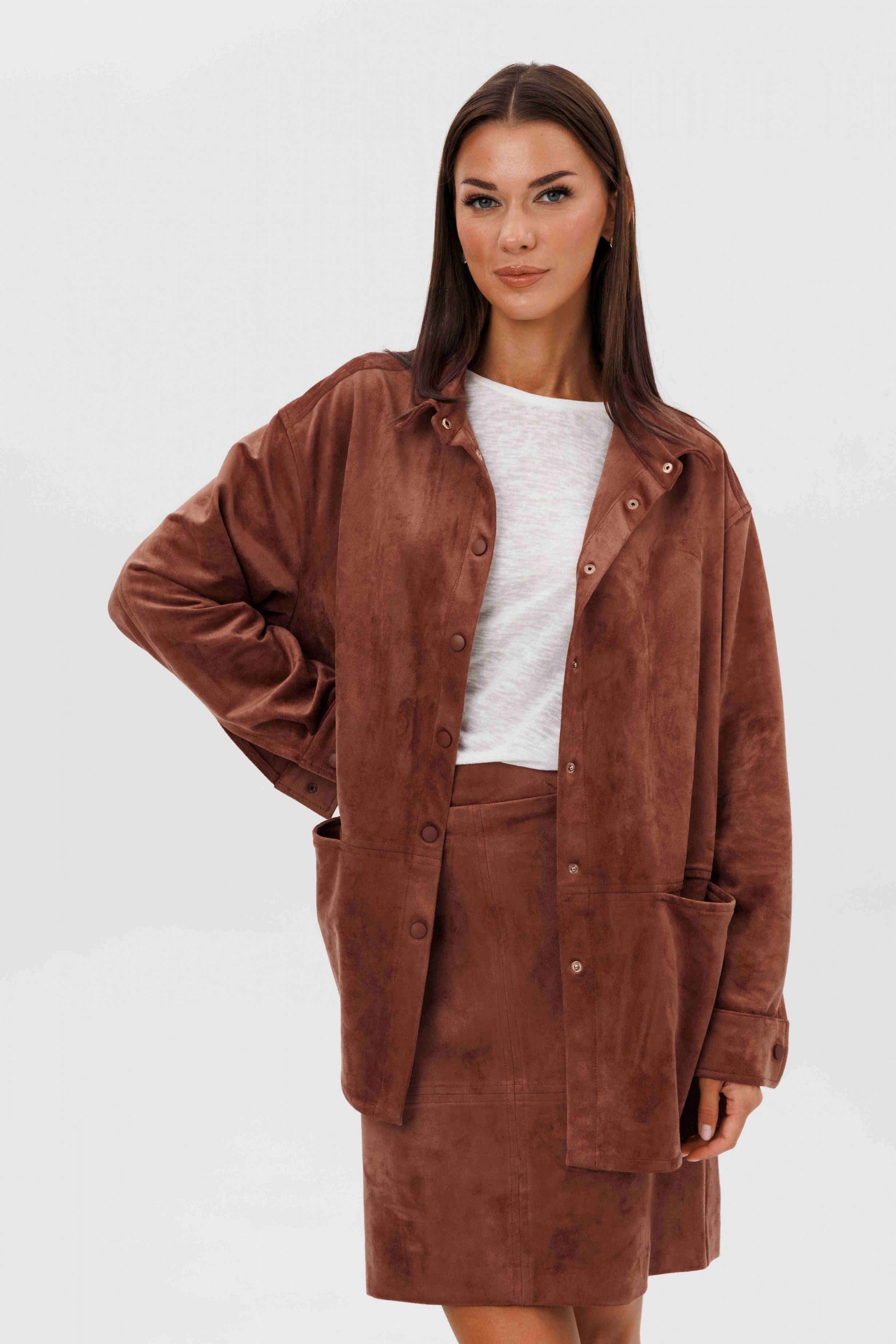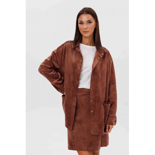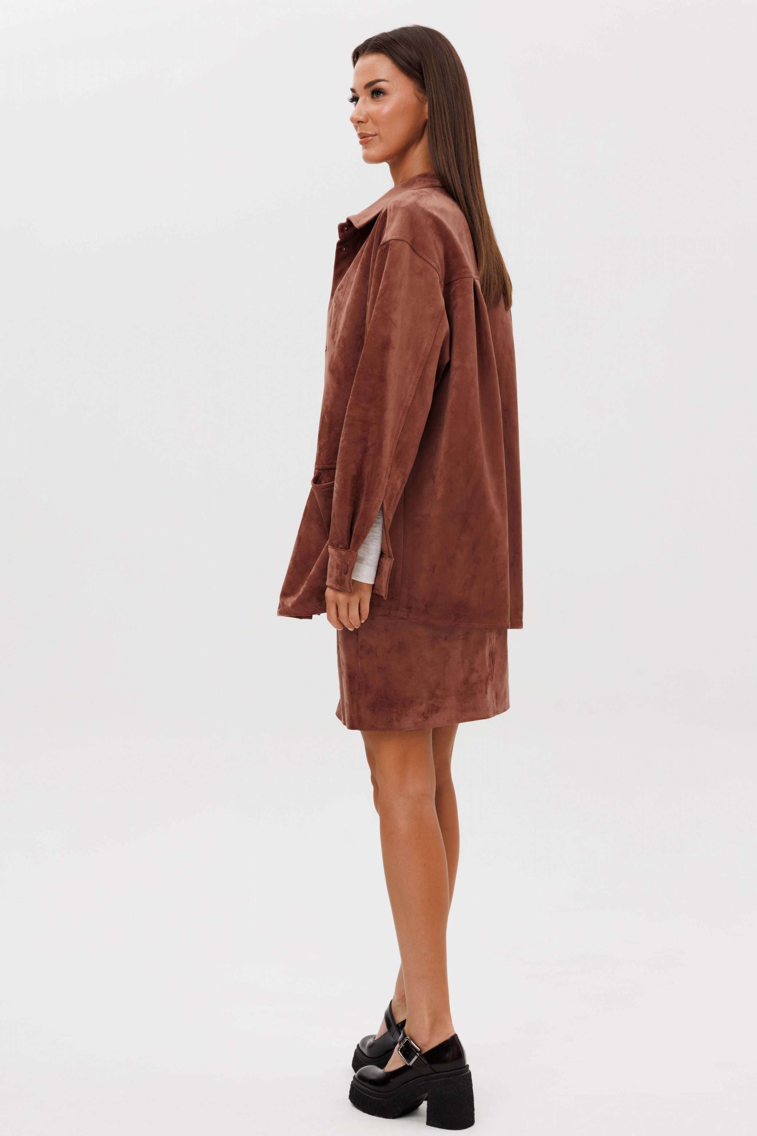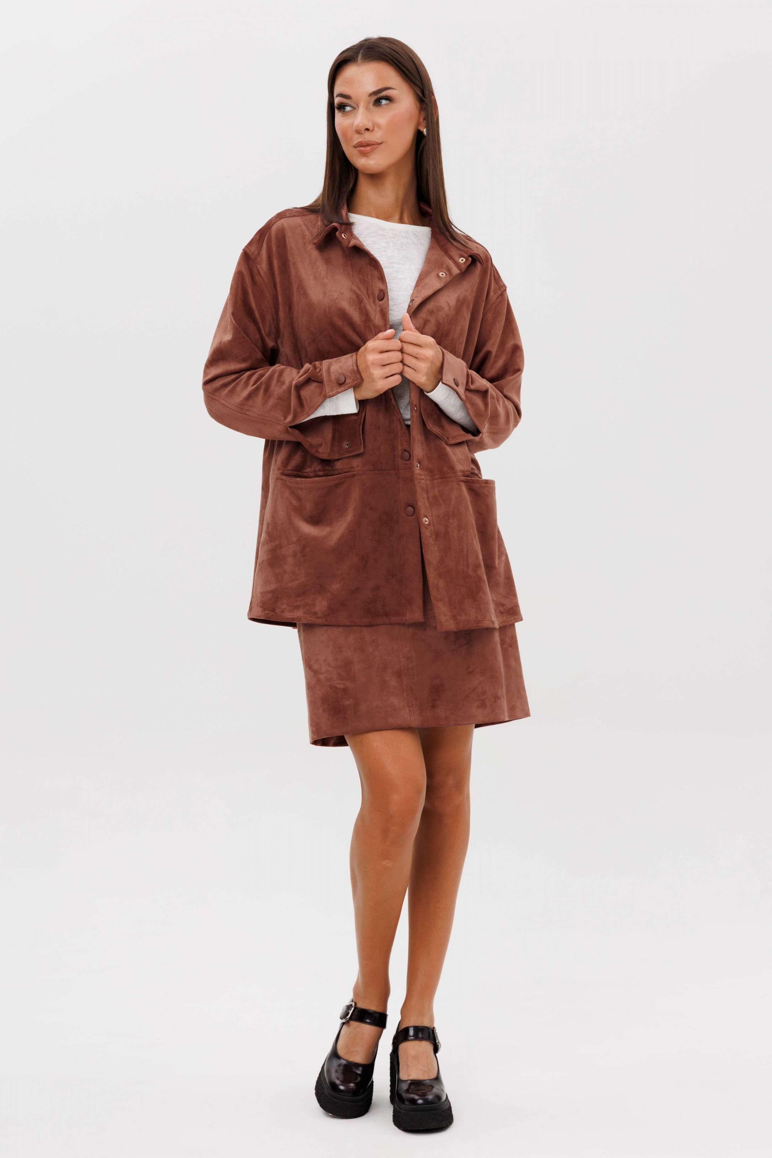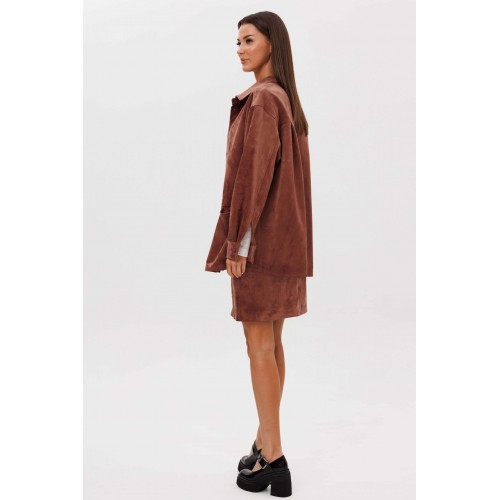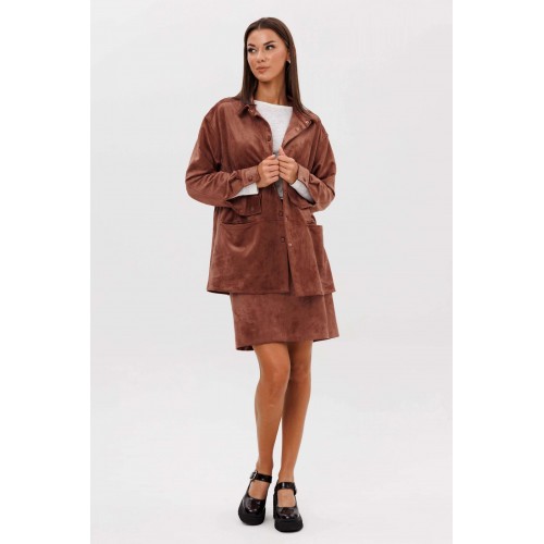 Замша уже несколько сезонов подряд удерживает статус одного из главных трендов. Для тех кто следит за модными новостями, это неудивительно: эта благородная фактура стала основой большинства модных дизайнерских коллекций. Эффектная, она органично вписывается в самые разные образы. Образ, который говорит сам за себя, смелый и дерзкий, и в то же время очень комфортный. Рубашка из замши-нестандартная, но стильная альтернатива куртке, но на более теплую погоду. Свободный, расслабленный силуэт, рубашечный покрой, центральная застежка на кнопки. Полочка с горизонтальным членением ниже линии талии и карманом в шве. Спинка с отрезной кокеткой и мягкими складками. Рукав с локтевым швом, разрезом в нем, мягкой складкой и притачной манжетой по низу. Низ изделия-фигурный. Воротник-классический рубашечный. Юбка из замши-это изюминка осеннего гардероба, позволяющая создавать любые образы, воплощая ваши самые смелые идеи. Юбка на притачном поясе, эластичном в области спинки, силуэт слегка А-образный. Переднее полотнище со швом по центру и горизонтальным членением, заднее полотнище с талиевыми вытачками, центральным швом и горизонтальным членением. Застежка в боковом шве на потайную молнию. Юбка на эластичной подкладке. Длина рубашки около 75 см. Длина рукава с плечом около 74 см. Длина юбки около 48 см.