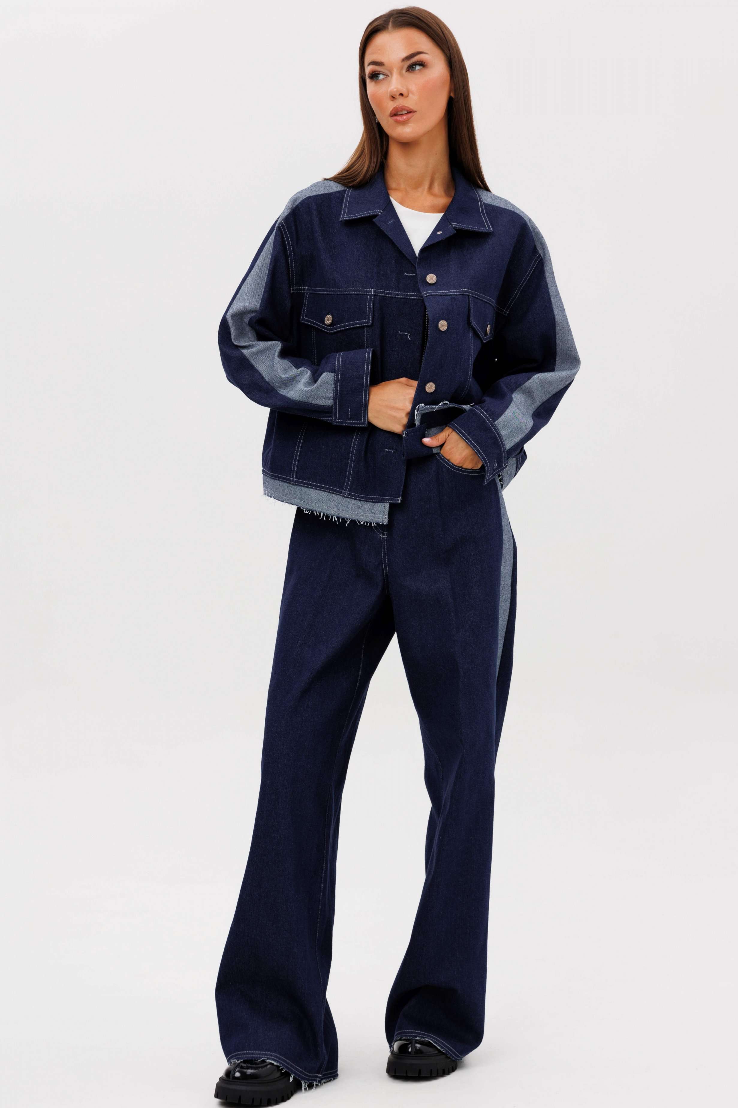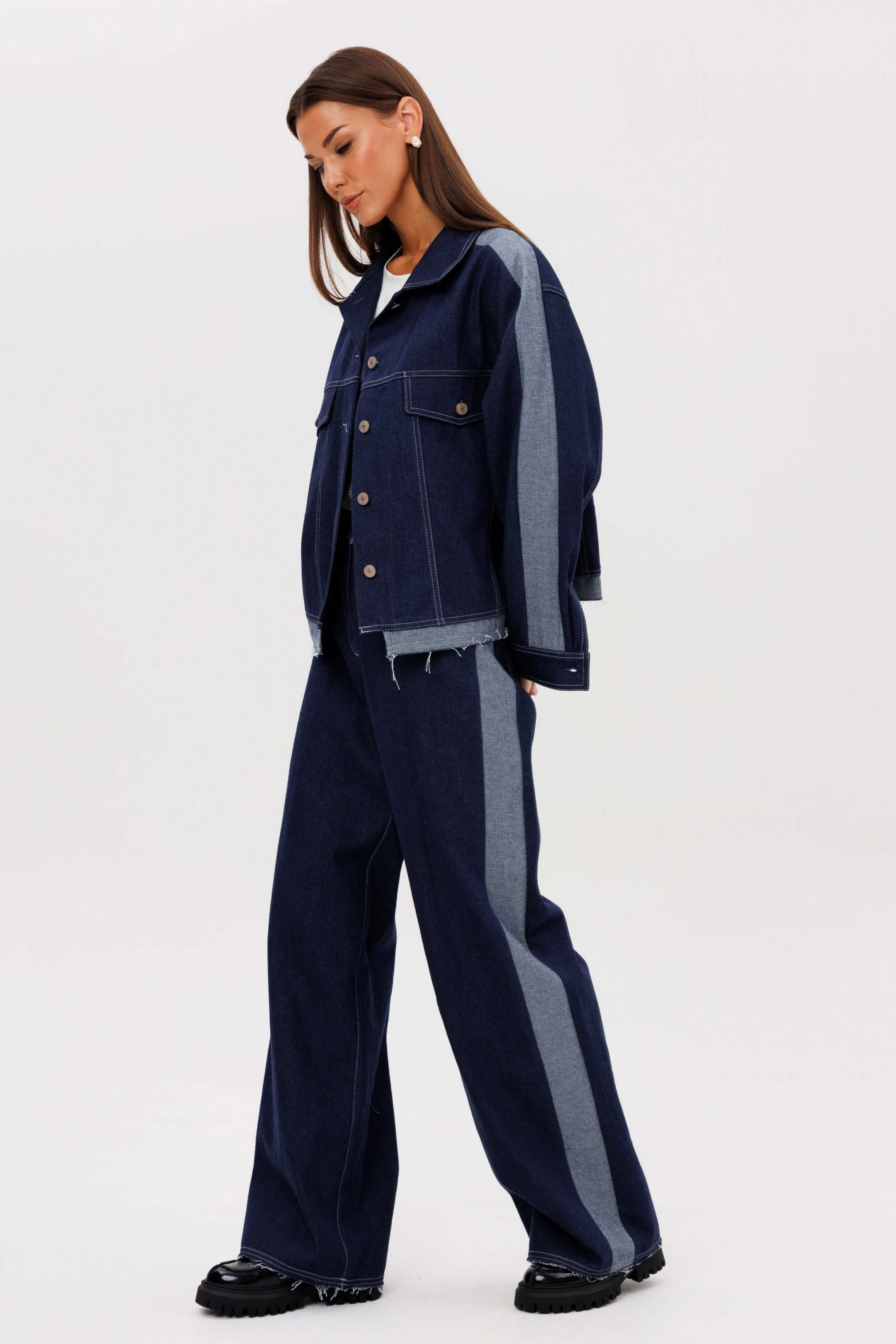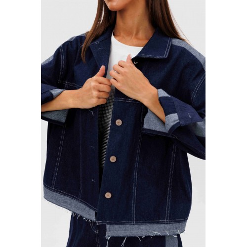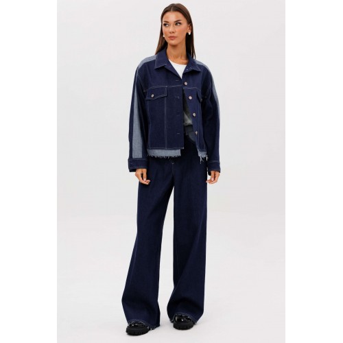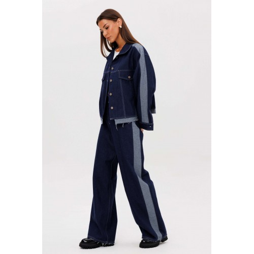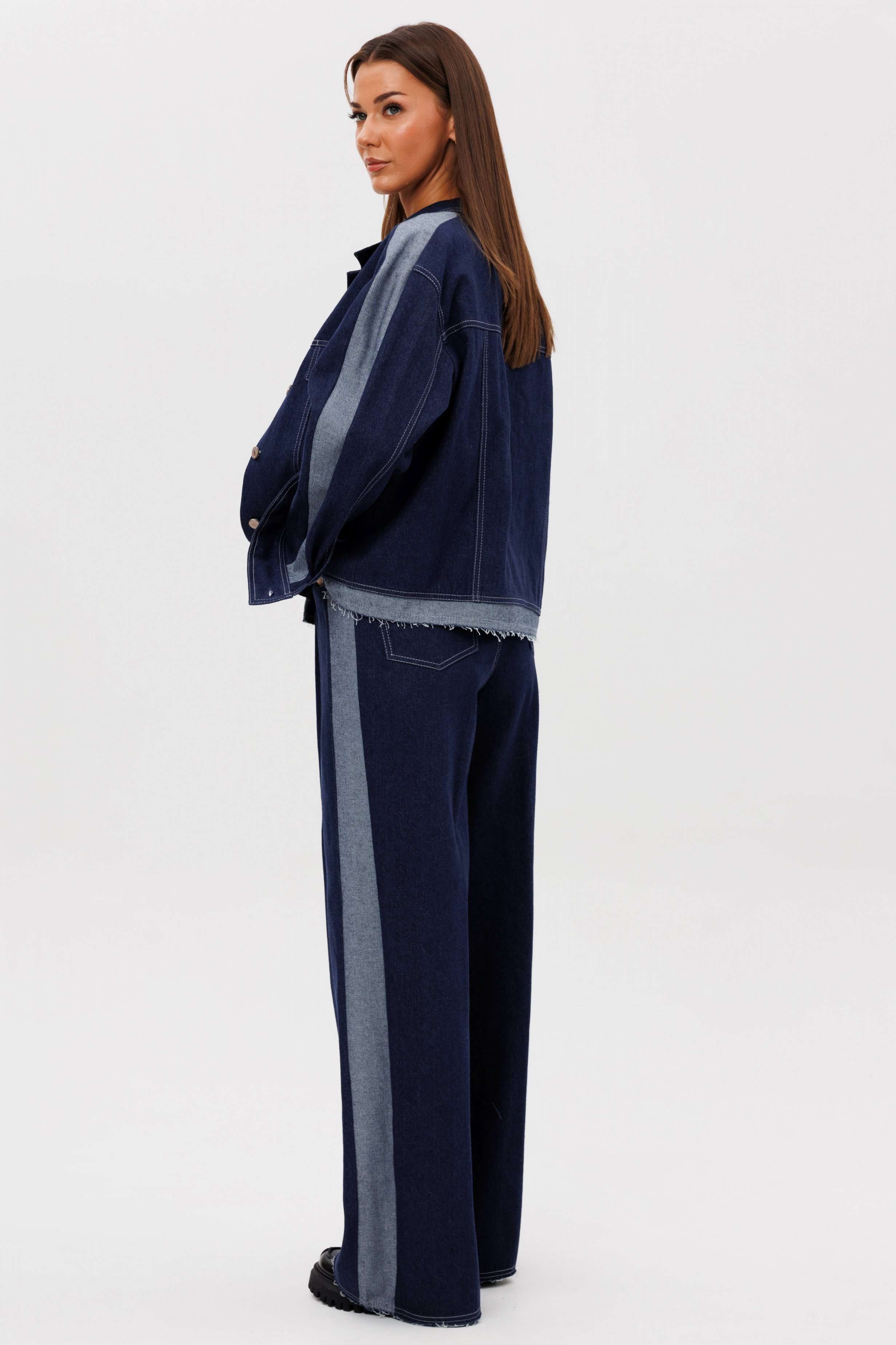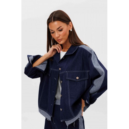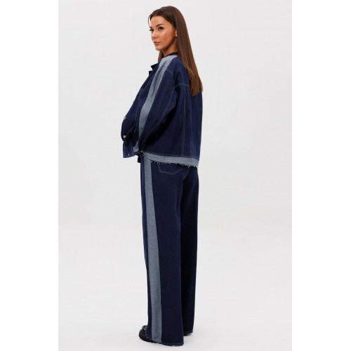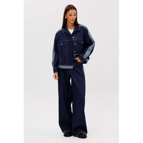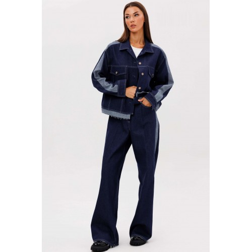 Костюм состоит из куртки и брюк. Свободный силуэт, рубашечный покрой, втачной воротник, рукав с притачной манжетой. Полочка с отрезной кокеткой, рельефами и карманом с клапаном. Спинка с отрезной кокеткой и рельефами. Рукав с локтевым швом и разрезом в нём, отделочным лампасом по центру рукава из контрастного денима, мягкой складкой и притачной манжетой. По низу куртки - притачная отделочная полоса в цвет лампаса. Застёжка центральная на петли и пуговицы. Джинсы классического покроя, свободные, с 5-ю карманами. По боковому шву - лампас из отделочного денима, также в цвет лампаса подзоры боковых карманов и пояс. Низ брюк обработан полоской с открытым срезом. Длина куртки около 52 см. Длина рукава с плечом около 74 см. Длина брюк около 105 см