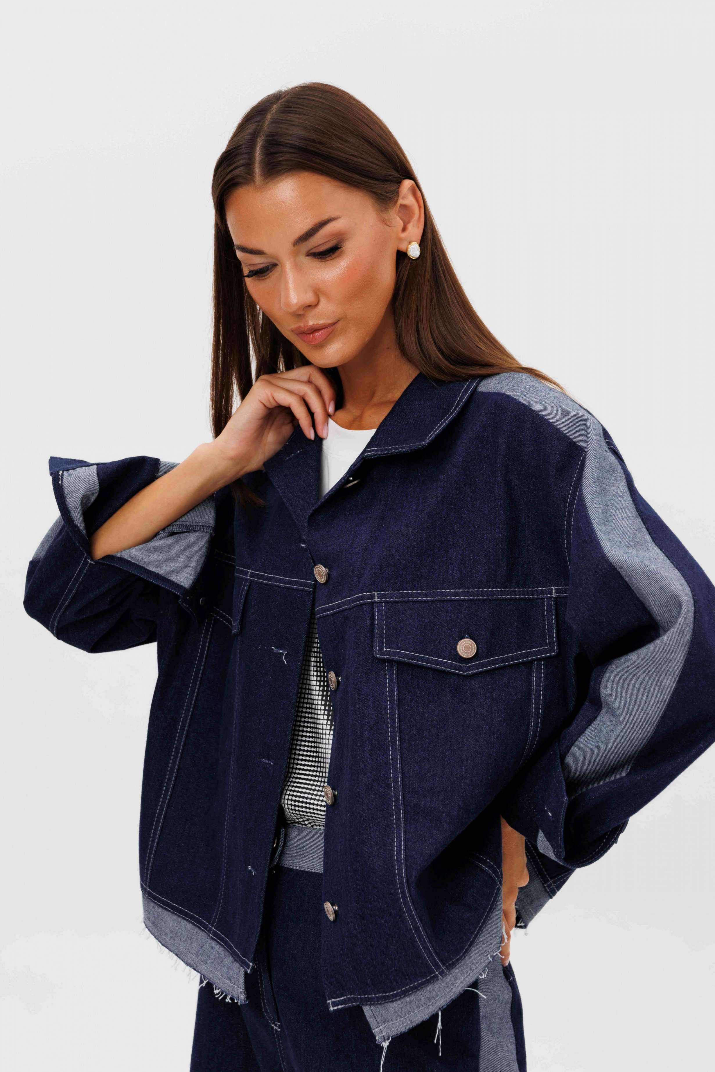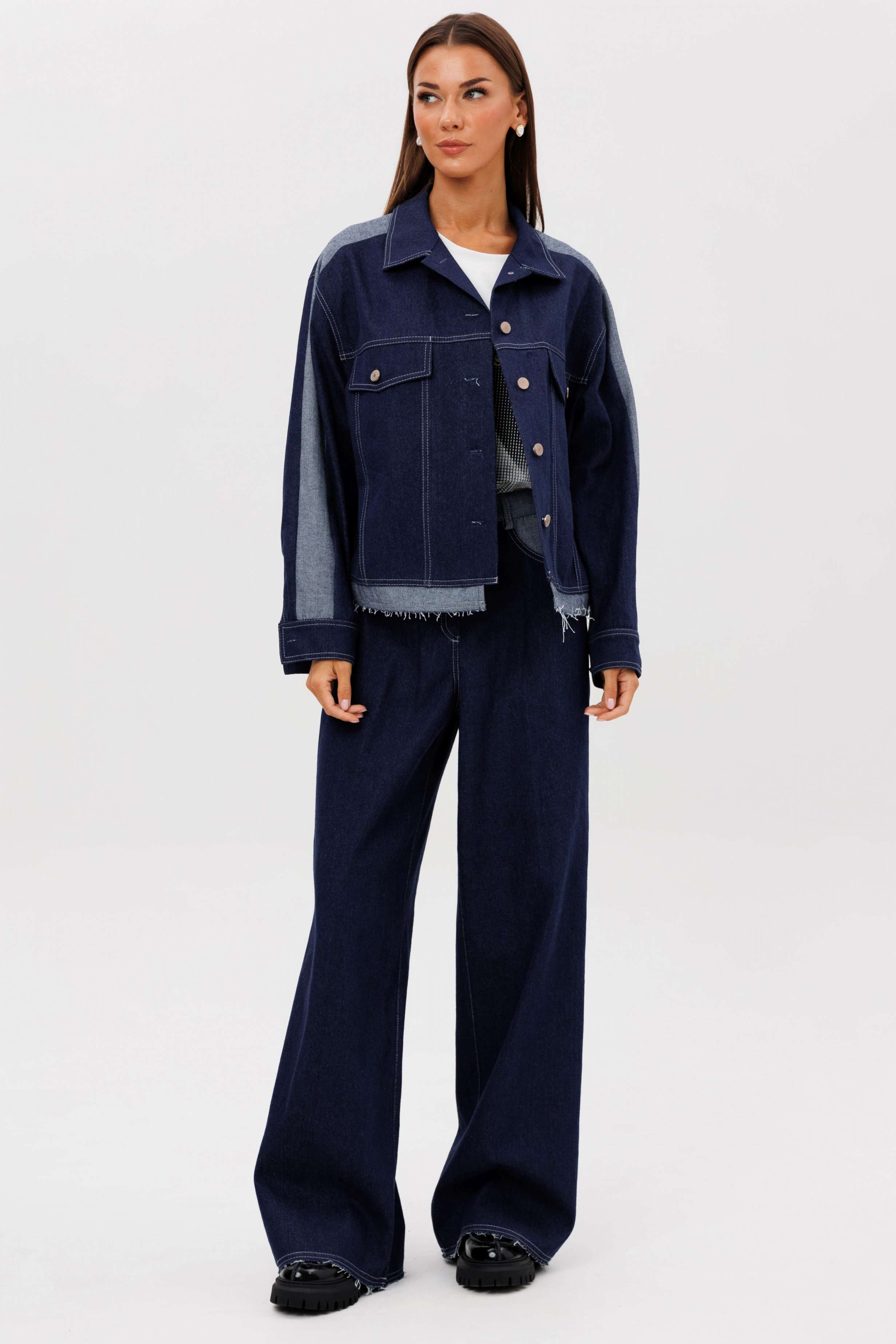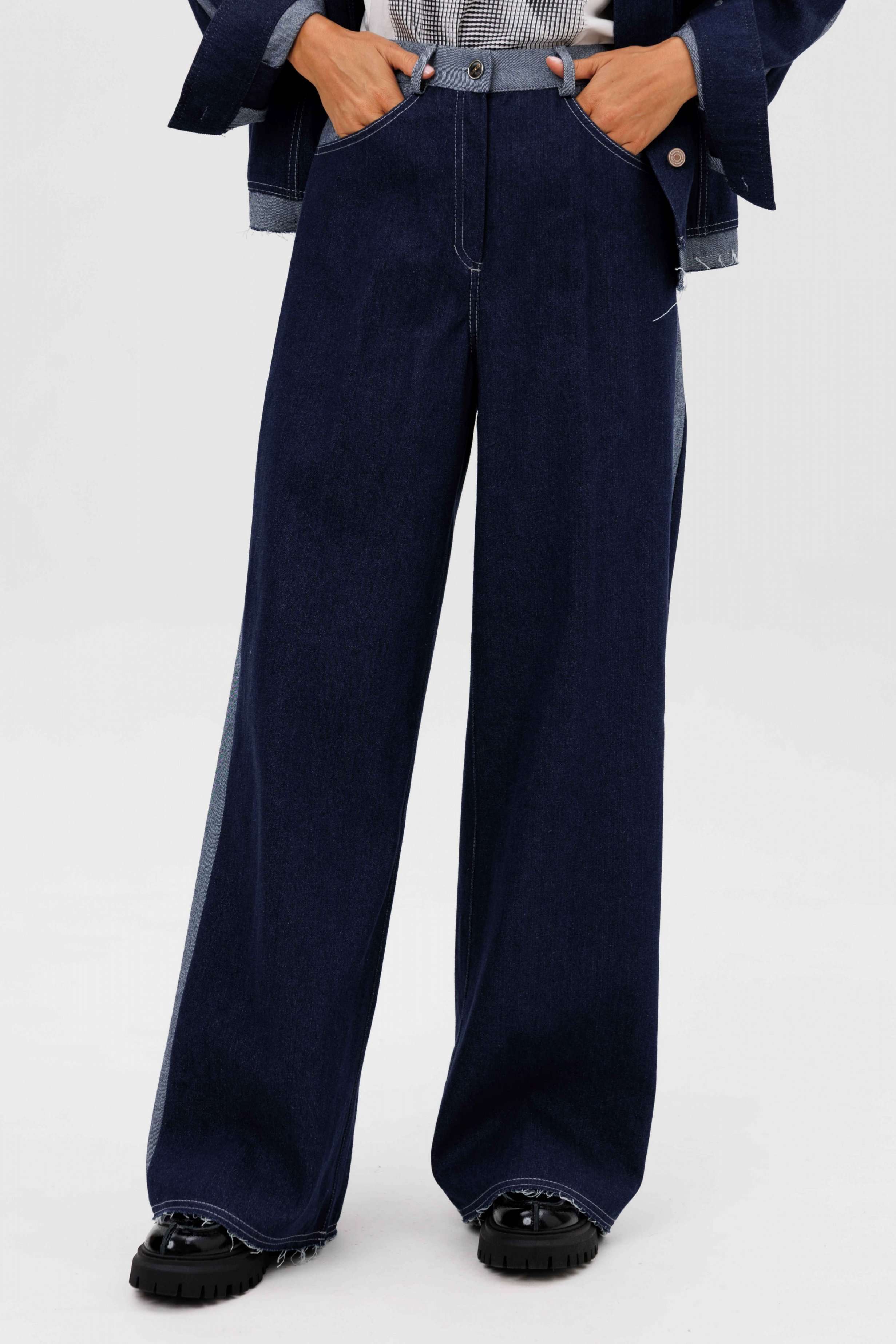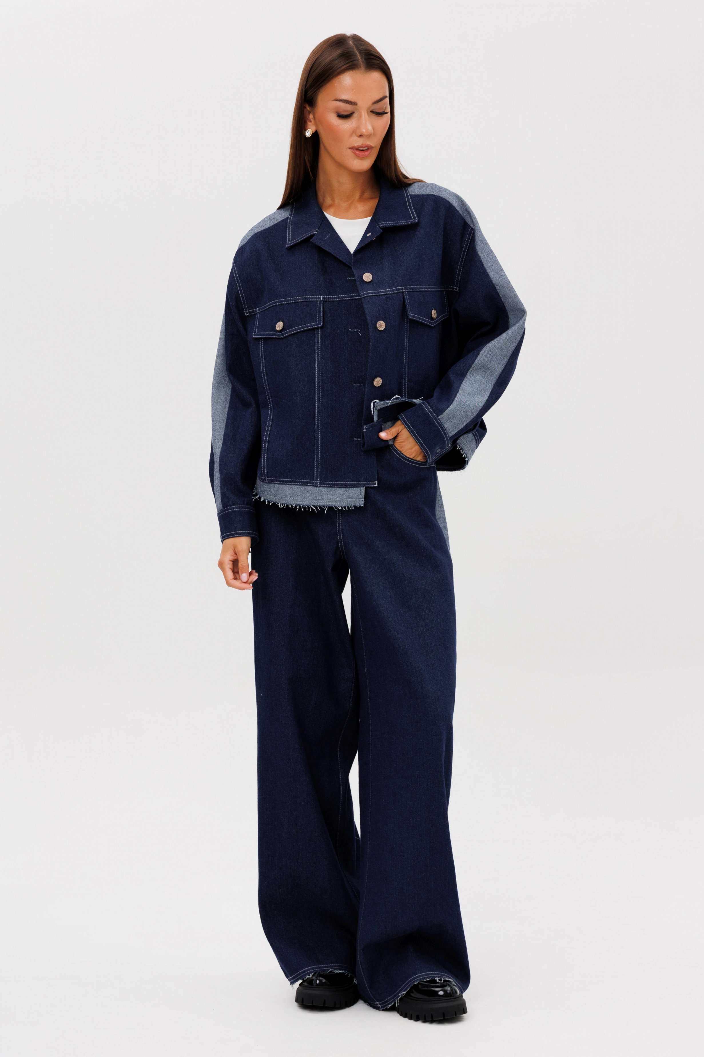 Костюм состоит из куртки и брюк. Свободный силуэт, рубашечный покрой, втачной воротник, рукав с притачной манжетой. Полочка с отрезной кокеткой, рельефами и карманом с клапаном. Спинка с отрезной кокеткой и рельефами. Рукав с локтевым швом и разрезом в нём, отделочным лампасом по центру рукава из контрастного денима, мягкой складкой и притачной манжетой. По низу куртки - притачная отделочная полоса в цвет лампаса. Застёжка центральная на петли и пуговицы. Джинсы классического покроя, свободные, с 5-ю карманами. По боковому шву - лампас из отделочного денима, также в цвет лампаса подзоры боковых карманов и пояс. Низ брюк обработан полоской с открытым срезом. Длина куртки около 52 см. Длина рукава с плечом около 74 см. Длина брюк около 105 см
