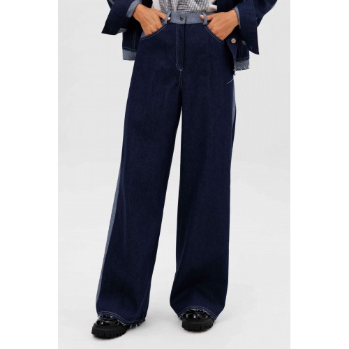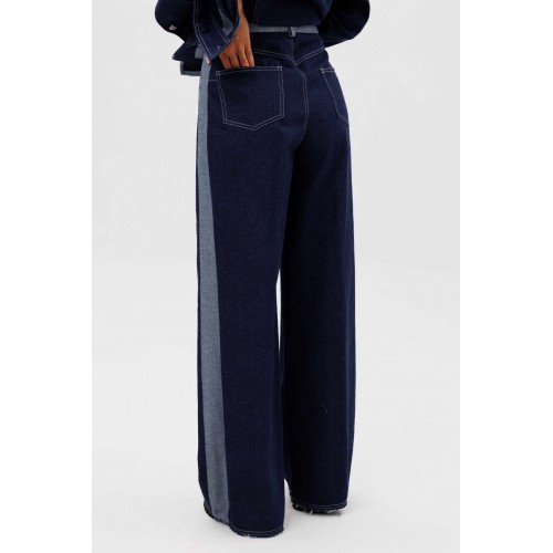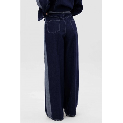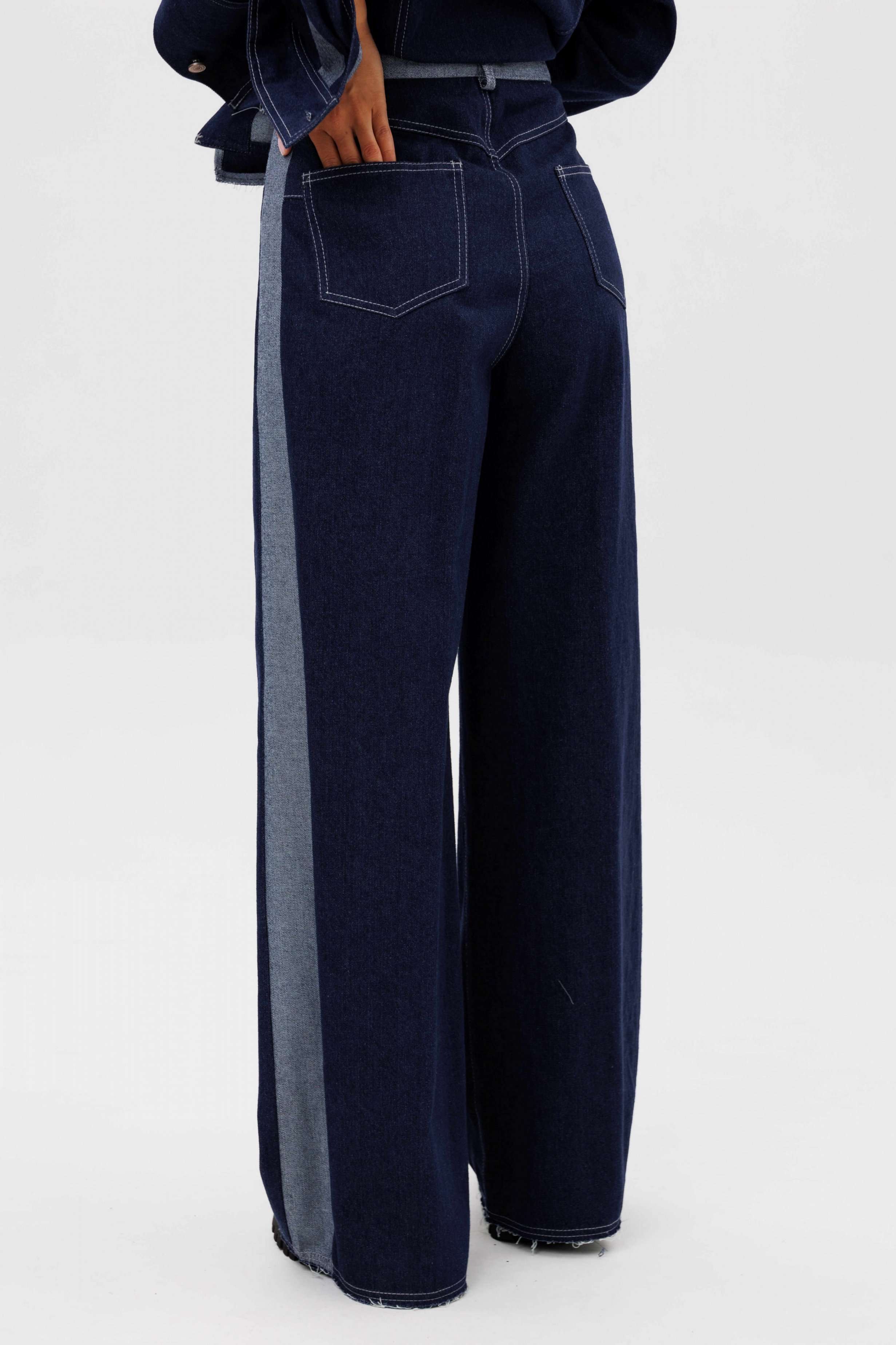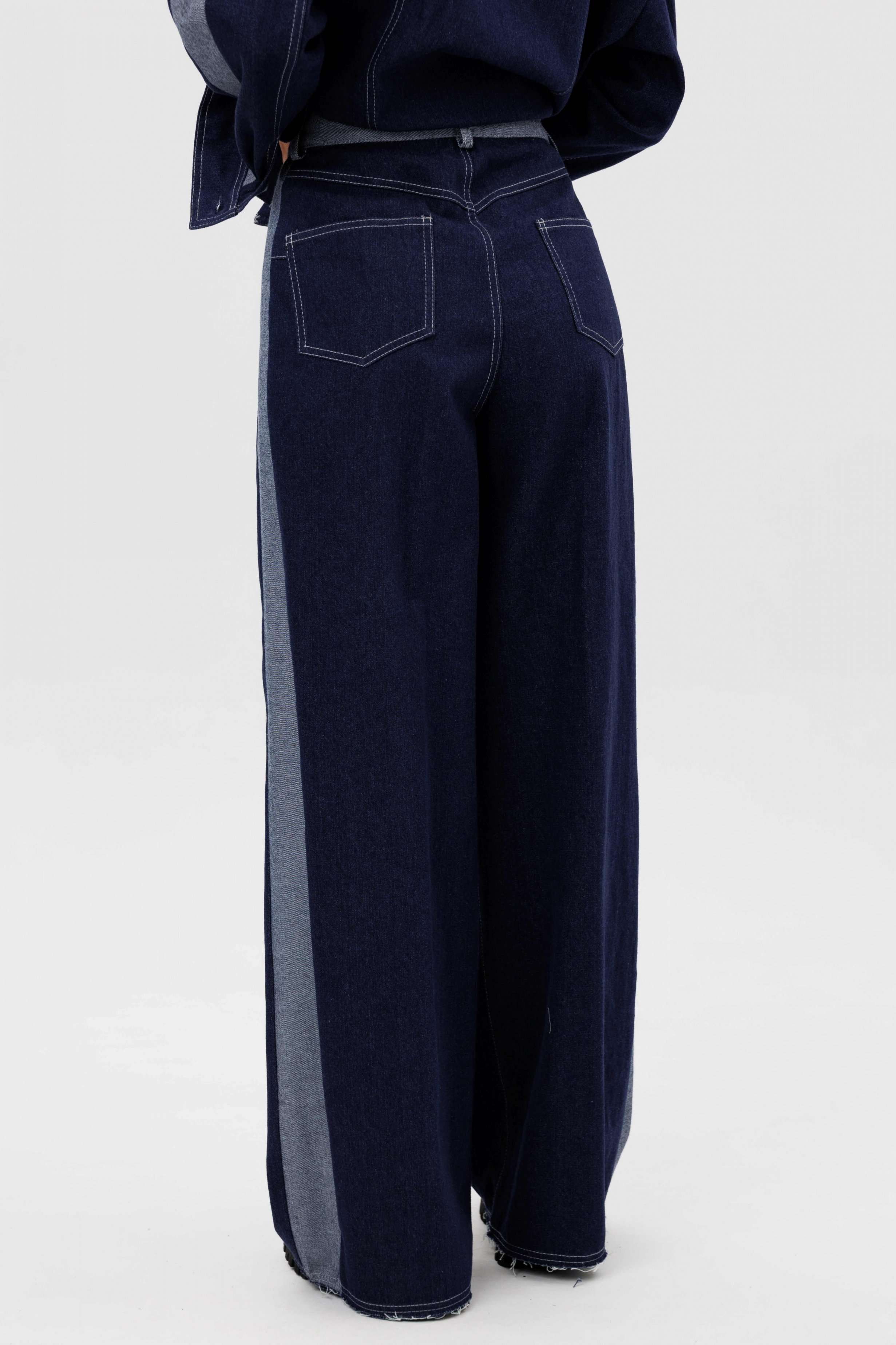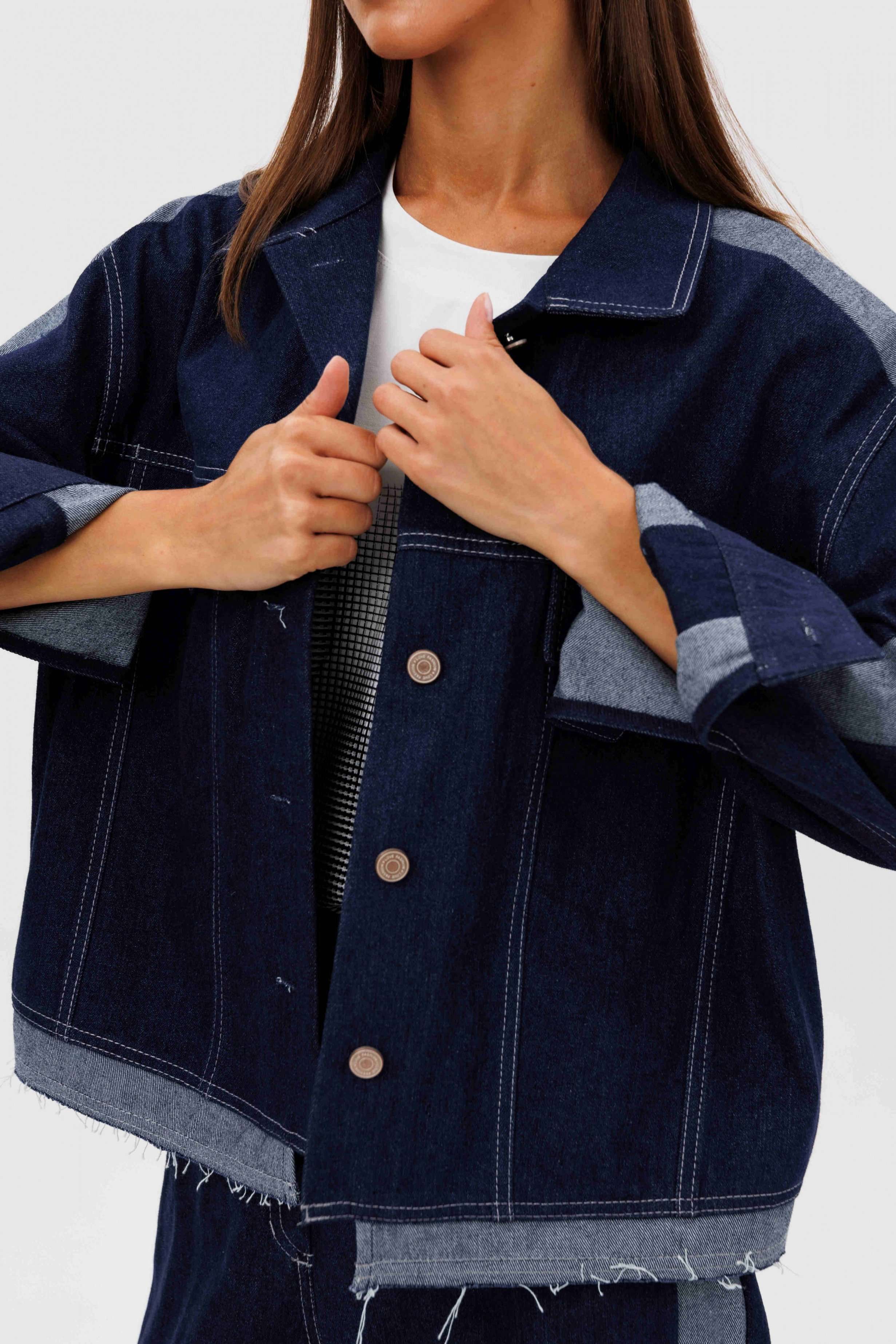 Костюм состоит из куртки и брюк. Свободный силуэт, рубашечный покрой, втачной воротник, рукав с притачной манжетой. Полочка с отрезной кокеткой, рельефами и карманом с клапаном. Спинка с отрезной кокеткой и рельефами. Рукав с локтевым швом и разрезом в нём, отделочным лампасом по центру рукава из контрастного денима, мягкой складкой и притачной манжетой. По низу куртки - притачная отделочная полоса в цвет лампаса. Застёжка центральная на петли и пуговицы. Джинсы классического покроя, свободные, с 5-ю карманами. По боковому шву - лампас из отделочного денима, также в цвет лампаса подзоры боковых карманов и пояс. Низ брюк обработан полоской с открытым срезом. Длина куртки около 52 см. Длина рукава с плечом около 74 см. Длина брюк около 105 см