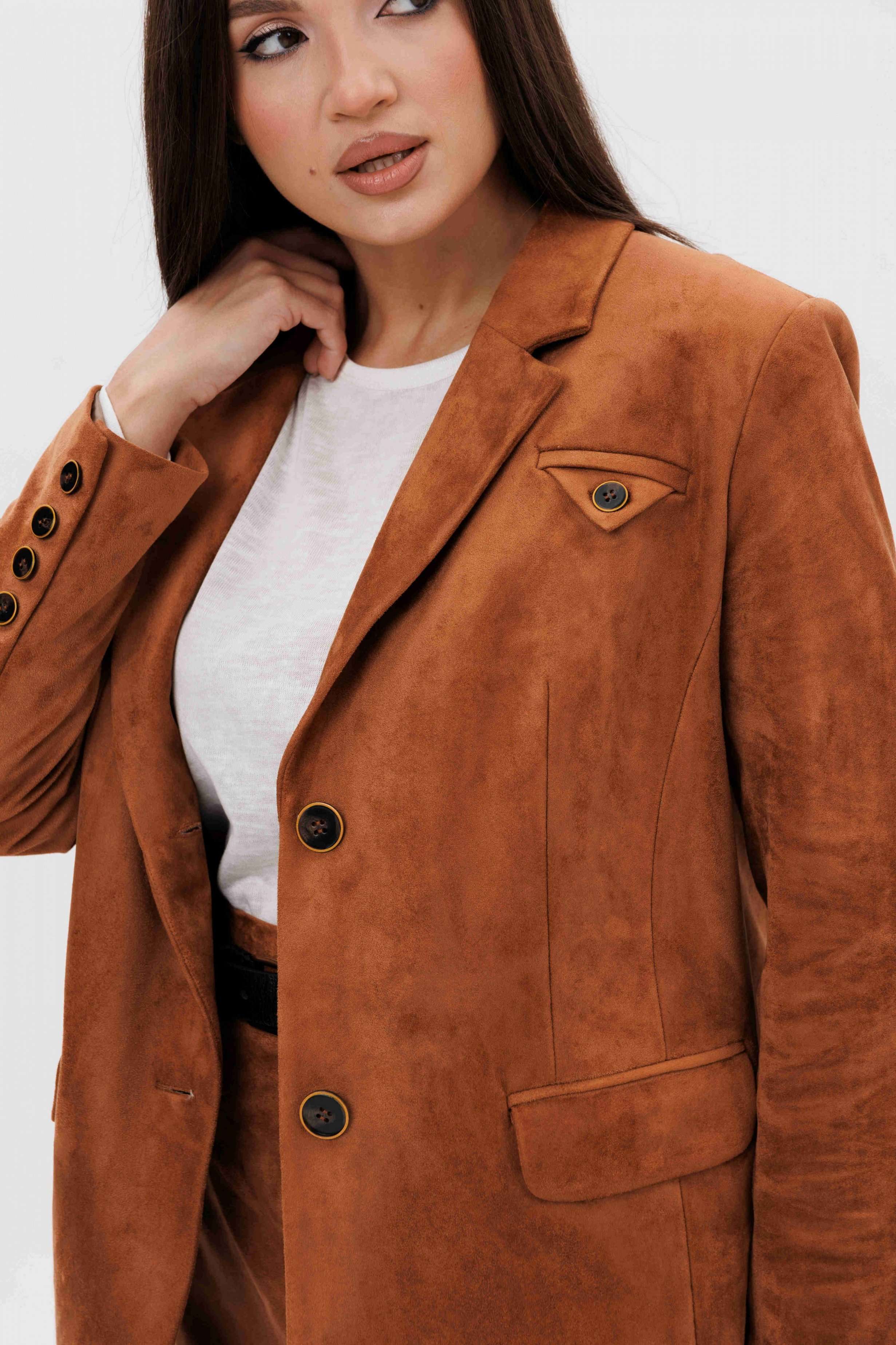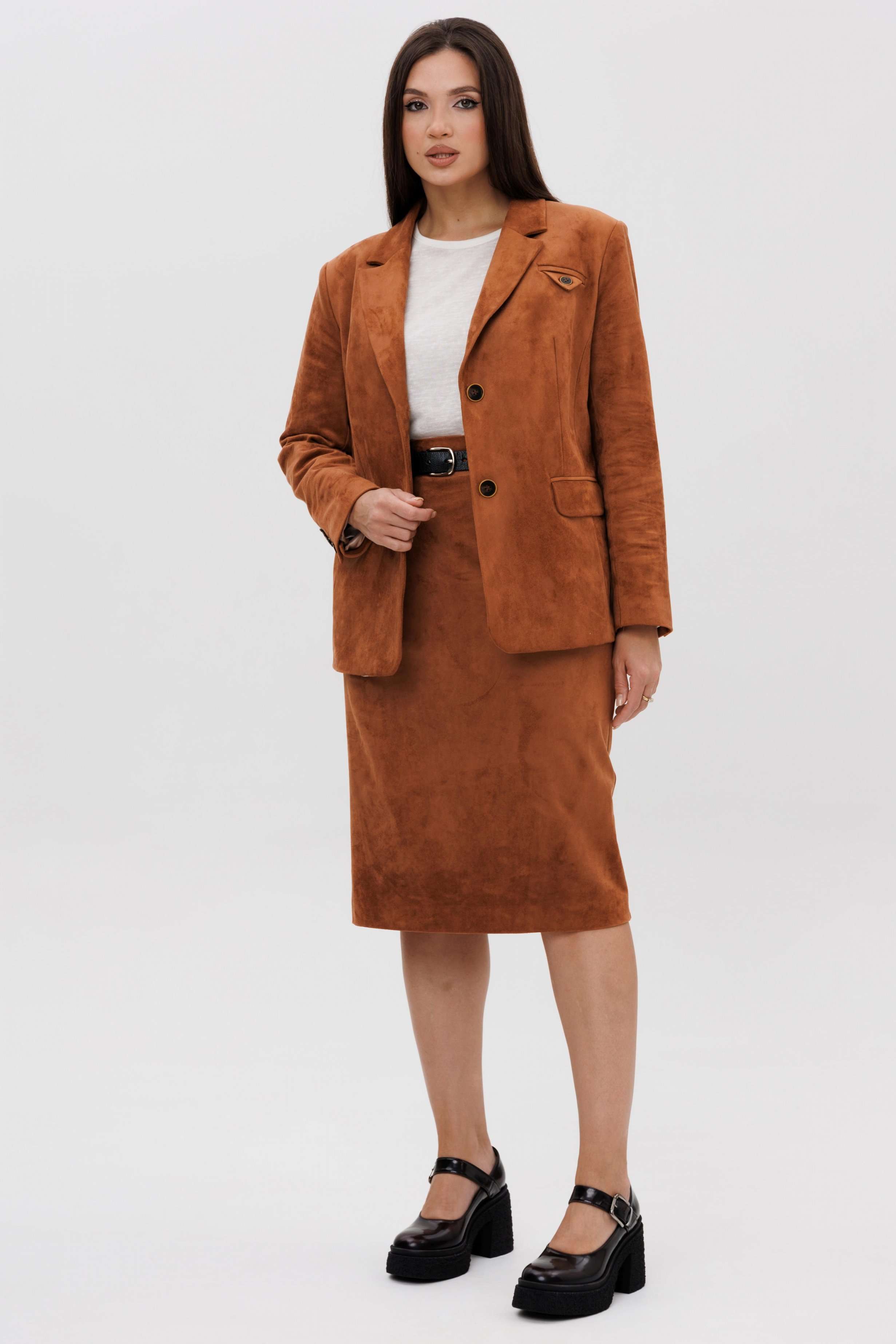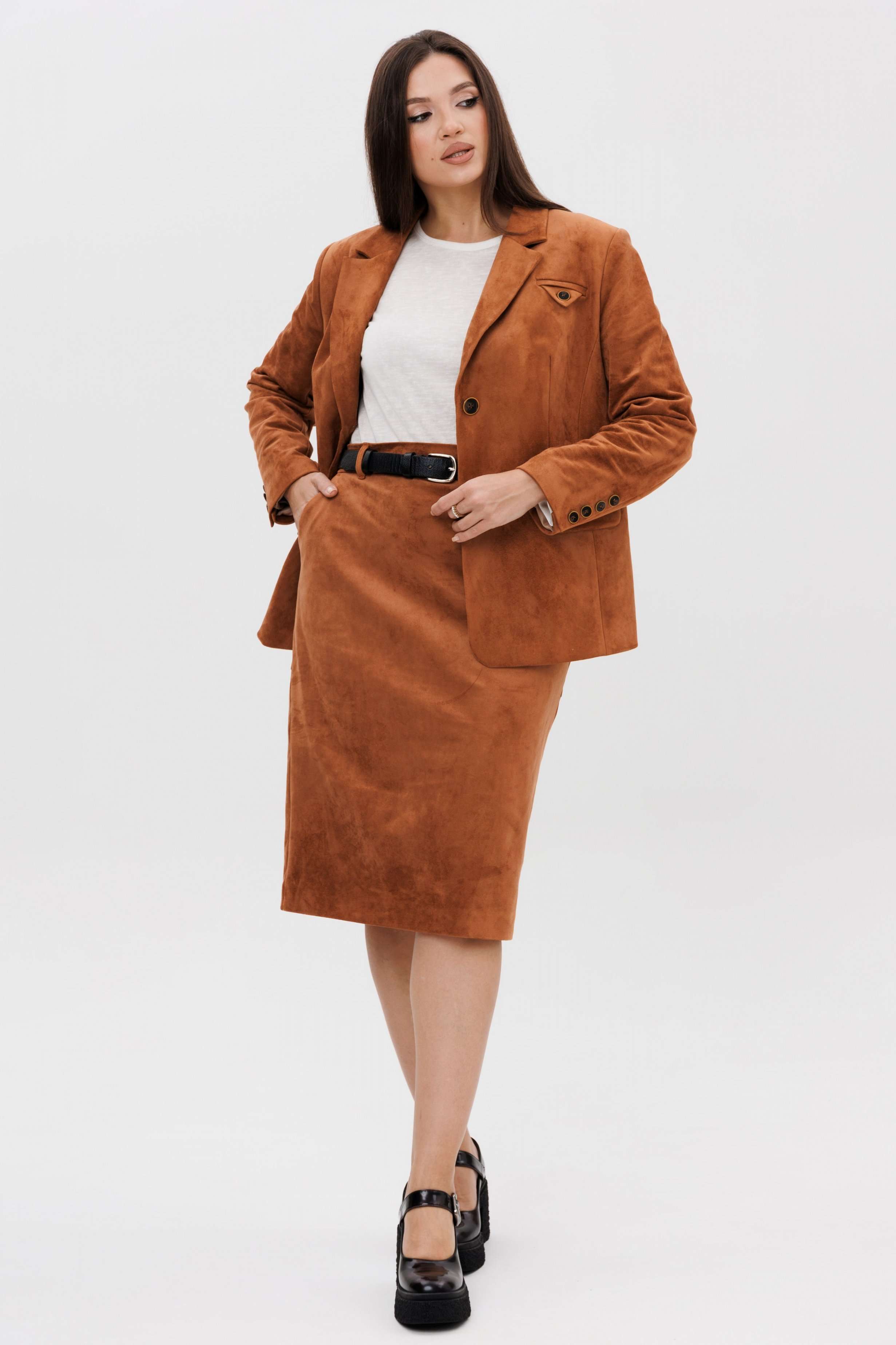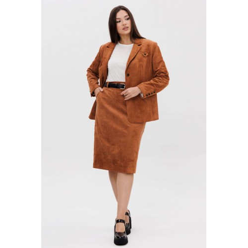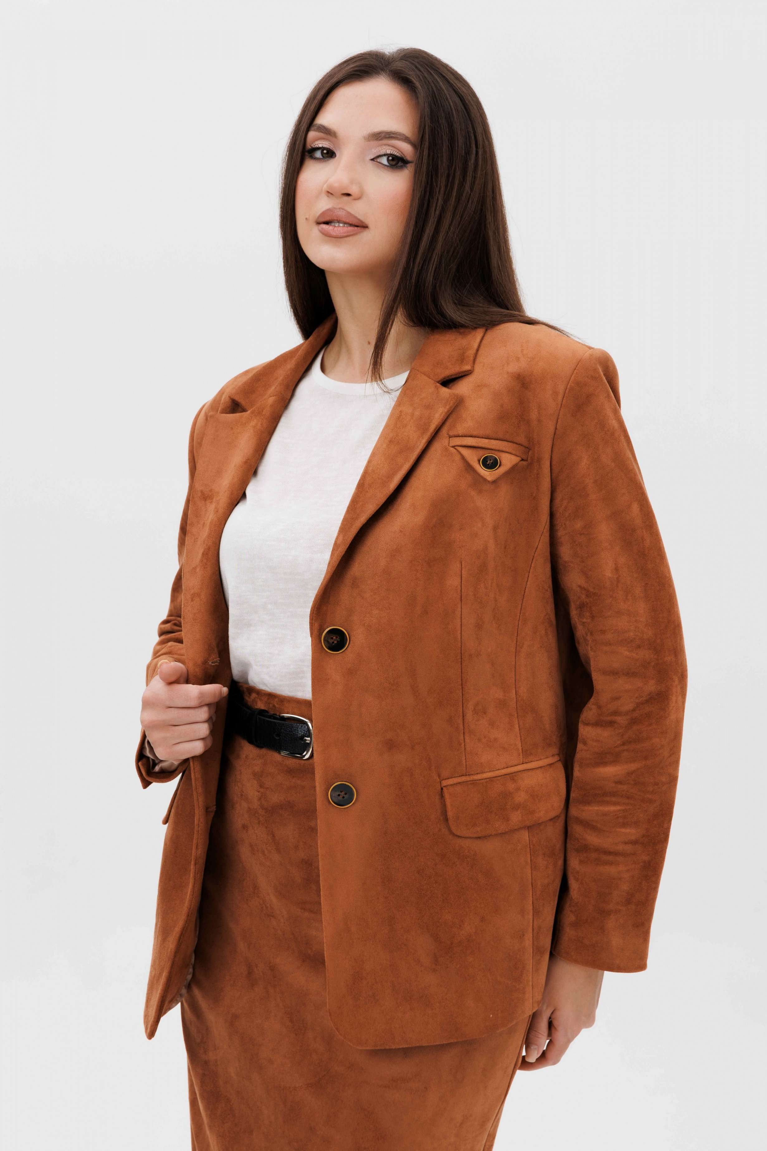 Осень меняет нам гардероб, хочется чего-то нового, свежего, необычного... И это повод, обзавестись костюмом из замши. Замша-главный хит 2025г. Он всегда смотрится эффектно, особенно если одеться в нее с головы до ног. Отличным выбором станет юбочный костюм. Пиджак классического покроя, слегка упрямленный, с центральной застежкой, английским воротником и втачным двухшовным рукавом со шлицей. Полочка с нагрудной вытачкой, с прорезным карманом с рамкой и клапаном, отрезным бочком. На левой полочке оригинальный нагрудной карман с отделочной деталью. Спинка со средним швом и плечевой вытачкой. Юбка на притачном поясе, со шлевками, эластичном в области спинки, на комфортной трикотажной подкладке. Переднее полотнище с наклонными боковыми карманами, заднее с горизонтальным членением ниже линии бедер, сложной шлицей с запахом, центральным швом с застежкой. Пояс в комплект не входит Длина жакета около 67 см. Длина рукава около 60 см. Длина юбки около 68 см.