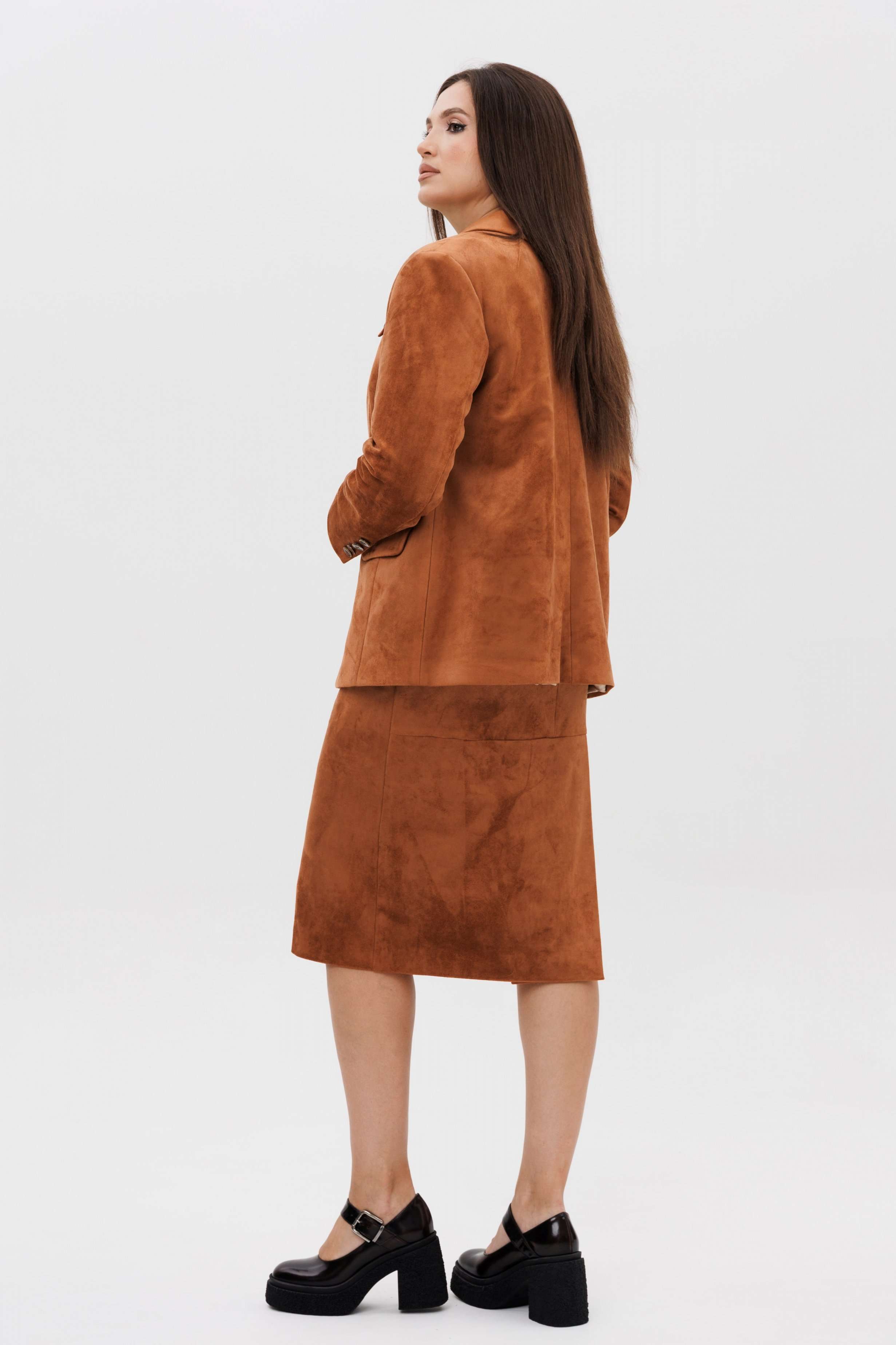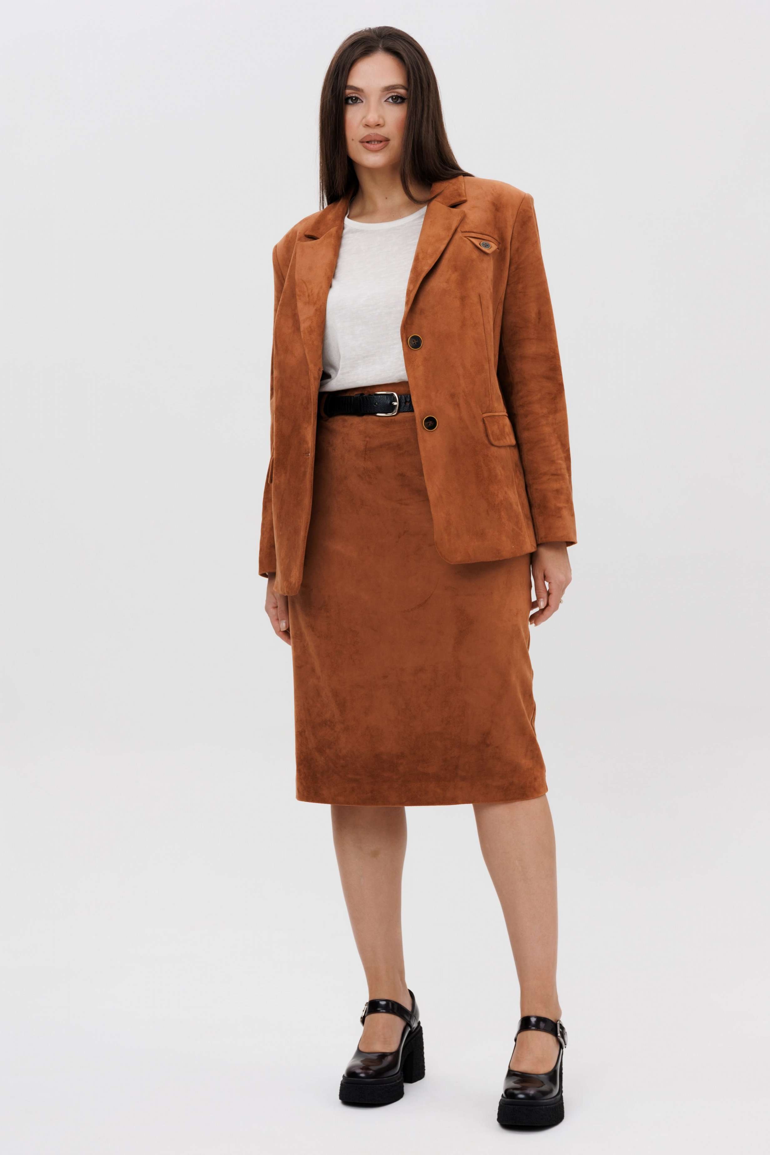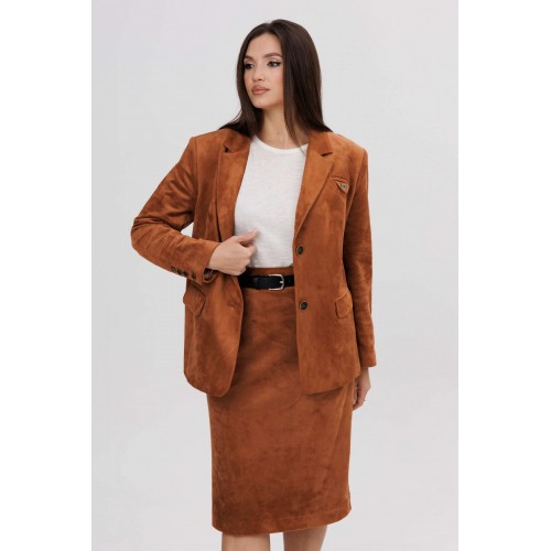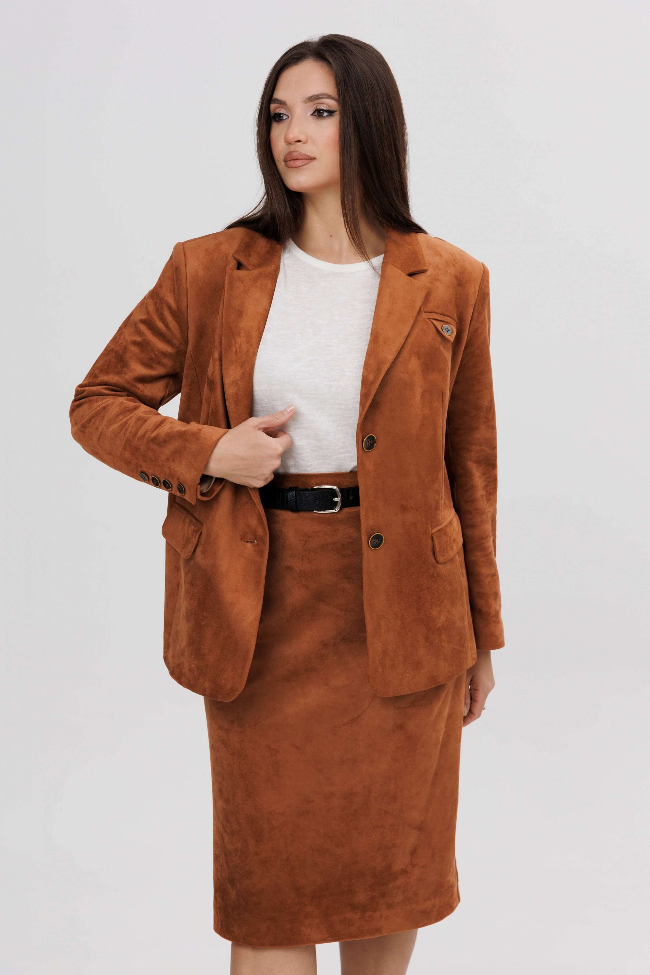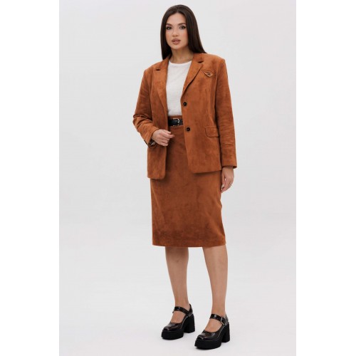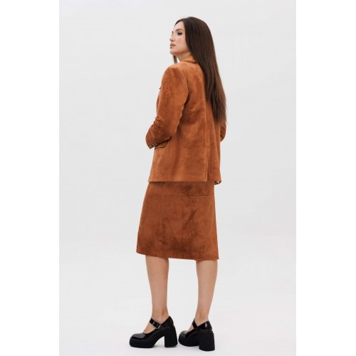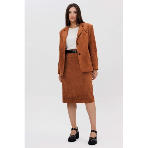 Осень меняет нам гардероб, хочется чего-то нового, свежего, необычного... И это повод, обзавестись костюмом из замши. Замша-главный хит 2025г. Он всегда смотрится эффектно, особенно если одеться в нее с головы до ног. Отличным выбором станет юбочный костюм. Пиджак классического покроя, слегка упрямленный, с центральной застежкой, английским воротником и втачным двухшовным рукавом со шлицей. Полочка с нагрудной вытачкой, с прорезным карманом с рамкой и клапаном, отрезным бочком. На левой полочке оригинальный нагрудной карман с отделочной деталью. Спинка со средним швом и плечевой вытачкой. Юбка на притачном поясе, со шлевками, эластичном в области спинки, на комфортной трикотажной подкладке. Переднее полотнище с наклонными боковыми карманами, заднее с горизонтальным членением ниже линии бедер, сложной шлицей с запахом, центральным швом с застежкой. Пояс в комплект не входит Длина жакета около 67 см. Длина рукава около 60 см. Длина юбки около 68 см.