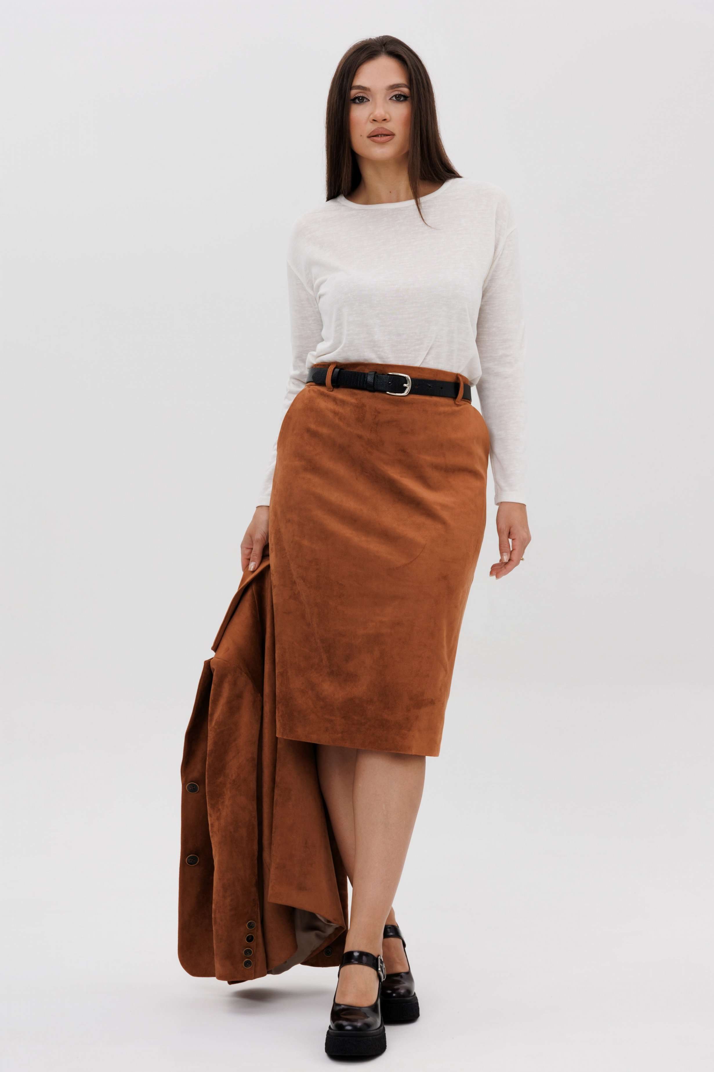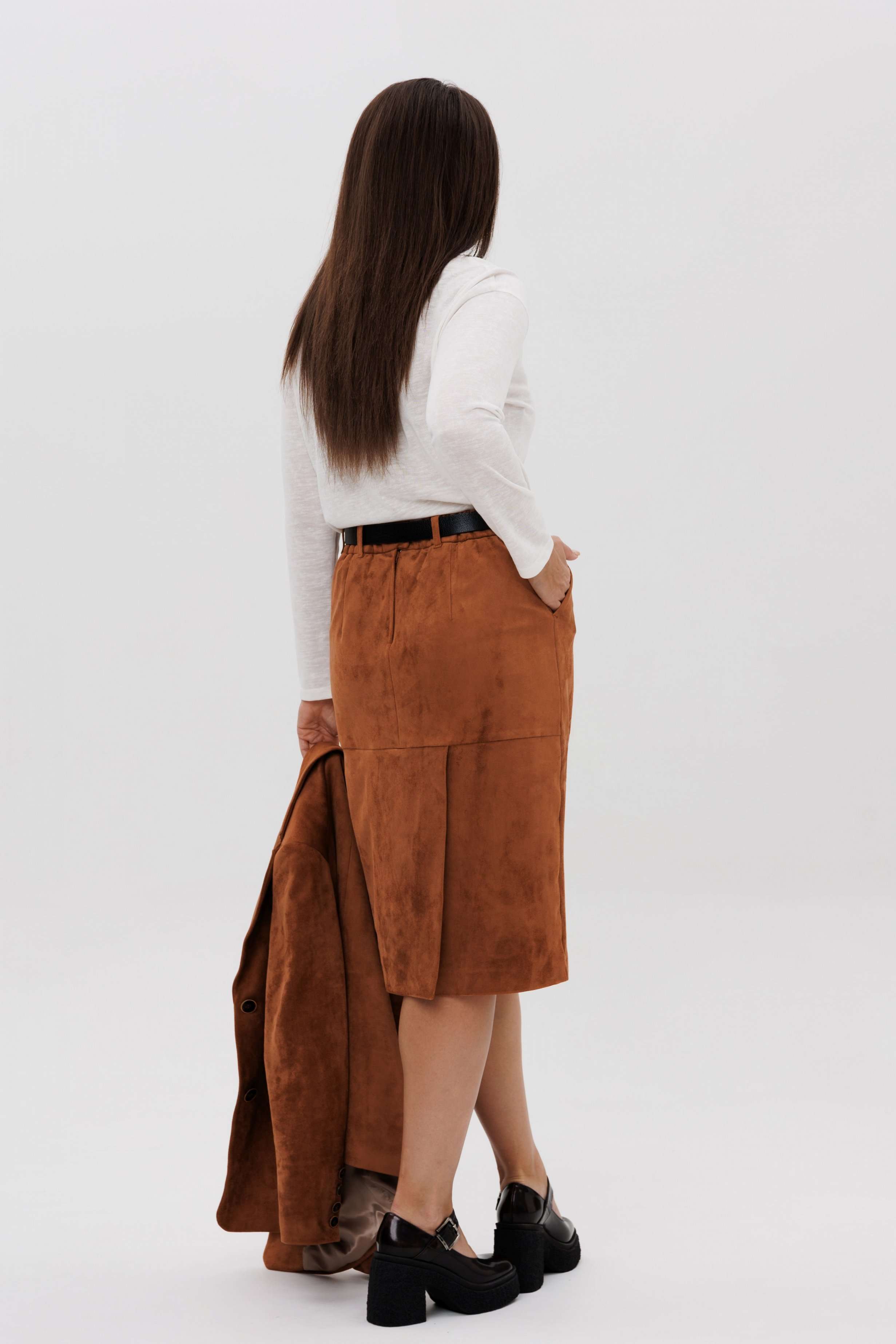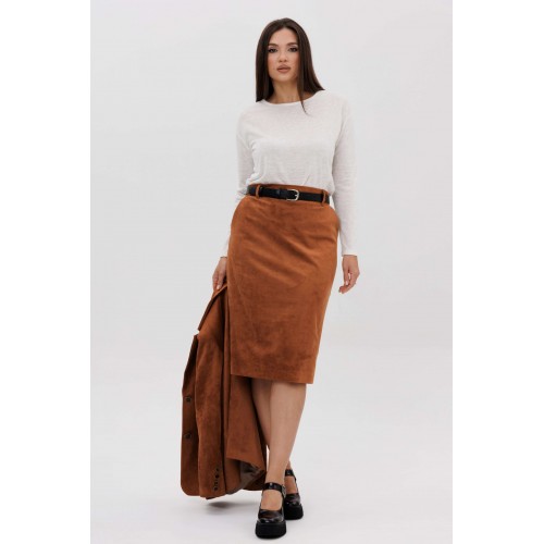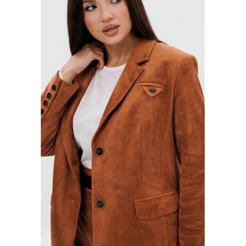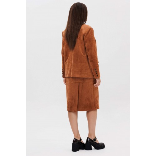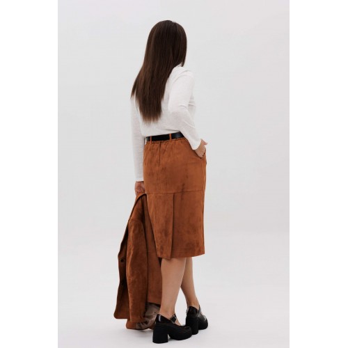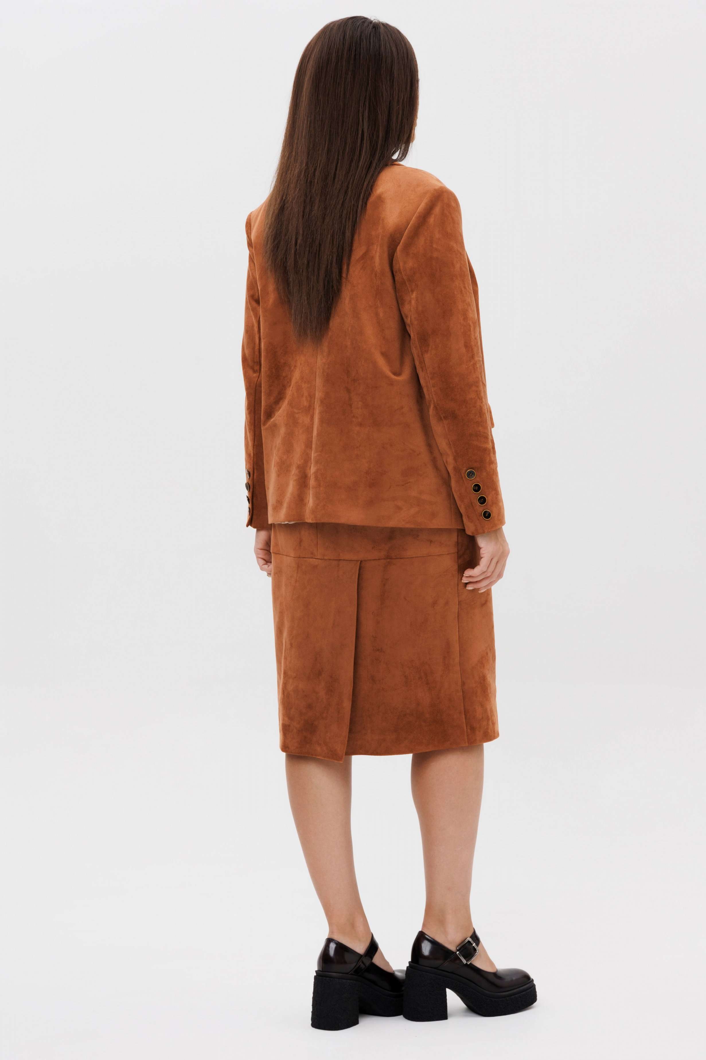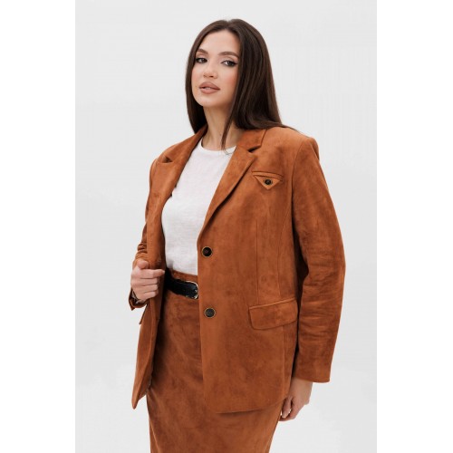 Осень меняет нам гардероб, хочется чего-то нового, свежего, необычного... И это повод, обзавестись костюмом из замши. Замша-главный хит 2025г. Он всегда смотрится эффектно, особенно если одеться в нее с головы до ног. Отличным выбором станет юбочный костюм. Пиджак классического покроя, слегка упрямленный, с центральной застежкой, английским воротником и втачным двухшовным рукавом со шлицей. Полочка с нагрудной вытачкой, с прорезным карманом с рамкой и клапаном, отрезным бочком. На левой полочке оригинальный нагрудной карман с отделочной деталью. Спинка со средним швом и плечевой вытачкой. Юбка на притачном поясе, со шлевками, эластичном в области спинки, на комфортной трикотажной подкладке. Переднее полотнище с наклонными боковыми карманами, заднее с горизонтальным членением ниже линии бедер, сложной шлицей с запахом, центральным швом с застежкой. Пояс в комплект не входит Длина жакета около 67 см. Длина рукава около 60 см. Длина юбки около 68 см.