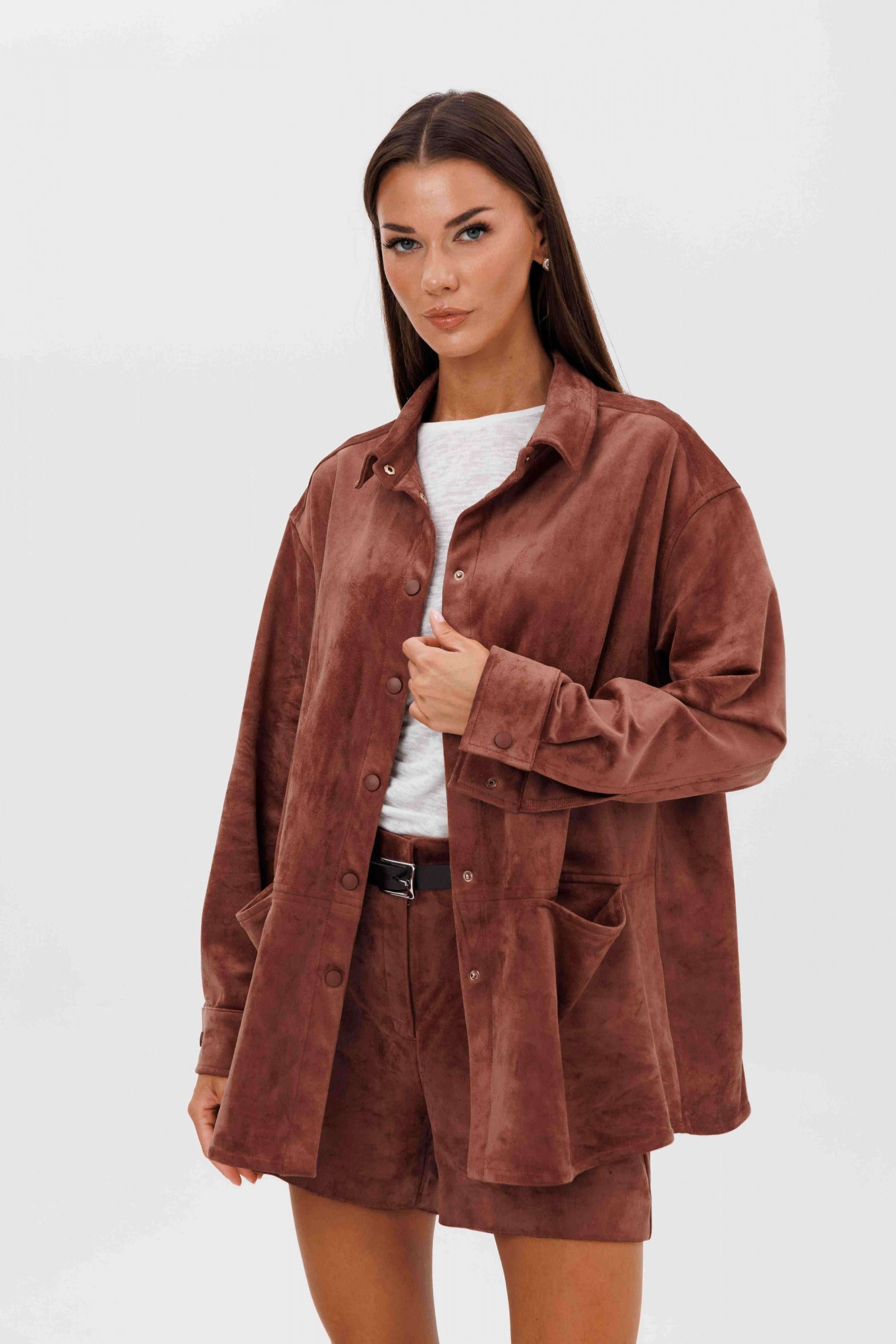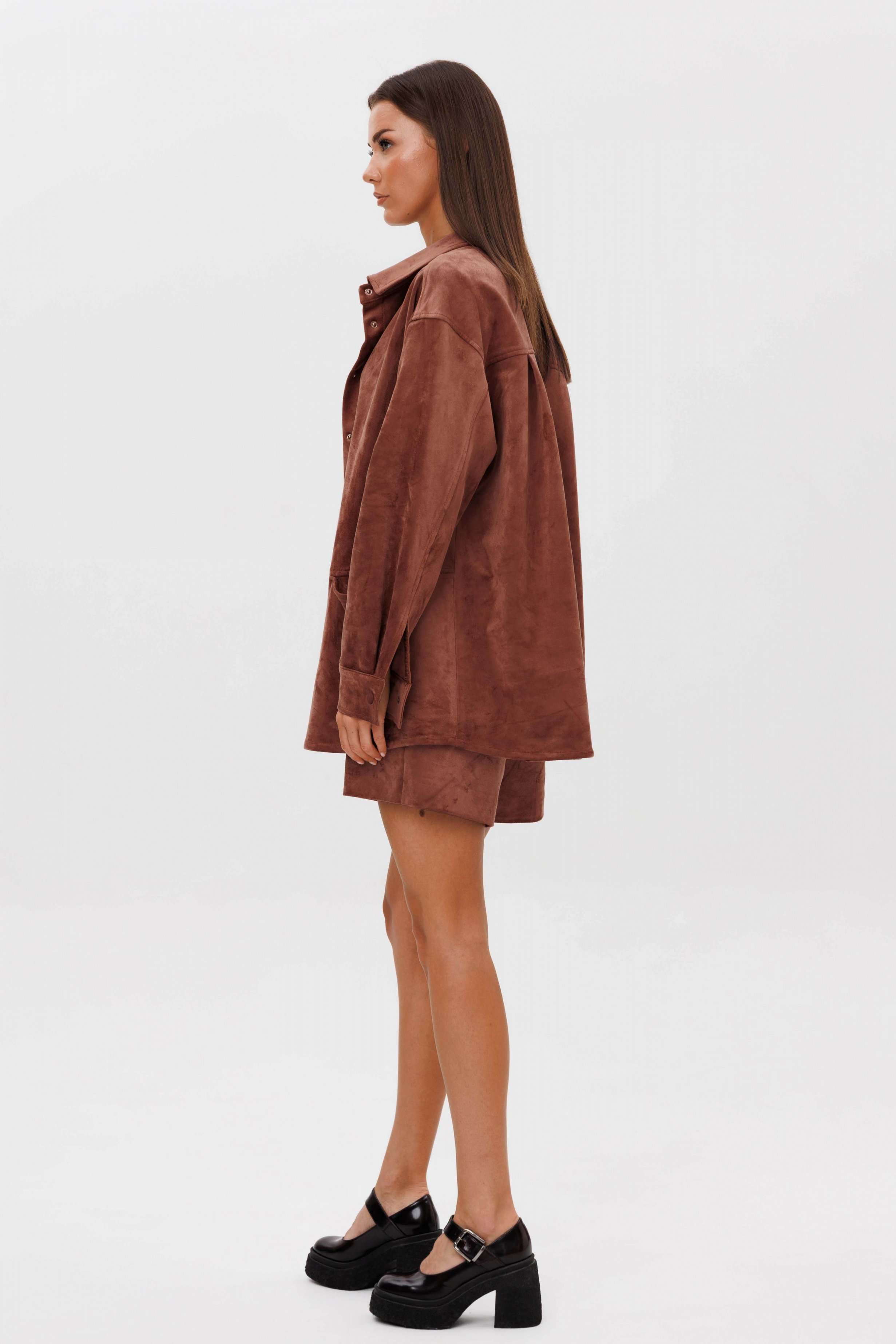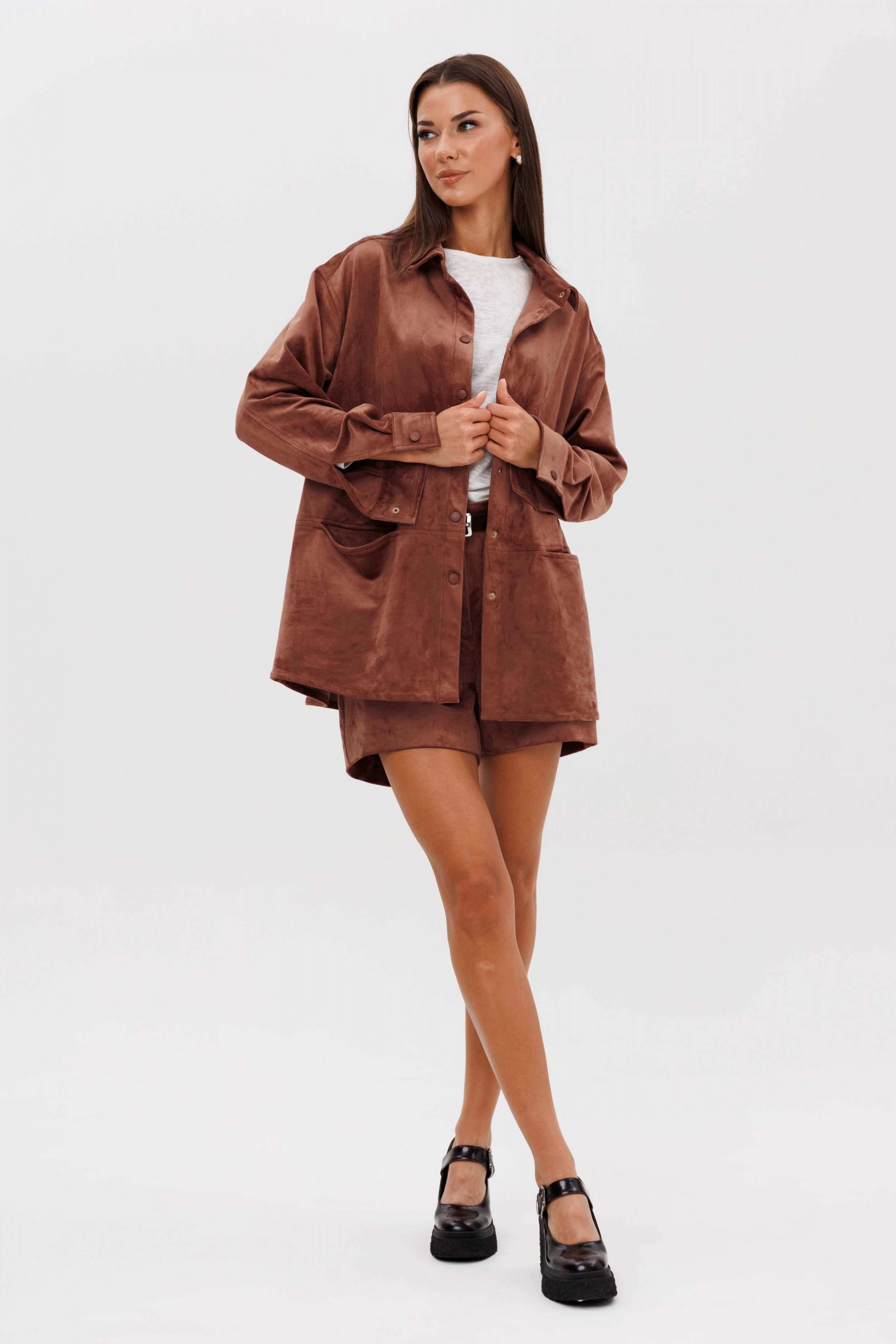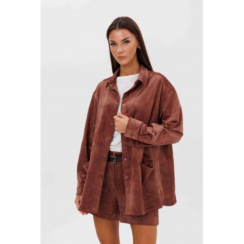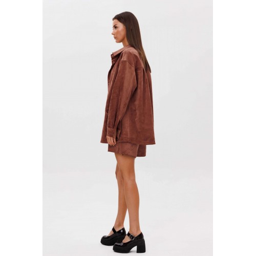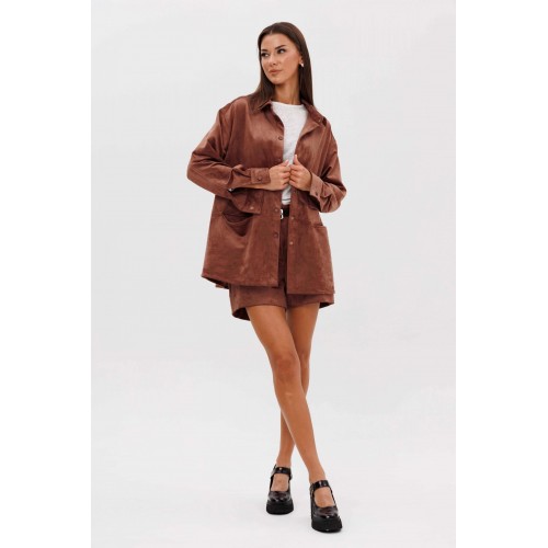 Замша уже несколько сезонов подряд удерживает статус одного из главных трендов. Для тех кто следит за модными новостями, это неудивительно: эта благородная фактура стала основой большинства модных дизайнерских коллекций. Эффектная, она органично вписывается в самые разные образы. Образ, который говорит сам за себя, смелый и дерзкий, и в то же время очень комфортный. Рубашка из замши-нестандартная, но стильная альтернатива куртке, но на более теплую погоду. Свободный, расслабленный силуэт, рубашечный покрой, центральная застежка на кнопки. Полочка с горизонтальным членением ниже линии талии и карманом в шве. Спинка с отрезной кокеткой и мягкими складками. Рукав с локтевым швом, разрезом в нем, мягкой складкой и притачной манжетой по низу. Низ изделия-фигурный. Воротник-классический рубашечный. Шорты-это просто ""masthave"" осеннего сезона, с лоферами или казаками, с модными сапогами трубами, с носками или гольфами-это всегда эффектно подчеркивает вашу свободу, независимость и индивидуальность. Шорты на притачном поясе со шлевками, эластичном в области спинки. Передние половинки-с наклонным боковым карманом. Задние половинки шорт с талиевой вытачкой. Длина рубашки около 75 см. Длина рукава с плечом около 74 см. Длина шорт около 35 см.