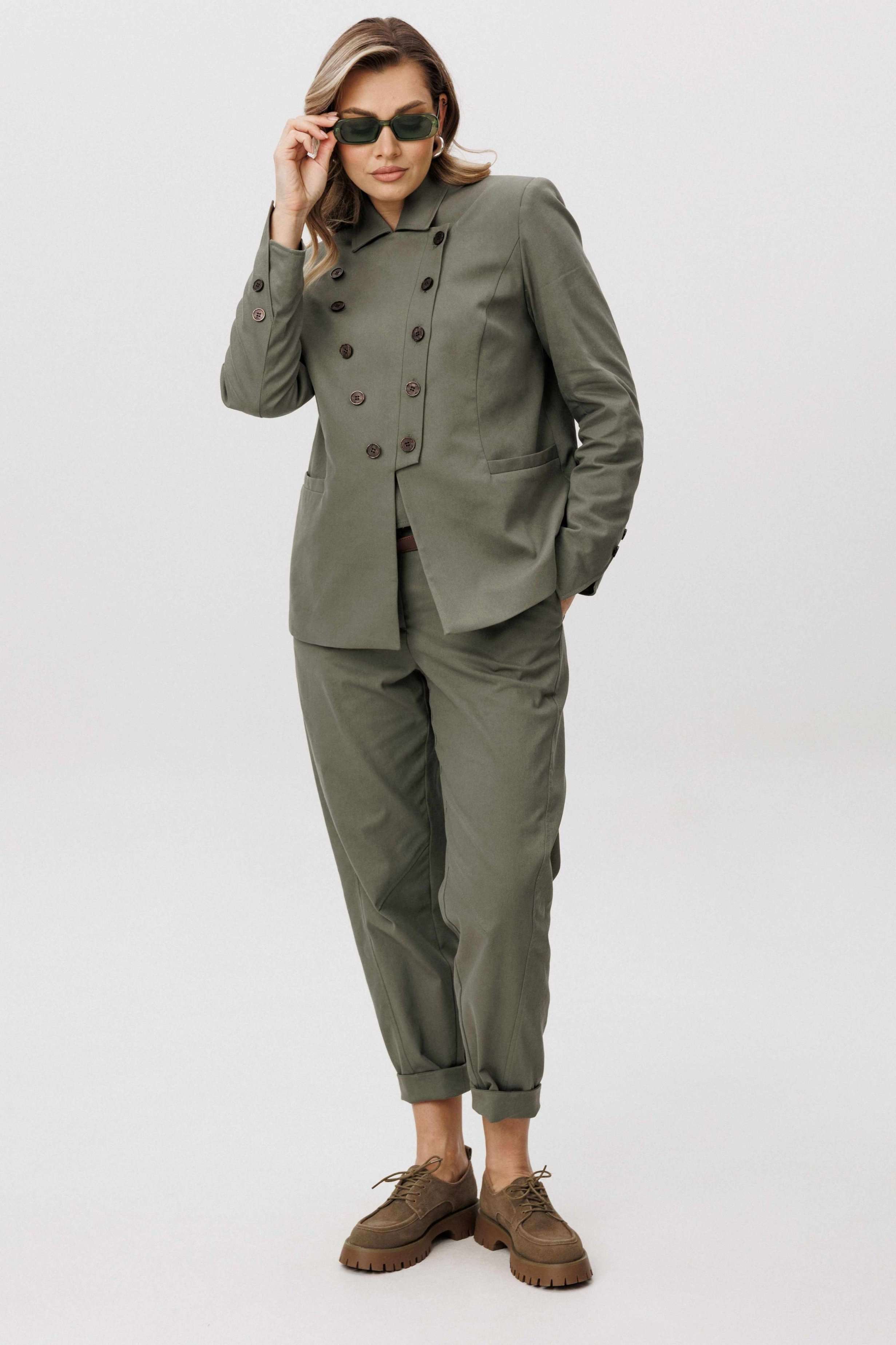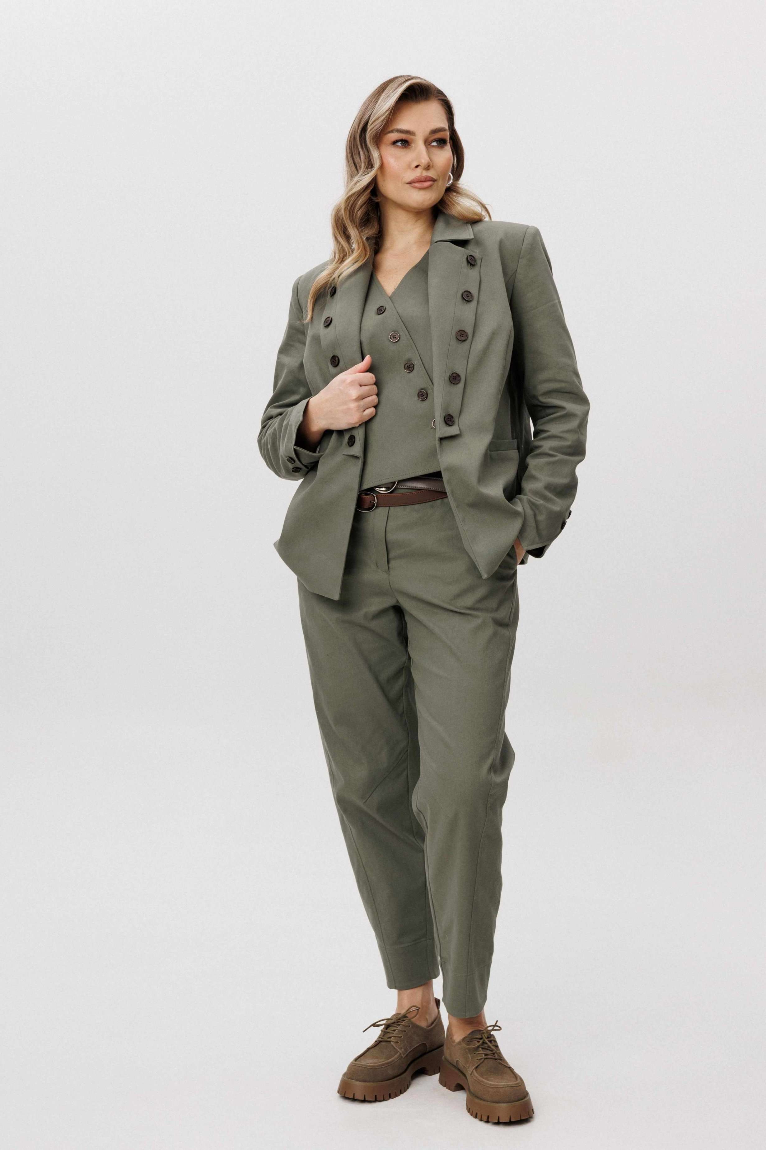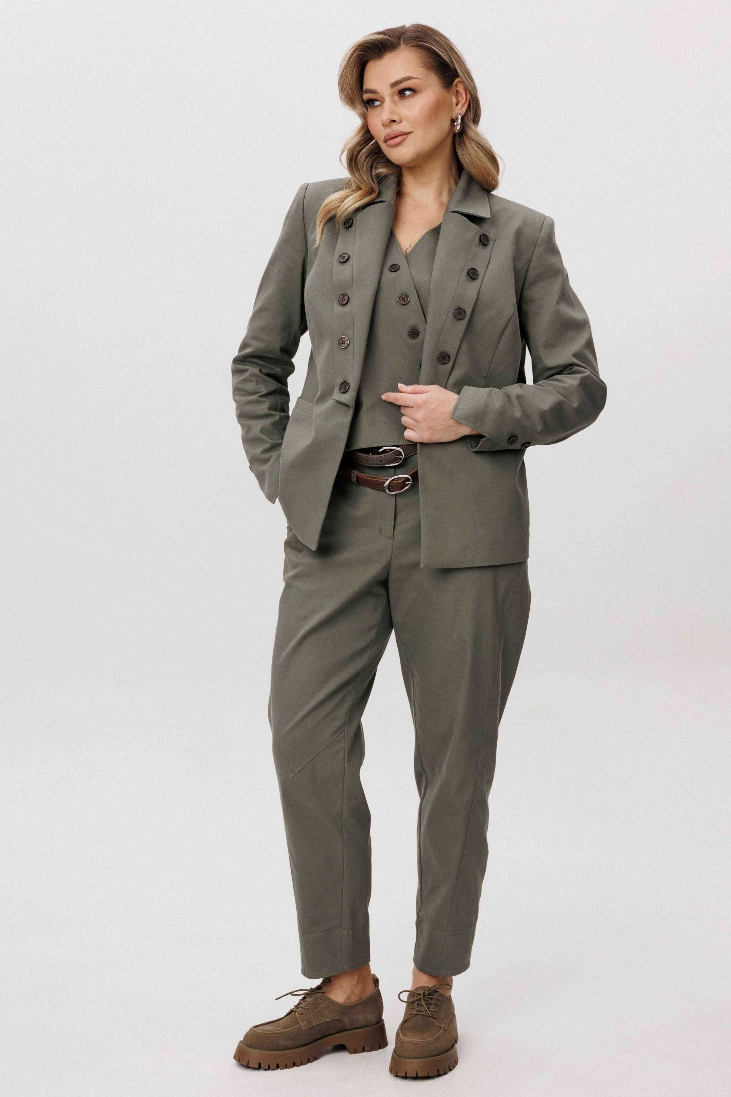 Современная брючная тройка, сочетающая продуманный крой и комфорт повседневного гардероба. Модель выполнена в стиле casual и подходит для динамичного городского ритма, сохраняя аккуратный и собранный внешний вид. Жакет отличается двубортной косой застёжкой, которая легко трансформируется в отложной лацкан. Лацкан фиксируется к полочке с помощью пуговиц, что позволяет менять характер образа — от более строгого к расслабленному. Жилет с асимметричной застёжкой и неровной линией низа добавляет образу архитектурность и подчёркивает дизайнерский подход. Брюки сложного кроя выполнены с цельнокроеным поясом спереди и притачным эластичным поясом на спинке, обеспечивающим комфортную посадку. Слегка зауженный книзу силуэт и наклонные боковые карманы формируют современную линию и визуально вытягивают фигуру. Костюм легко адаптируется под разные стилистические сценарии — от повседневных городских образов до smart casual, сочетаясь как с обувью на плоском ходу, так и с более акцентной парой. Ремень в комплект не входит!