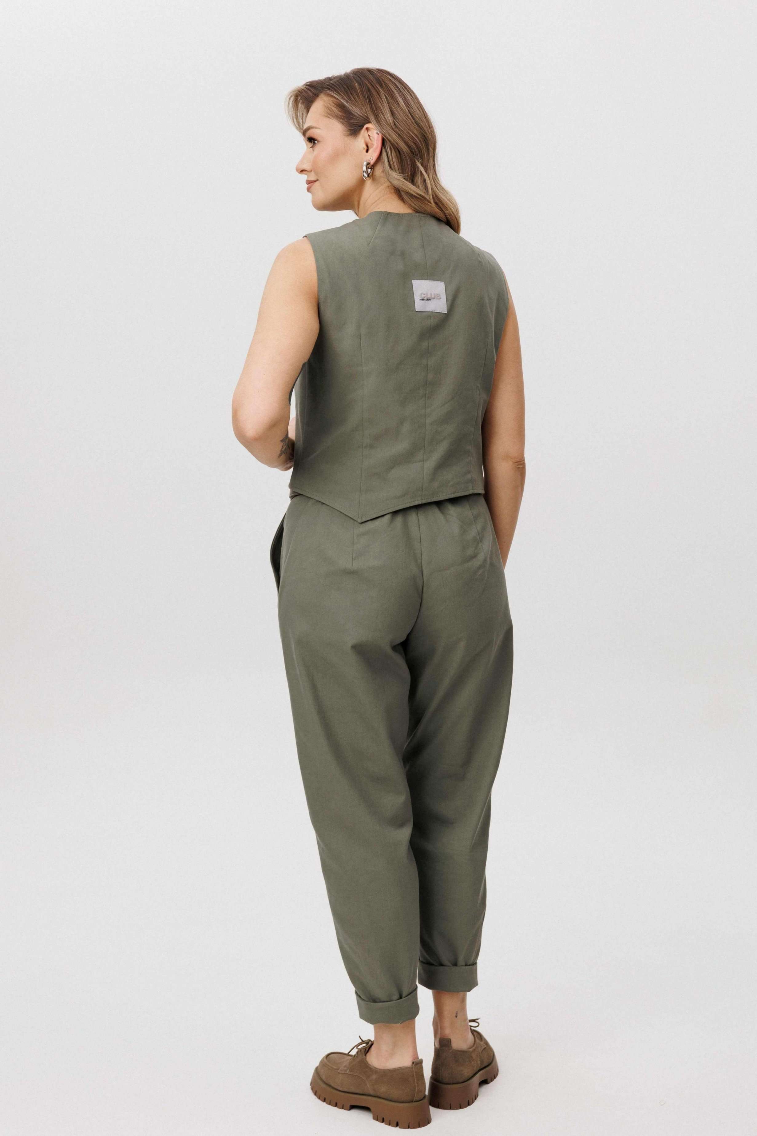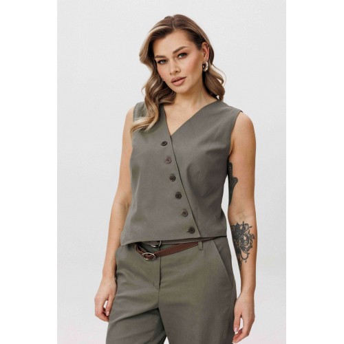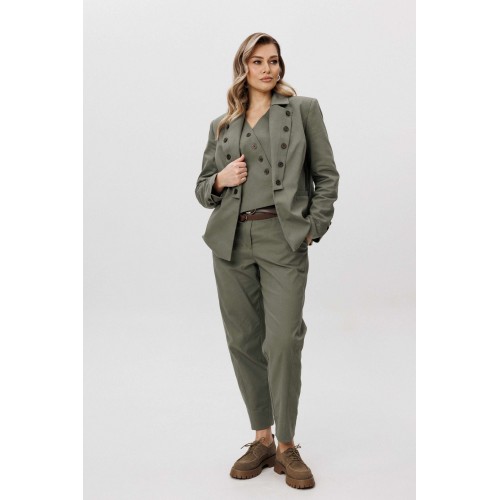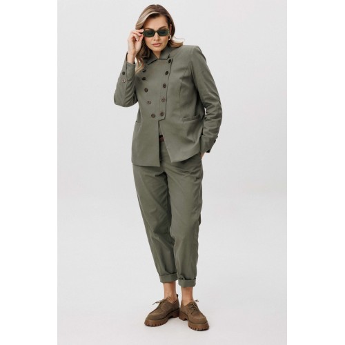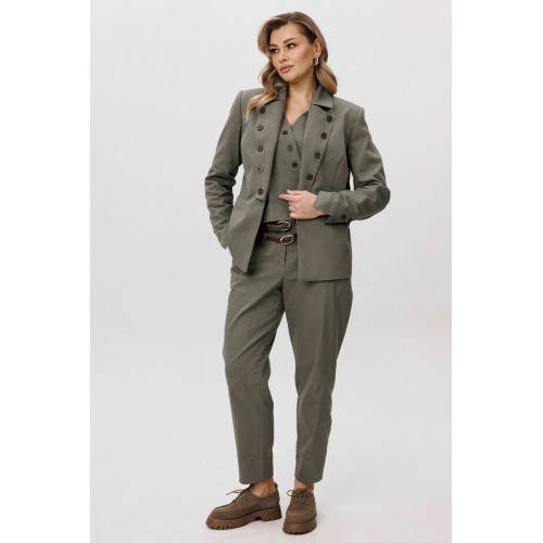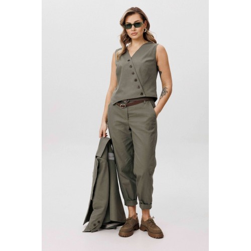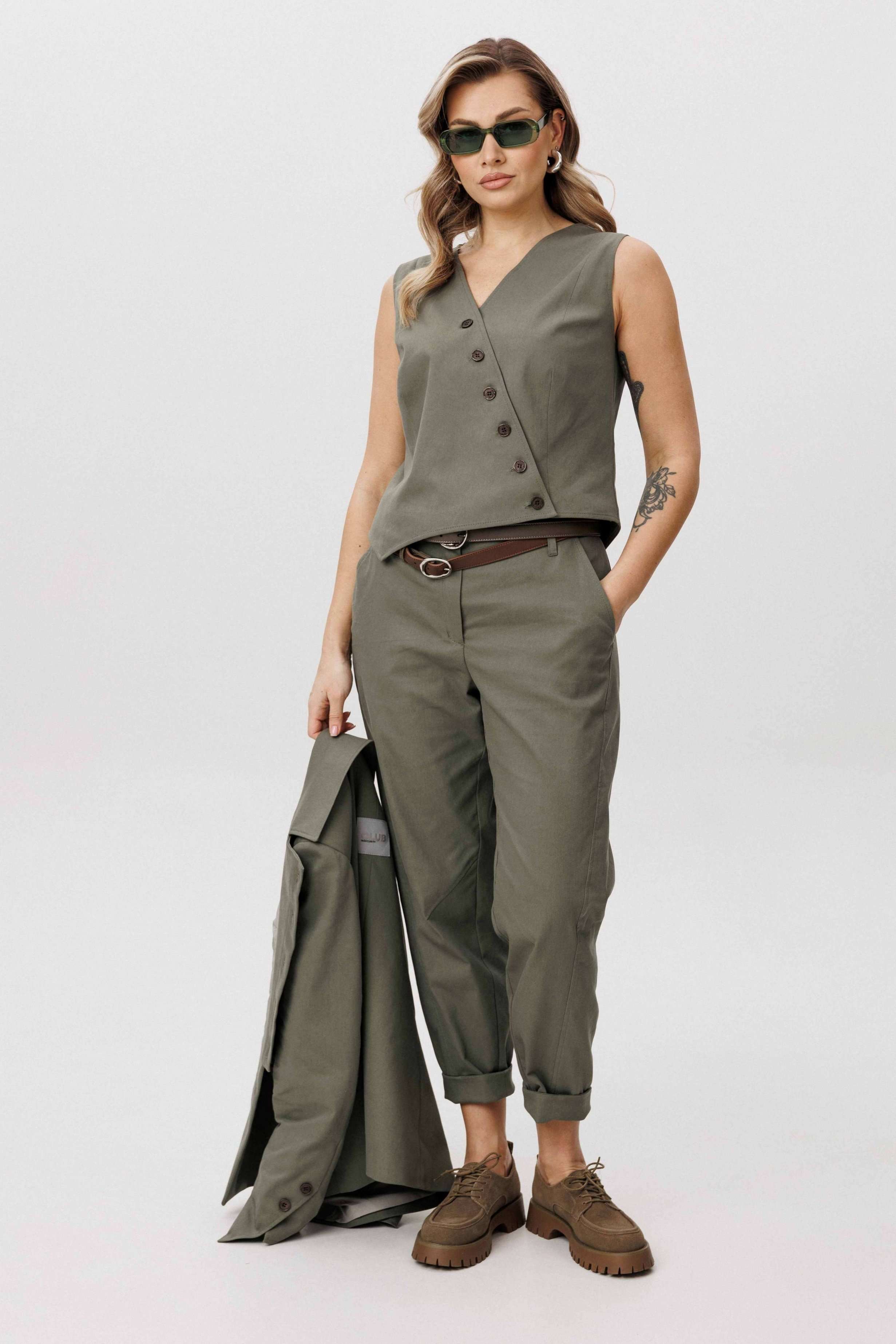 Современная брючная тройка, сочетающая продуманный крой и комфорт повседневного гардероба. Модель выполнена в стиле casual и подходит для динамичного городского ритма, сохраняя аккуратный и собранный внешний вид. Жакет отличается двубортной косой застёжкой, которая легко трансформируется в отложной лацкан. Лацкан фиксируется к полочке с помощью пуговиц, что позволяет менять характер образа — от более строгого к расслабленному. Жилет с асимметричной застёжкой и неровной линией низа добавляет образу архитектурность и подчёркивает дизайнерский подход. Брюки сложного кроя выполнены с цельнокроеным поясом спереди и притачным эластичным поясом на спинке, обеспечивающим комфортную посадку. Слегка зауженный книзу силуэт и наклонные боковые карманы формируют современную линию и визуально вытягивают фигуру. Костюм легко адаптируется под разные стилистические сценарии — от повседневных городских образов до smart casual, сочетаясь как с обувью на плоском ходу, так и с более акцентной парой. Ремень в комплект не входит!