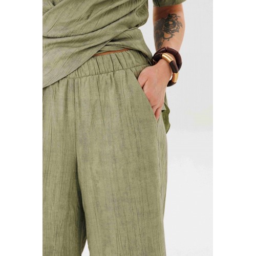 Этот стильный костюм — воплощение летней элегантности и комфорта. Модель выполнена из вискозной ткани с эффектом жатки, что не только актуально в этом сезоне, но и крайне практично: одежда меньше мнется и сохраняет безупречный вид в течение всего дня. Широкие, длинные, струящиеся брюки-палаццо - одна из самых актуальных моделей брюк. Они обладают свойством добавлять нотку расслабленного шика любому образу, и, несомненно, они особенно эффектно выглядят в нарядных комплектах. Брюки свободные, на притачном эластичном поясе. Длина брюк около 108 см. Оригинальная блуза с драпировкой мягко подчеркивает талию, создавая женственный и притягательный силуэт. Свободный силуэт, рубашечный покрой, рукав короткий, эффектная драпировка по переду и кокетливый пояс-завязка по спинке. Длина блузы около 80 см.