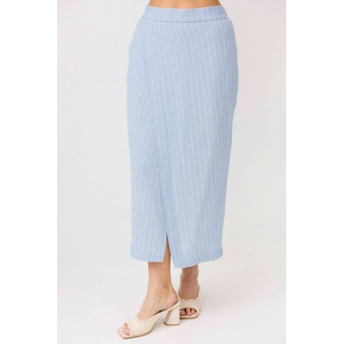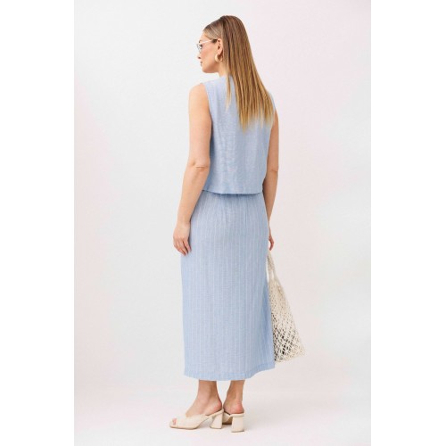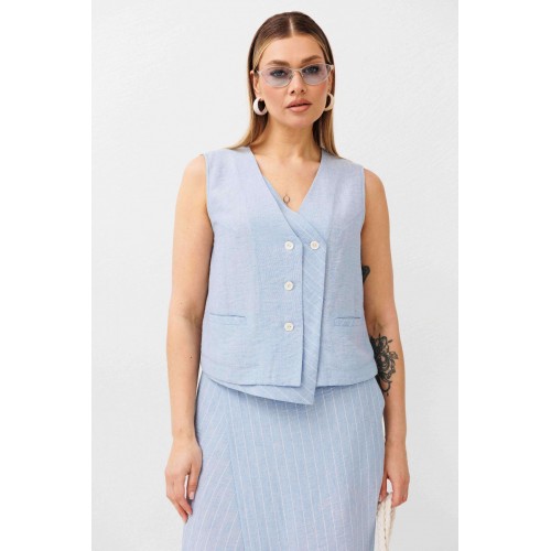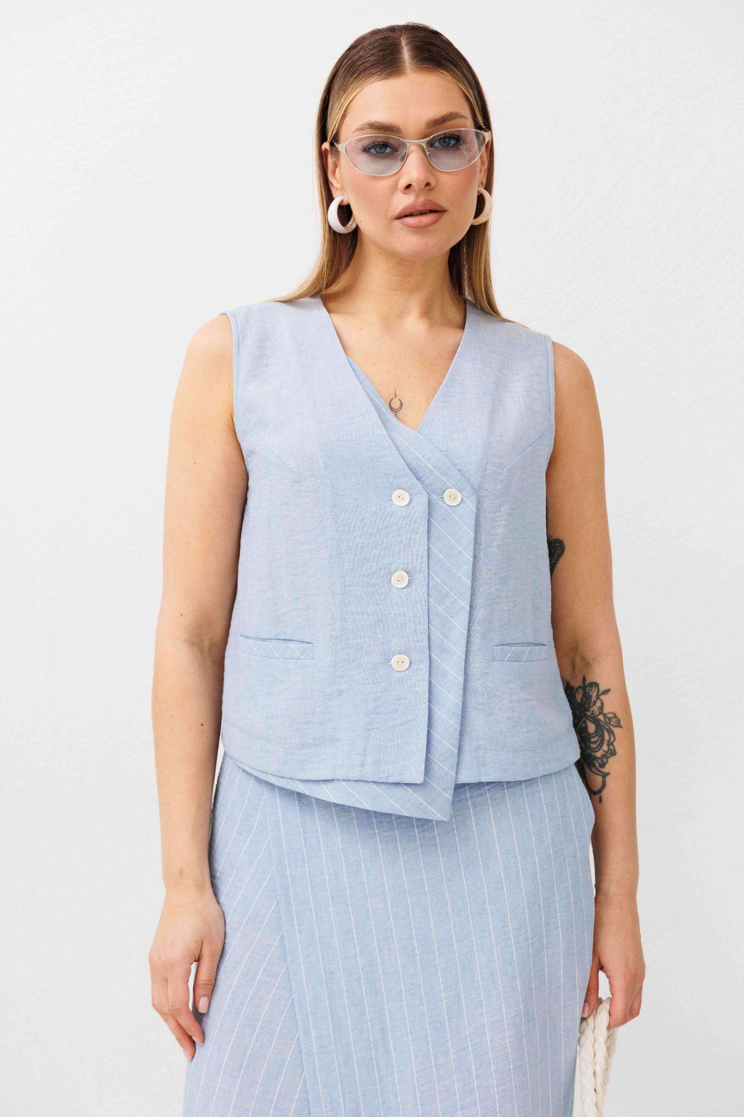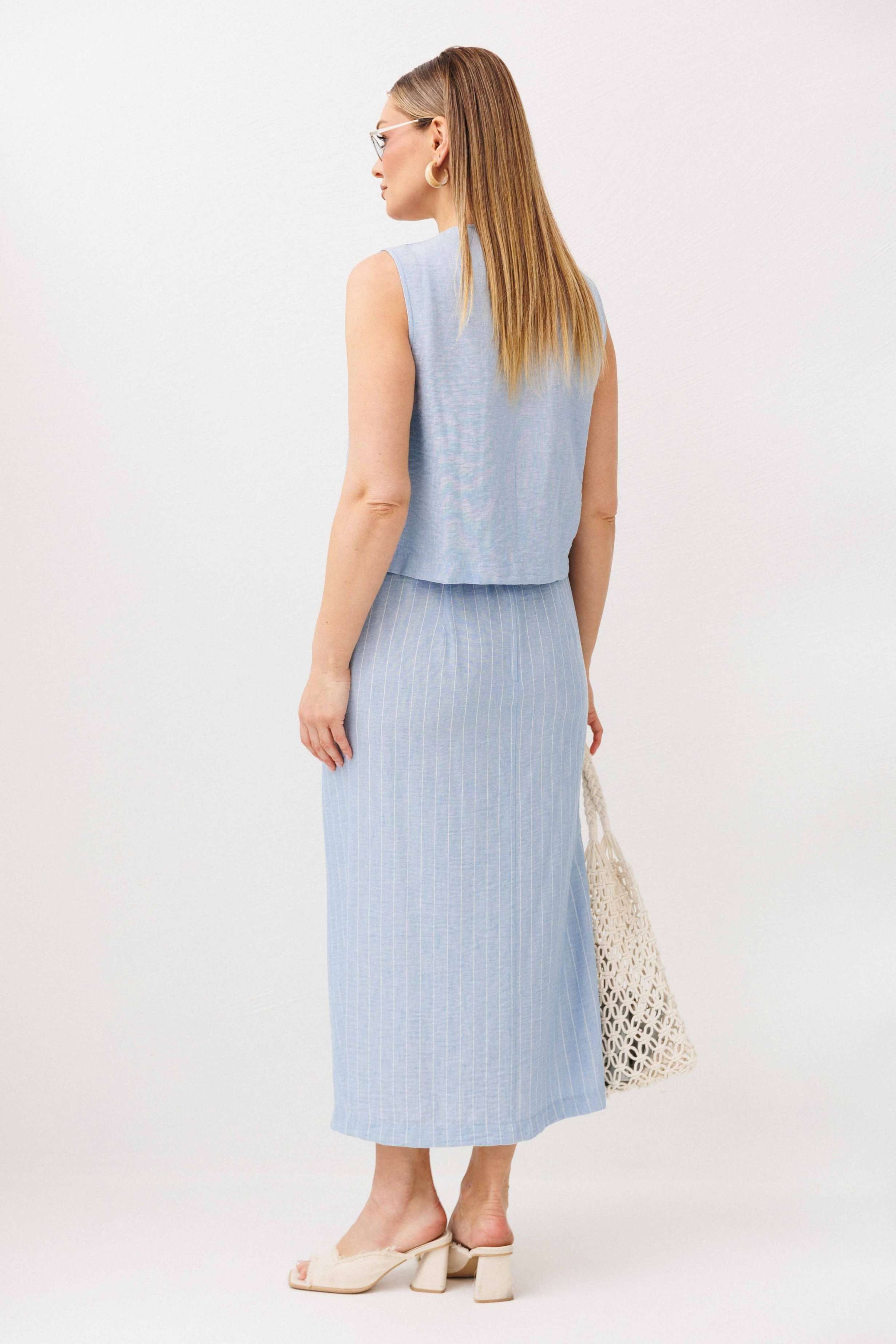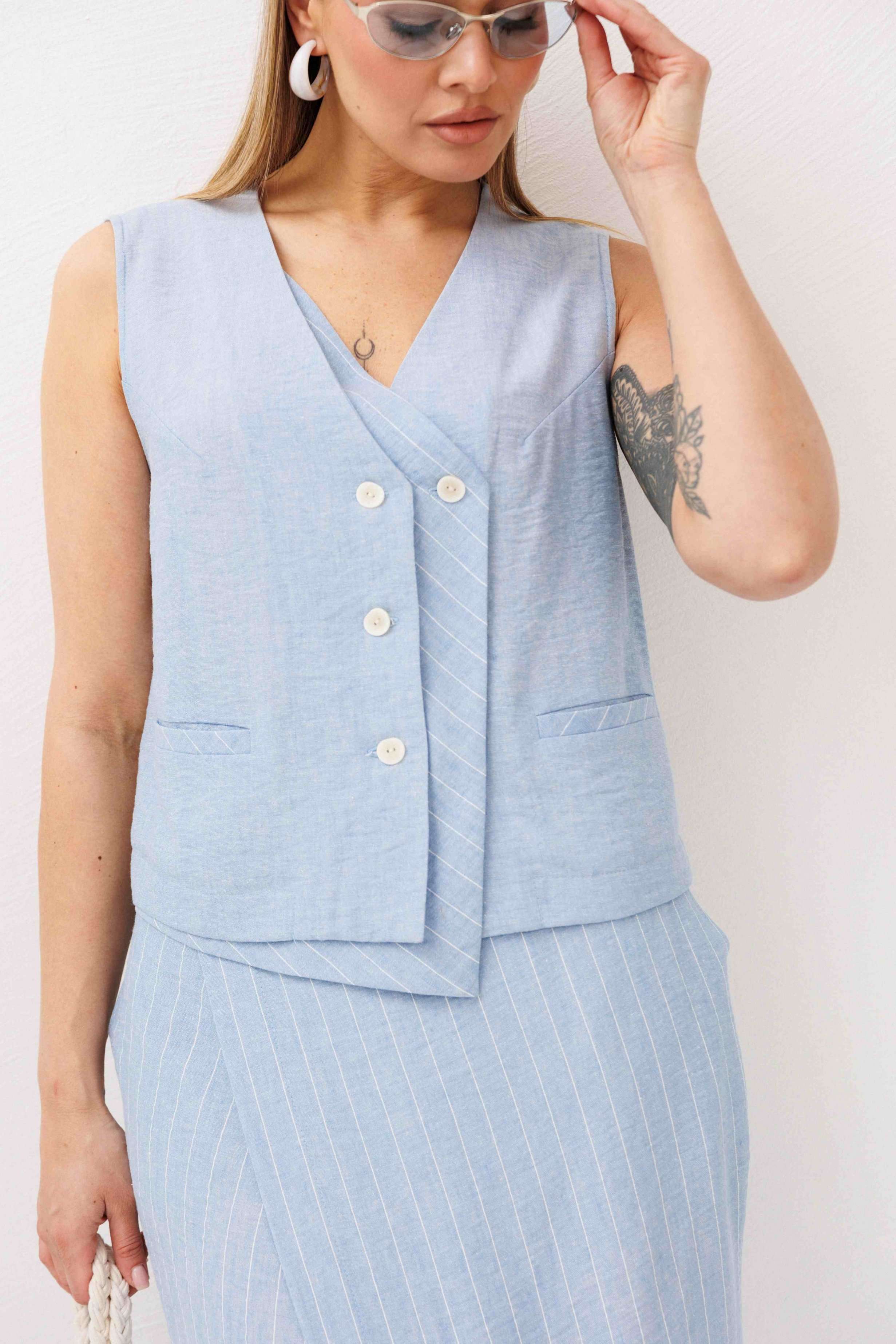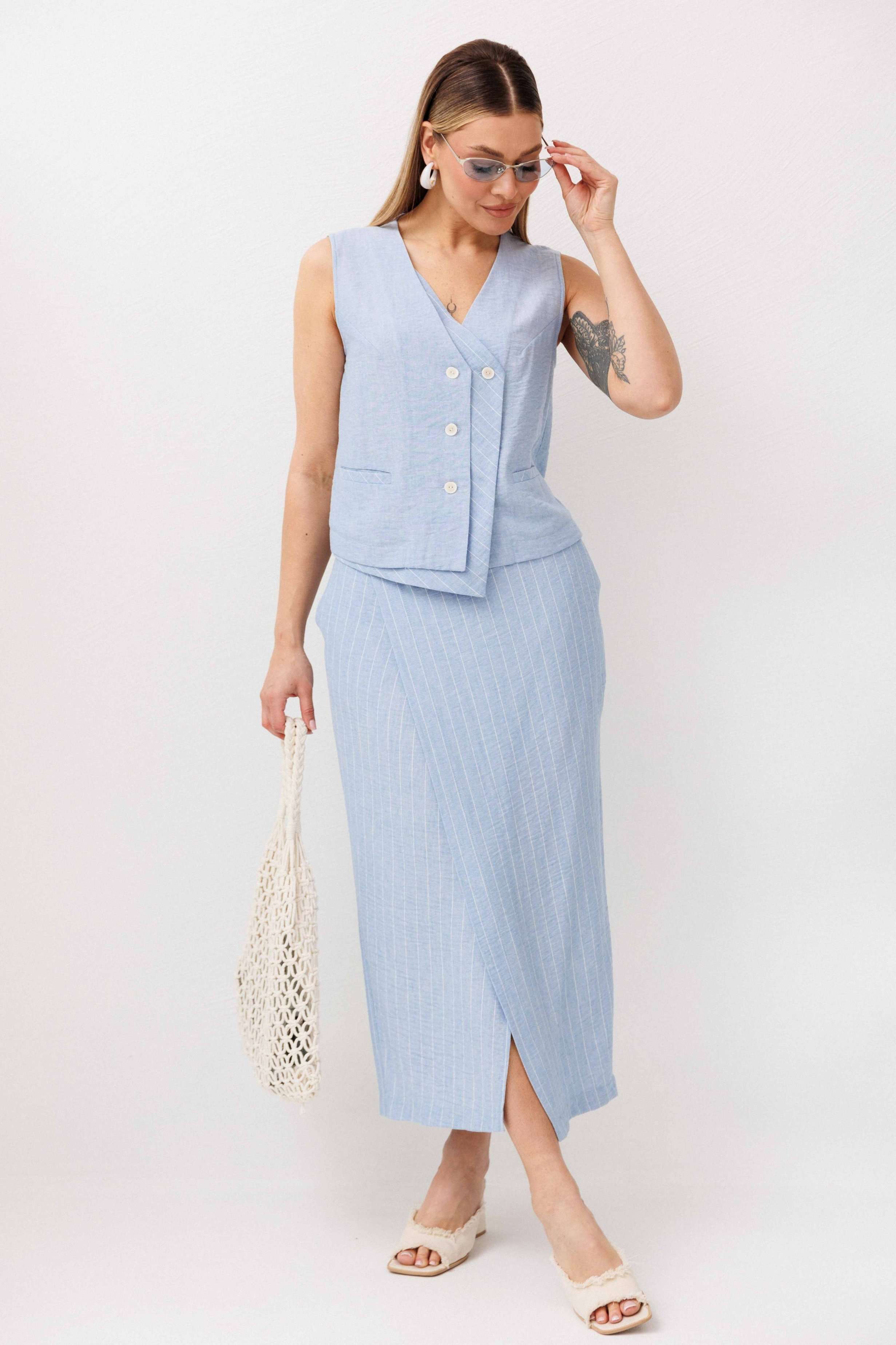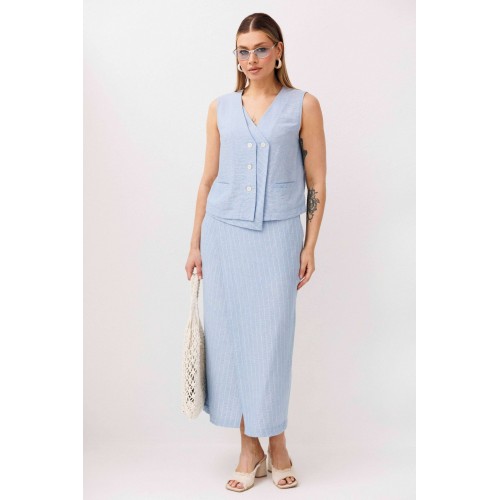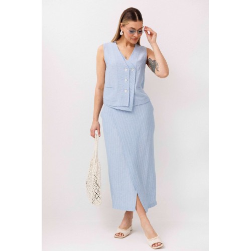 Легкий, стильный и невероятно комфортный комплект из льняного смесового полотна — идеальный выбор для теплого сезона. Он сочетает в себе натуральность, воздухопроницаемость и современный лаконичный дизайн, который легко впишется в повседневный гардероб. Жилет на пуговицах создает аккуратный, собранный силуэт, а юбка миди с запахом добавляет женственности и комфорта при движении. Мягкий голубой оттенок и деликатная вертикальная полоска делают образ свежим, женственным и визуально вытягивают фигуру. Комплект отлично подойдет для прогулок, работы, встреч и отпускных образов. Носите его вместе или по отдельности — каждый элемент легко комбинируется с базовыми вещами и помогает создавать стильные сочетания на каждый день.