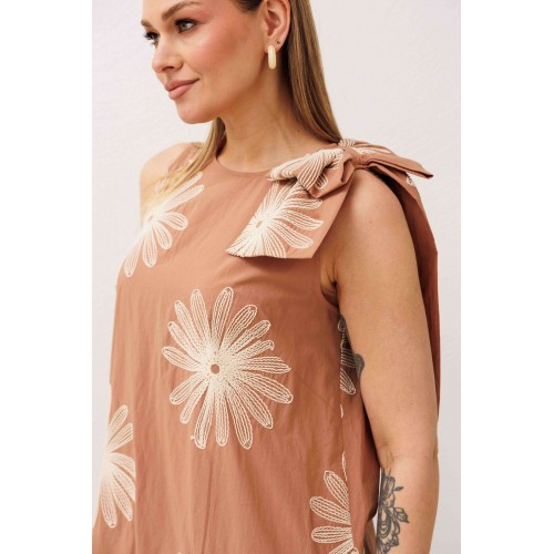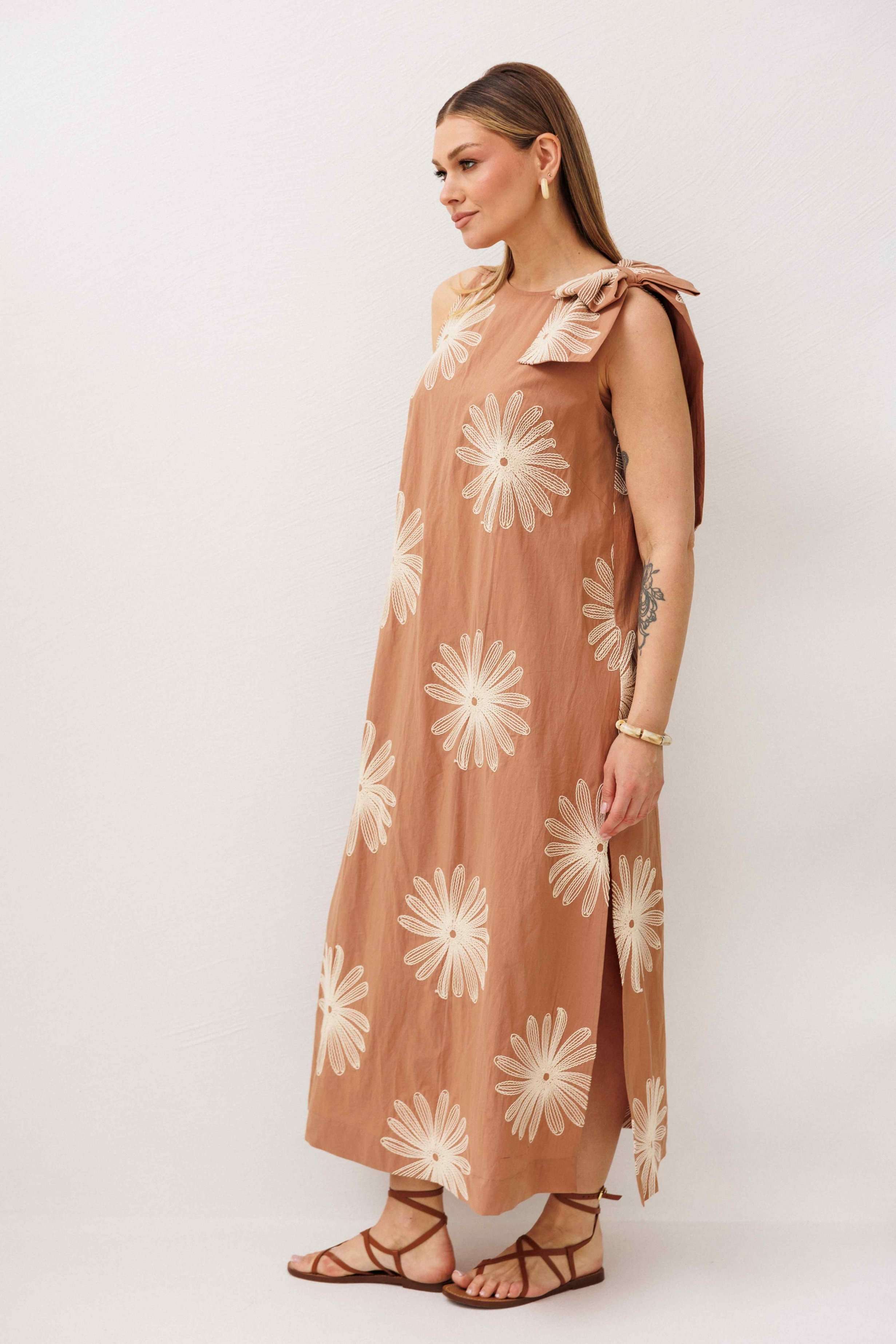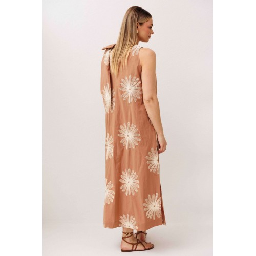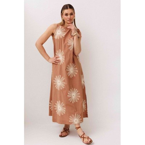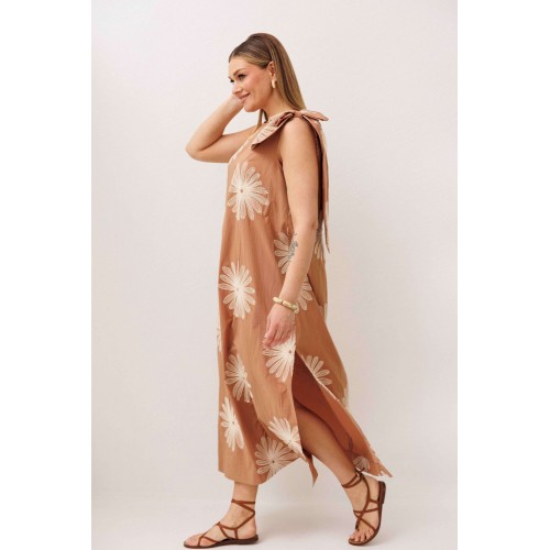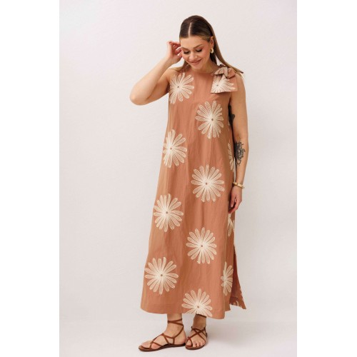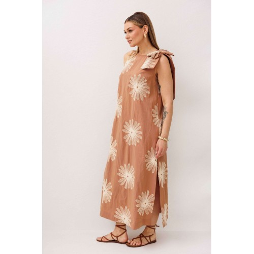 Это стильное летнее платье-макси станет идеальным дополнением вашего гардероба для солнечных дней и особых моментов. Платье свободного А-силуэта, который отлично сидит на любой фигуре и подчеркивает ее достоинства. Элегантный акцент в виде крупного съемного банта на плече придает образу женственности. Изделие выполнено из легкой воздухопроницаемой хлопковой ткани. Это обеспечивает максимальный комфорт даже в самую жаркую погоду. Длина платья около 132 см