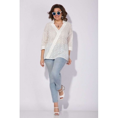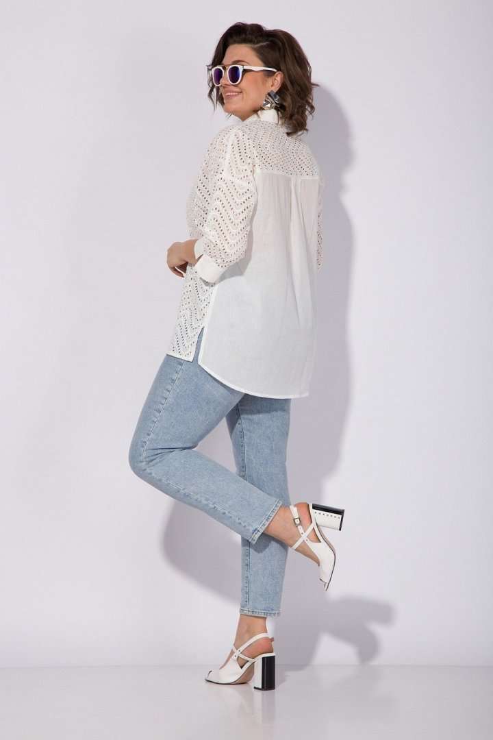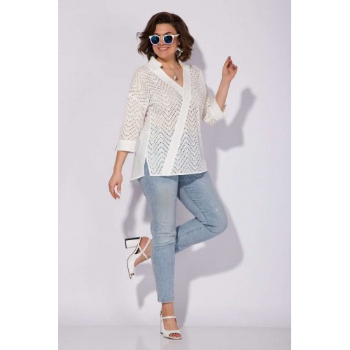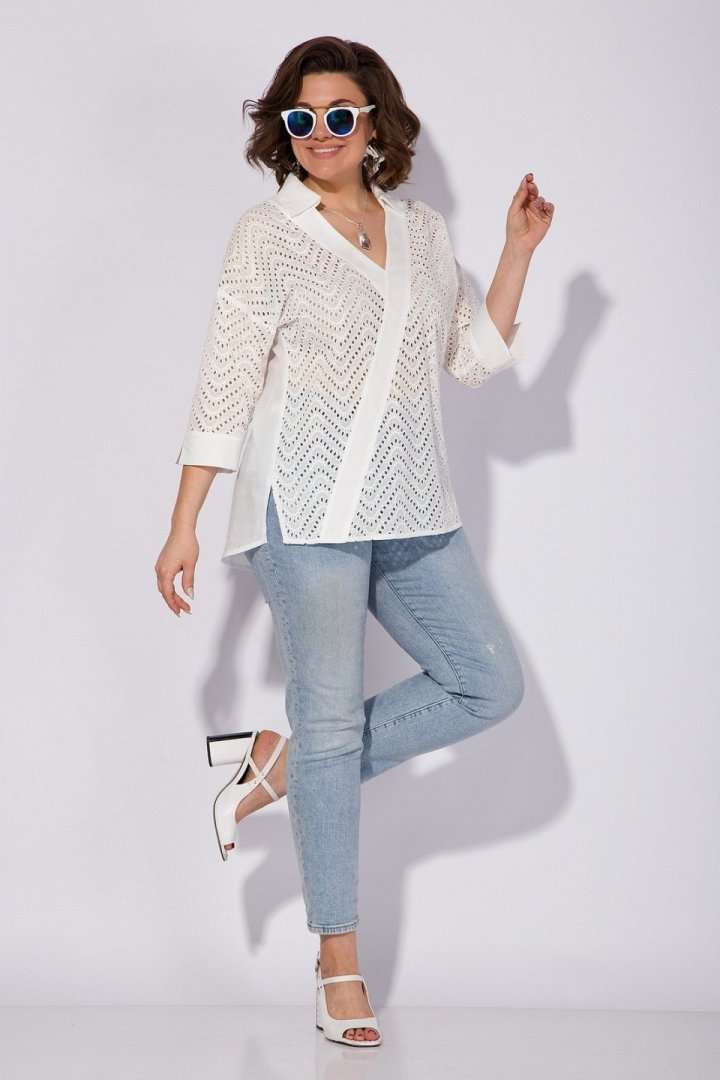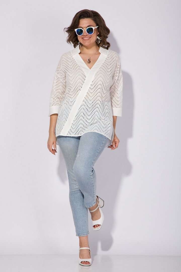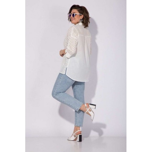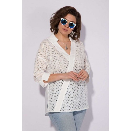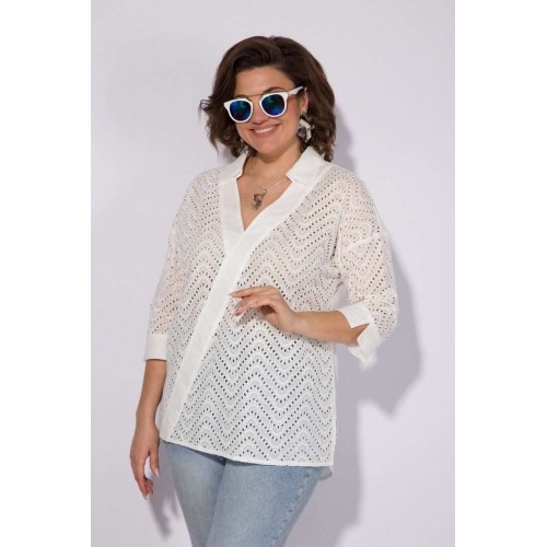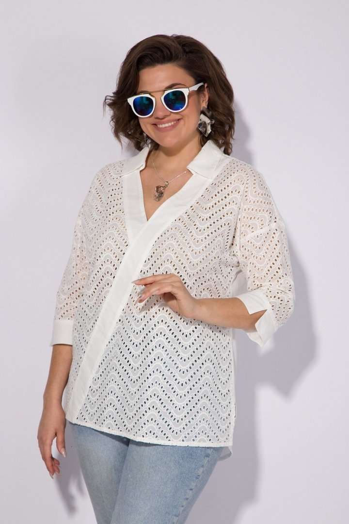 Эффектная хлопковая блузка из 100% хлопка с вышивкой ришелье! Модель свободного силуэта, со спущенной линией плеча и рубашечным рукавом длиной ¾-ти. Низ рукава обработан притачной манжетой с небольшим разрезом на отворот при желании. Оригинальность данной модели придает V-образный вырез с имитацией диагональной планки из однотонной ткани. Воротник в модели отложной, с небольшой стойкой. По бокам по низу изделия расположены разрезы на свободу движения. Спинка с кружевной кокеткой и заложенными складками на свободу. Низ полуовальной формы по спинке. Отличная, легкая, невесомая блузка на жаркое лето! Подойдет как для офиса, так и для жаркого солнечного лета!!! Длина по спинке: 75 см, рукав – 70 см. Рукав – 40 см.