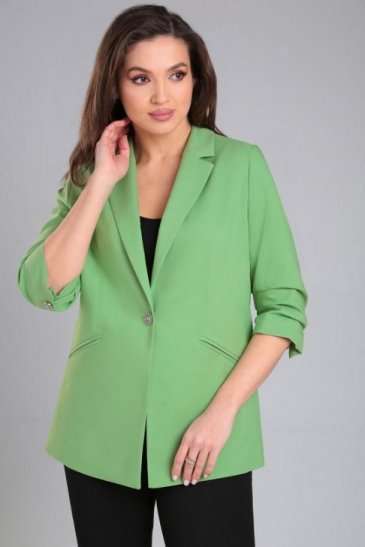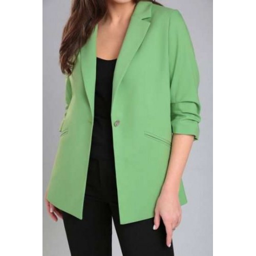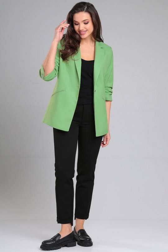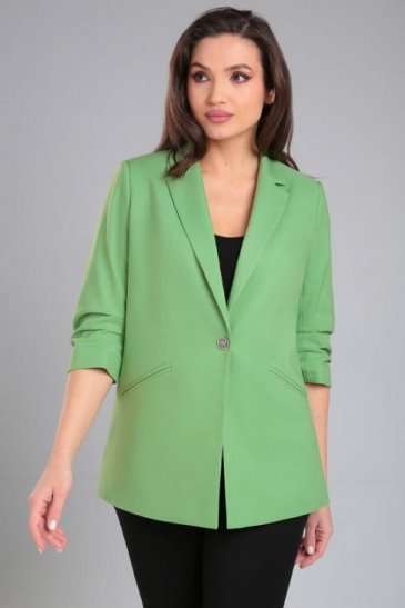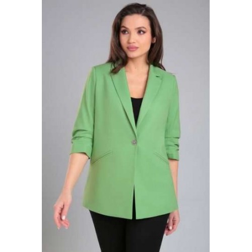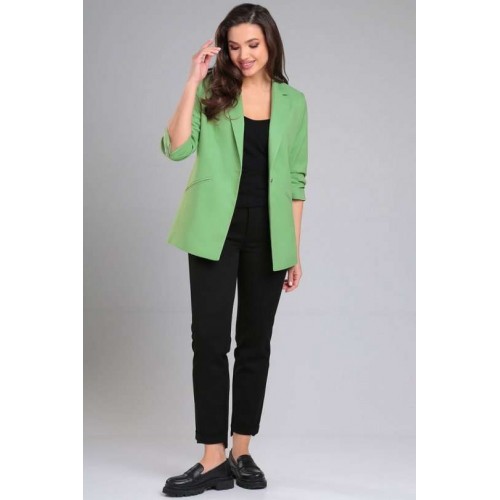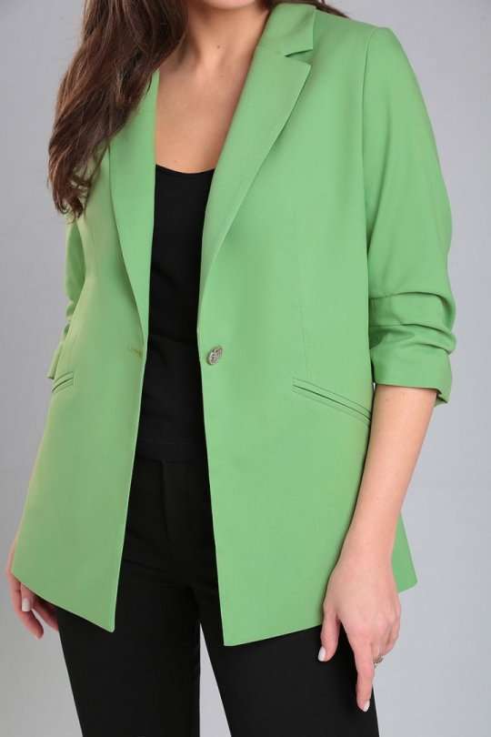 Жакет женский прямого силуэта на стрейчевой, шелковистой подкладке. По переду отрезной бочок, нагрудная вытачка, функциональные карманы в рамку. Спинка со средним швом и рельефами из проймы. Воротник пиджачного типа. Застежка центральная бортовая застегивающаяся на 1 декоративную пуговицу. Рукав втачной, двухшовный, укороченный, со складками по внутреннему шву рукава и короткой шлицей с пуговицей.