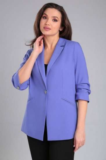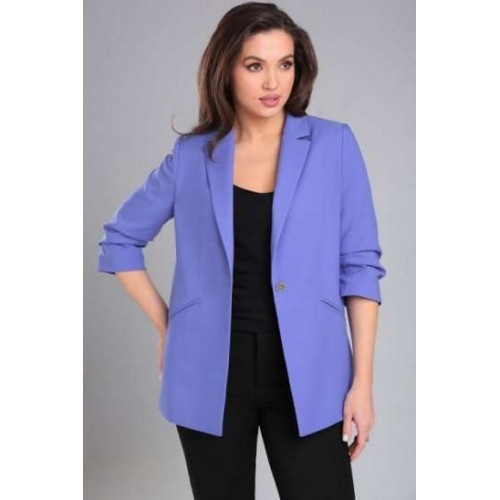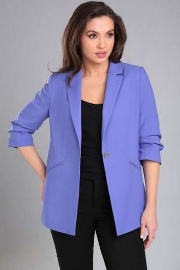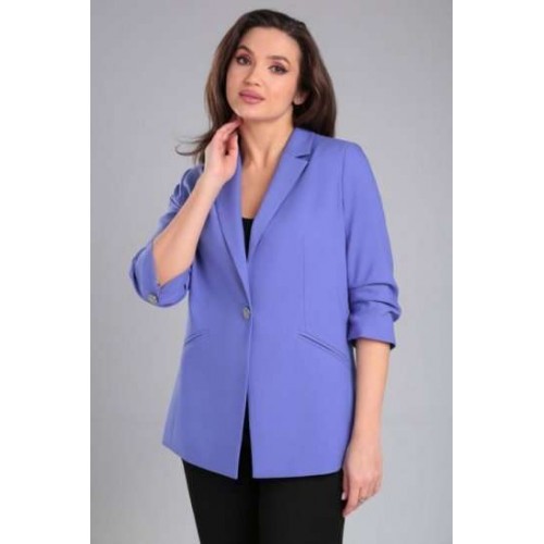 Жакет женский прямого силуэта на стрейчевой, шелковистой подкладке. По переду отрезной бочок, нагрудная вытачка, функциональные карманы в рамку. Спинка со средним швом и рельефами из проймы. Воротник пиджачного типа. Застежка центральная бортовая застегивающаяся на 1 декоративную пуговицу. Рукав втачной, двухшовный, укороченный, со складками по внутреннему шву рукава и короткой шлицей с пуговицей.