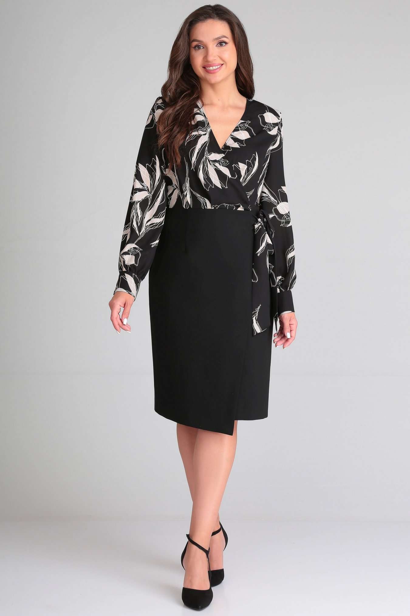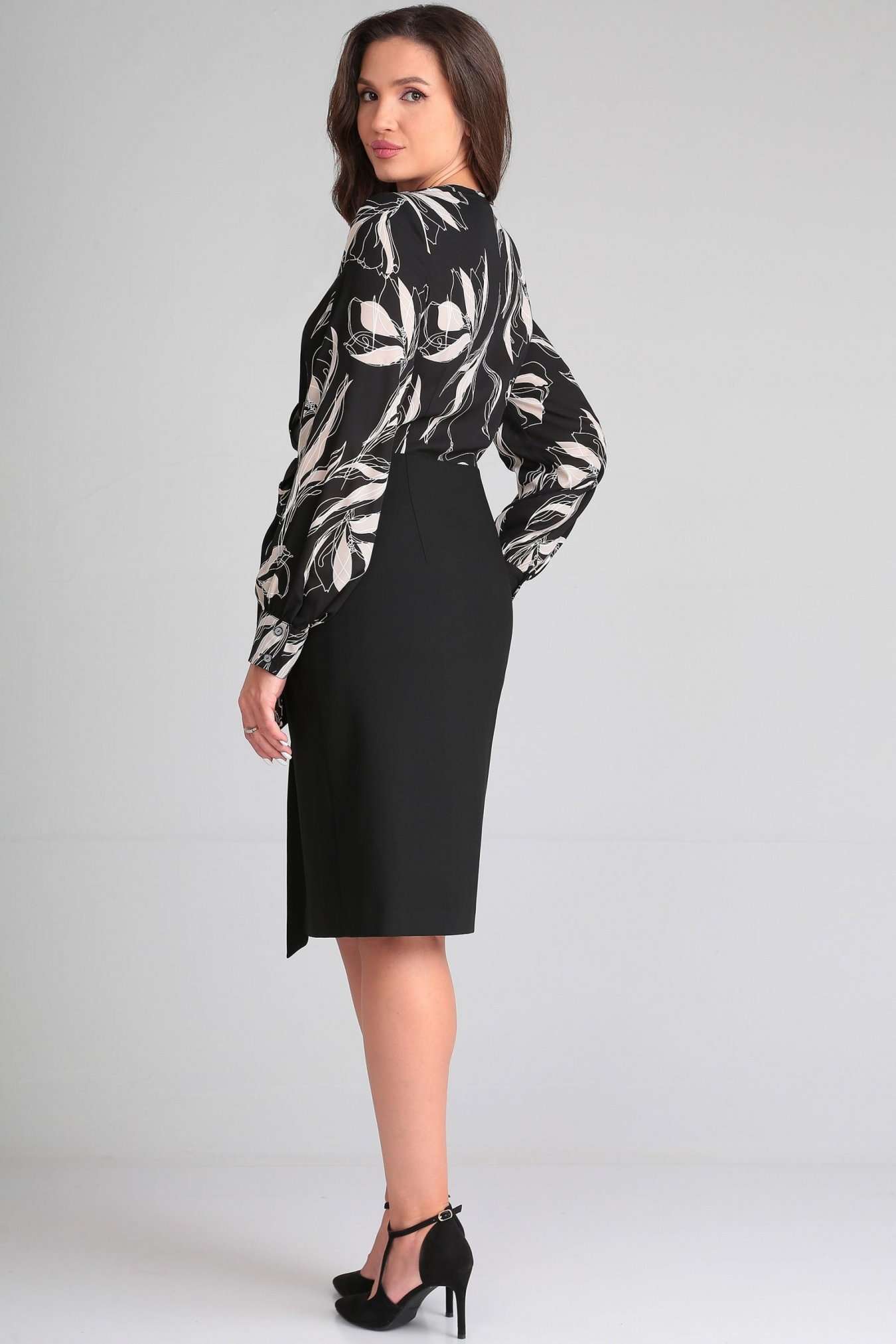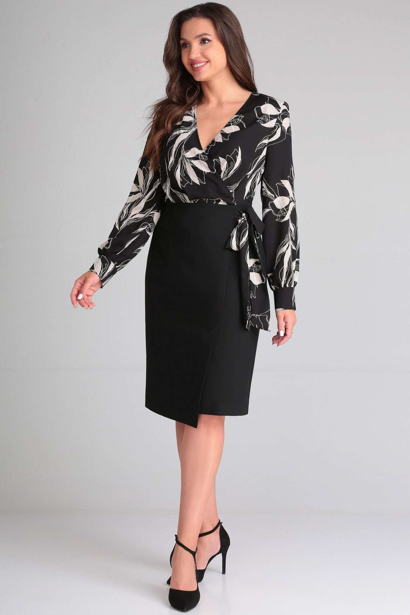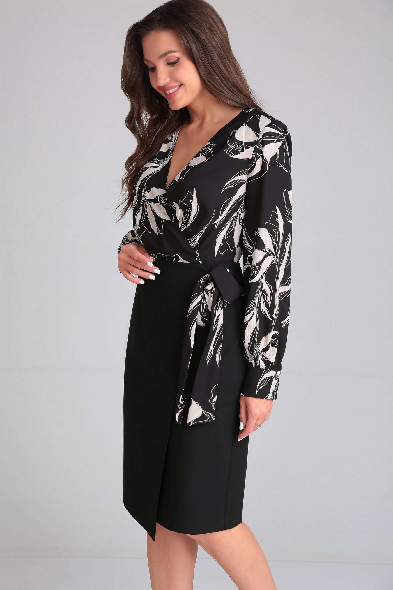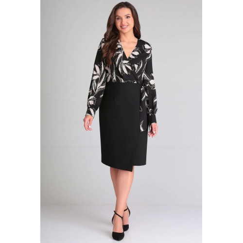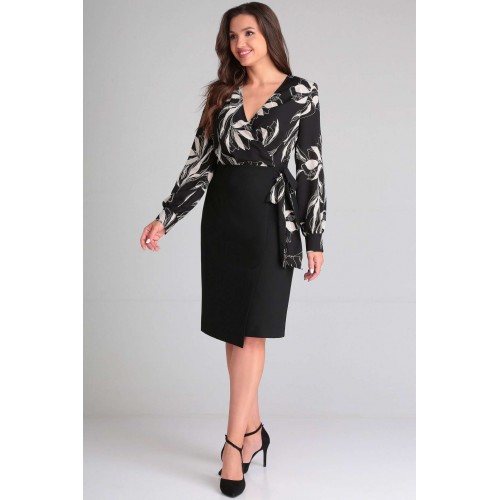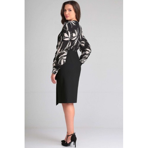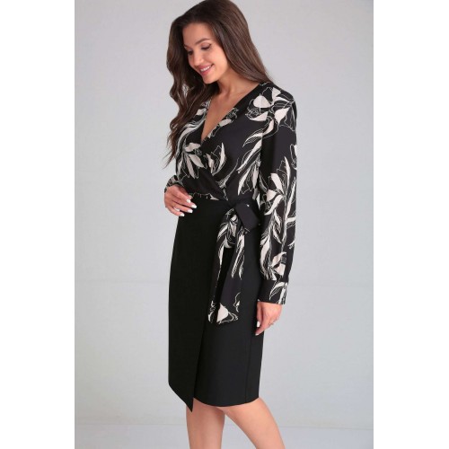 Платье женское полуприлегающего силуэта, втачного покроя. Отрезное по линии талии. Верхняя часть платья и рукава выполнены из креп-шифона с дизайном, нижняя часть из плательной ткани контрастного цвета. По спинке и переду талиевые вытачки. Вырез горловины V-образный. Верхняя часть платья на запахе, который фиксируется на потайную кнопку. На левой стороне нижней части переда рельеф со шлицей по низу. В рельеф переда и левый боковой шов вставлены пояса из креп-шифона, которые завязываются на мягкий бант. Рукав длинный, одношевный с манжетой по низу, манжета застегивается на две пуговицы.