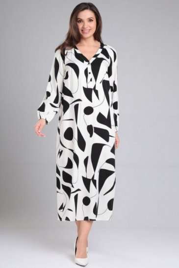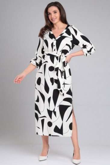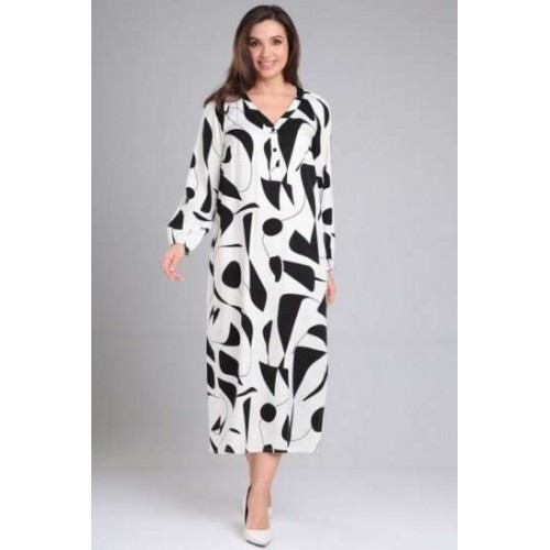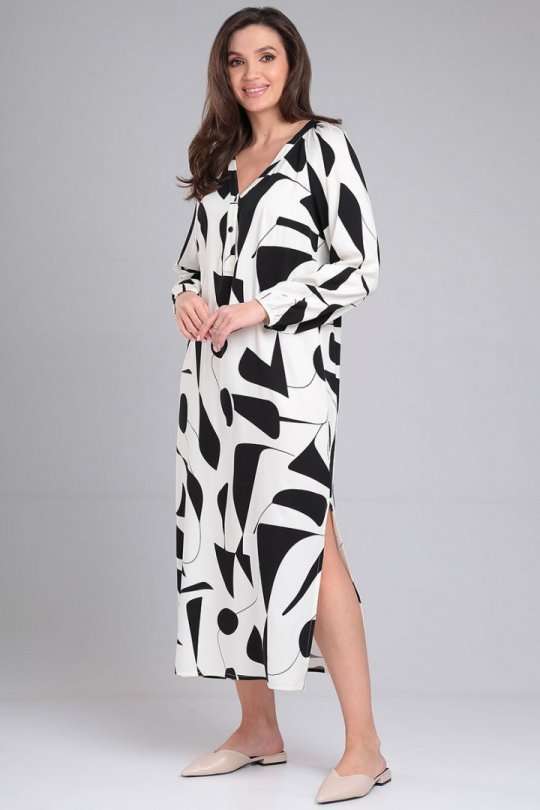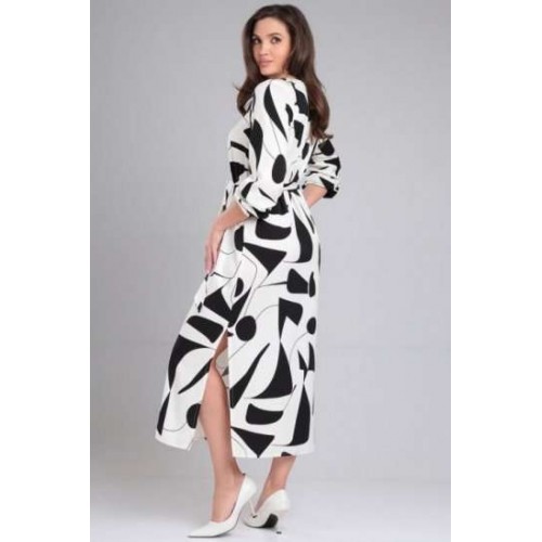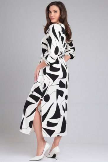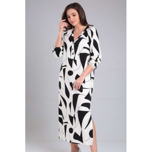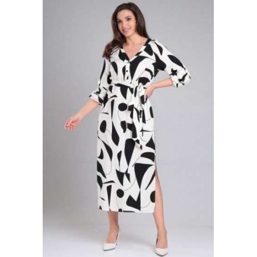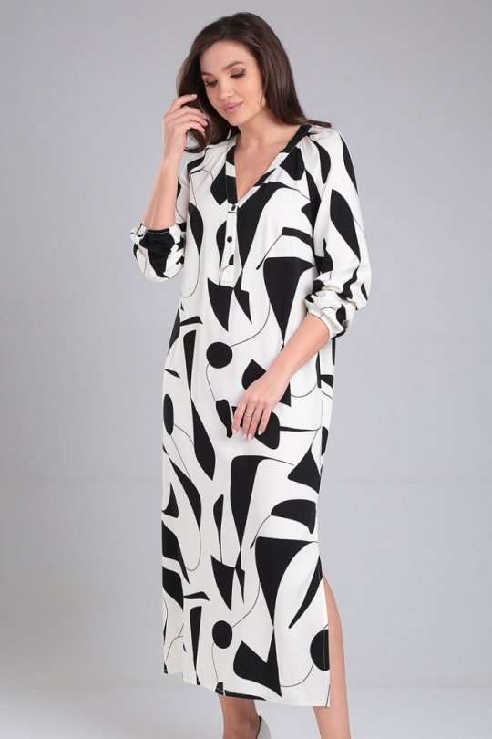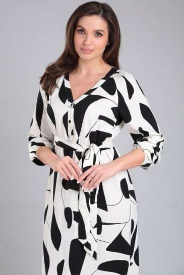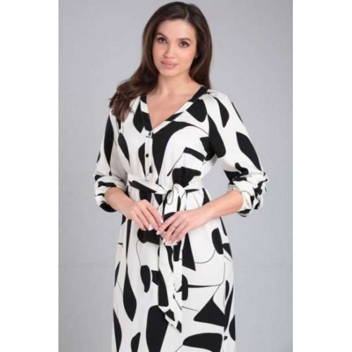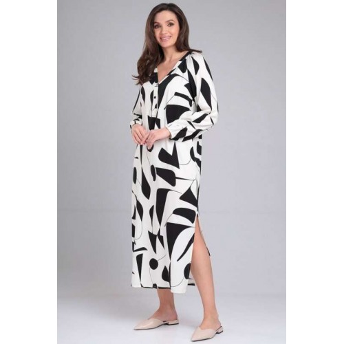 Платье прямого силуэта. Рукав реглан со сборкой в области плеча, длинный на резинке по низу. Застежка на втачную планку переходящая в планку горловины застёгивается на 2 петли и пуговицы. По левому боку разрез. Без карманов. В комплект входит пояс из основной ткани.