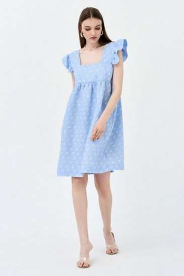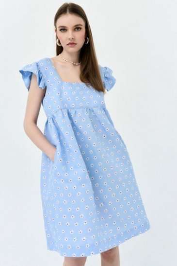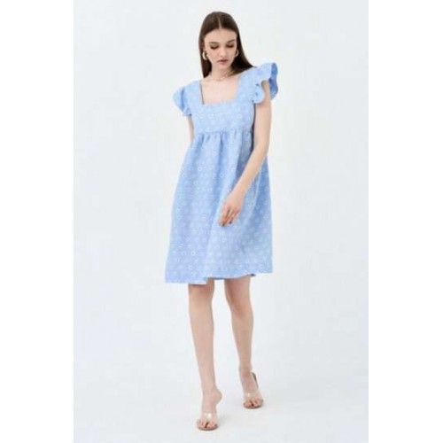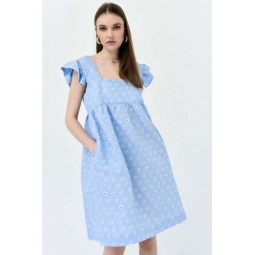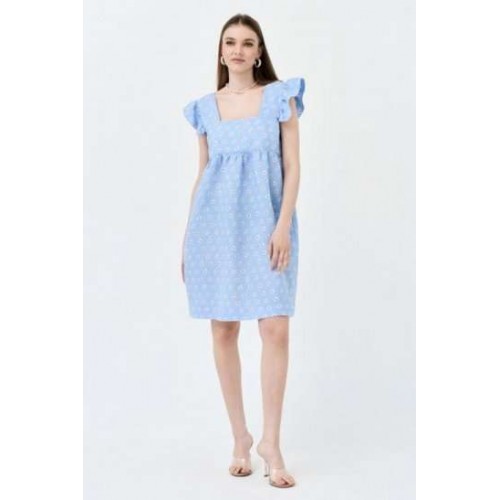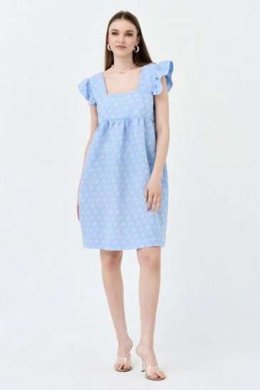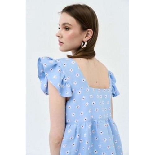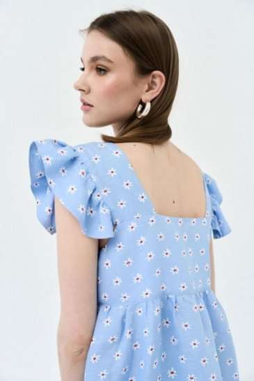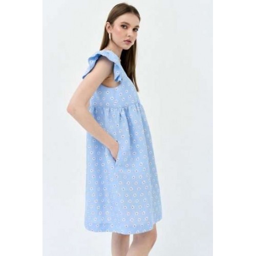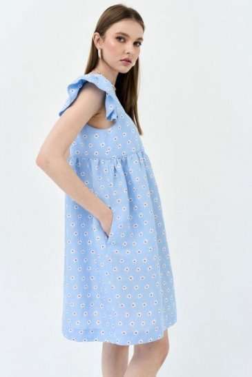 Сарафан А-силуэта. По переду и спинке горизонтальная кокетка, нижняя часть платья со сборкой. На широких бретелях, во внешний шов бретели вставлены воланы-крылышки со сборкой. В боковых швах карманы. Сарафан без подкладки в нижней части.