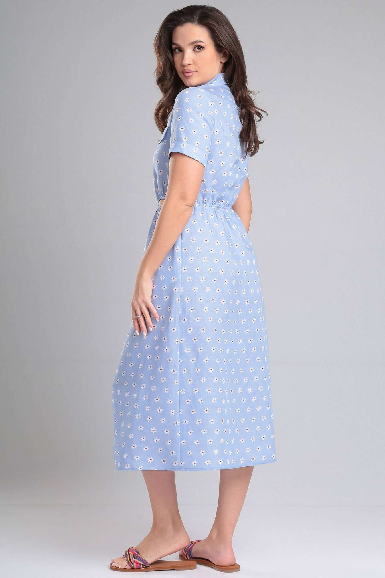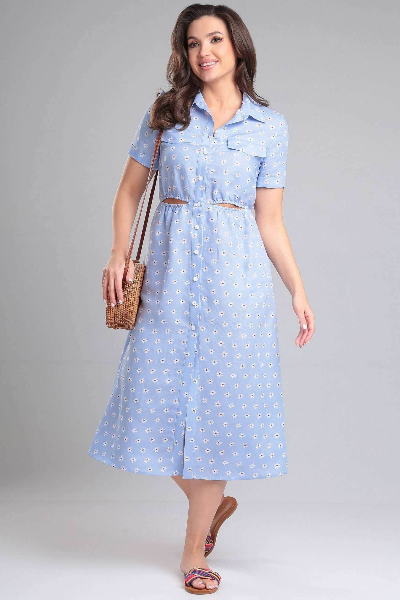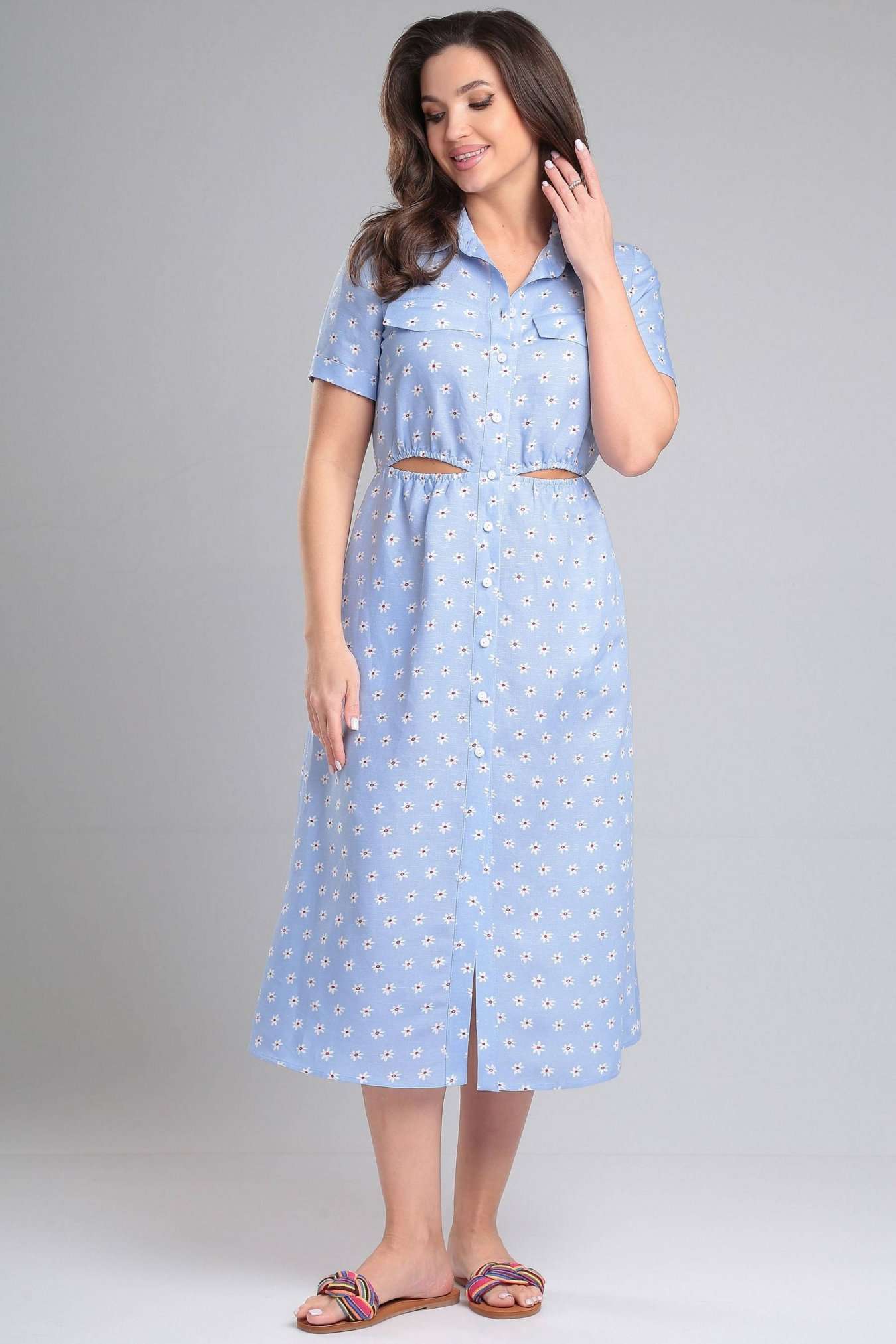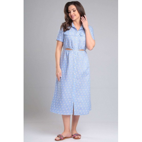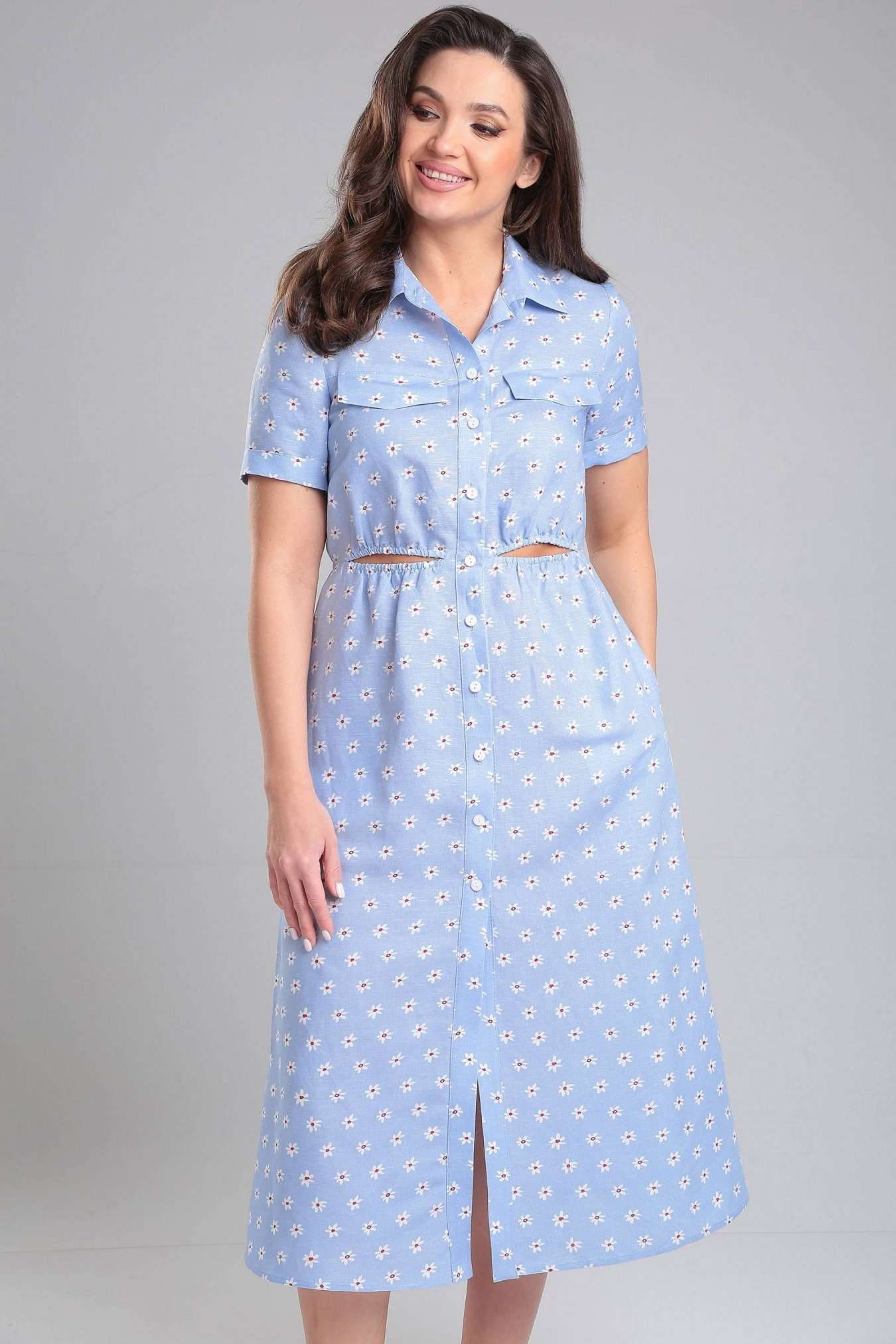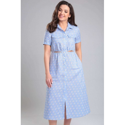 Платье женское, отрезное по линии талии, в подрезе талии по переду расположены декоративные вырезы с резинкой. По переду горизонтальная кокетка выше линии груди, в кокетку вставлены клапаны. Воротник стояче-отложной на отрезной стойке. Застежка на притачную планку, на петли и пуговицы. Рукав одношовный, короткий, втачной, с притачной отложной манжетой по низу рукава. В боковых швах расположены функциональные карманы.