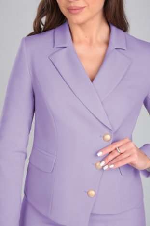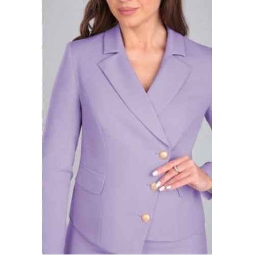 Комплект женский состоящий из жакета и юбки. Жакет полуприлегающего силуэта на подкладке. По переду и спинке фигурные рельефы,в рельефах переда функциональные карманы в рамку с клапаном. Застежка асимметричная (сверху двубортная,снизу однобортная) бортовая застегивающаяся на петли и декоративные пуговицы. Воротник пиджачного типа. Рукав втачной двухшовный длинный. Низ изделия фигурный с выступом у застежки. Юбка полуприлегающего силуэта на подкладке зауженная к низу на обтачке( без пояса), По переду асимметричный подрез имитирующий застежку с петлями и декоративными пуговицами. В подрезе переда шлица, застежка на потайную тесьму-молнию в левом боковом шве.