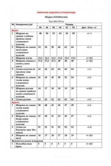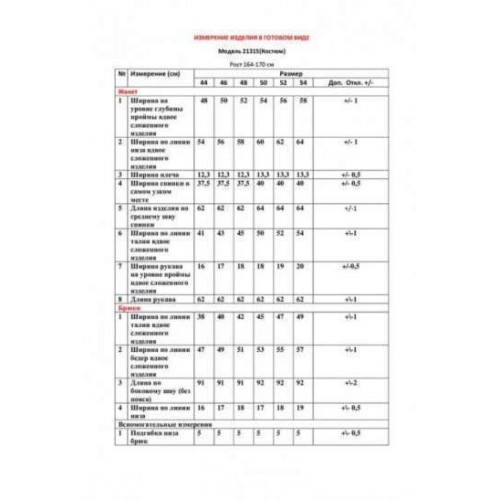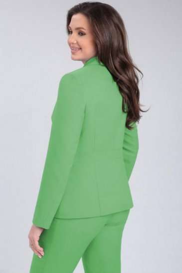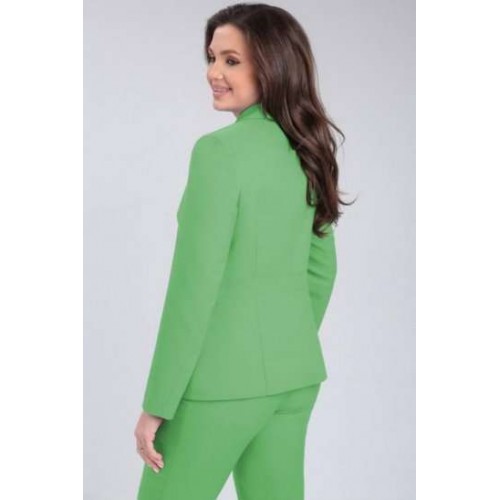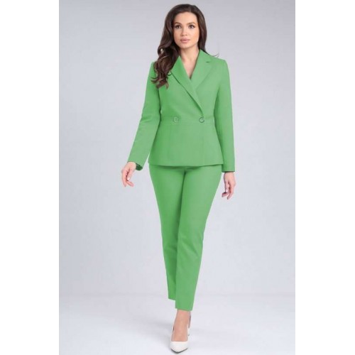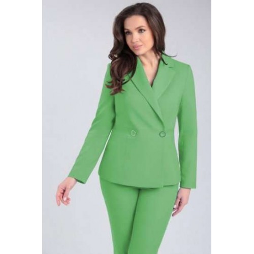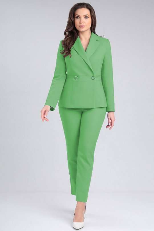 Комплект женский, состоящий из жакета и брюк. Жакет на фирменной подкладке, приталенного силуэта. По переду и спинке втачной пояс по талии и талиевые вытачки. Спинка со средним швом до пояса. Рукав втачной, двухшовный, длинный. Воротник - пиджачного типа, застежка центральная, двухбортная на 2 петли и пуговицы. Брюки заужены к низу, с функциональными карманами по переду. На притачном поясе со шлевками. Застежка на тесьму-молнию и обряжную пуговицу. По низу боковых швов небольшие разрезы.