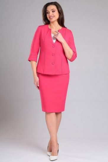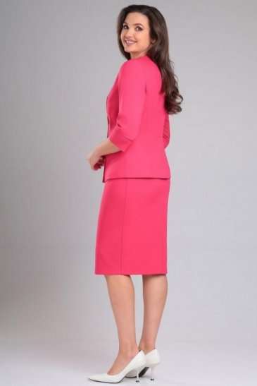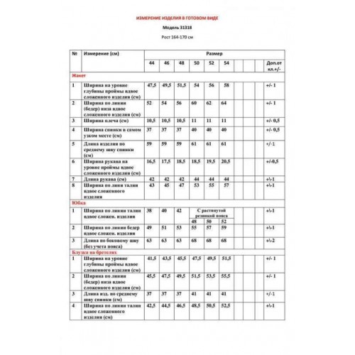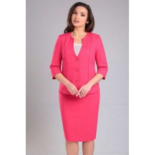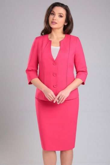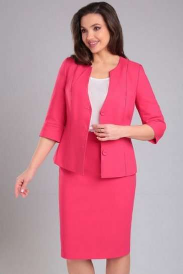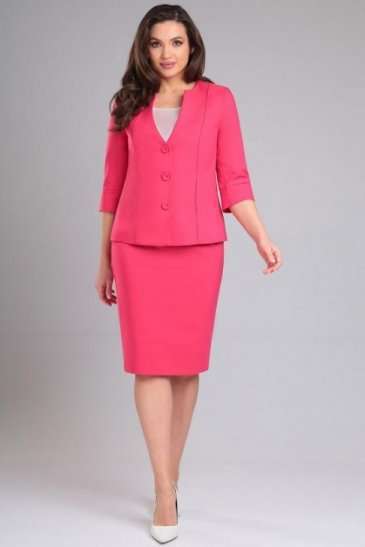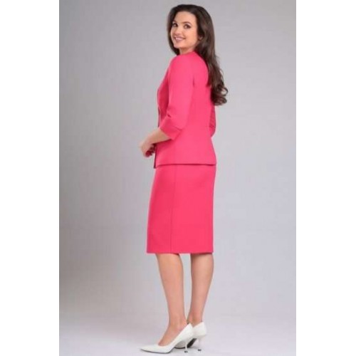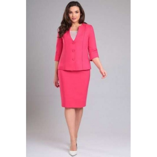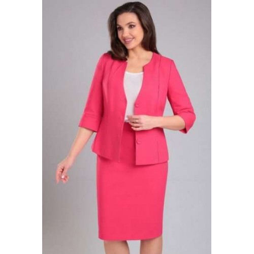 Комплект женский состоящий из жакета, юбки и трикотажного топа. Жакет на подкладке, приталенного силуэта, втачного покроя. По переду фигурные рельефы в виде встречных защипов. Спинка со средним швом и вертикальными рельефами из проймы. Вырез горловины фигурный. Застежка центральная бортовая на 3 обтяжные пуговицы и петли. Рукав двухшовный длиной ниже линии локтя с манжетой по низу, шов манжеты рукава оформлен встречными защипами. Юбка на подкладке, прямая, немного зауженная к низу, на прямом поясе, со шлицей. Застежка на потайную тесьму-молнию в среднем шве заднего полотнища. Топ из трикотажного полотна на узких регулируемых бретелях.